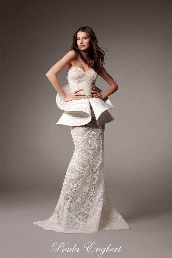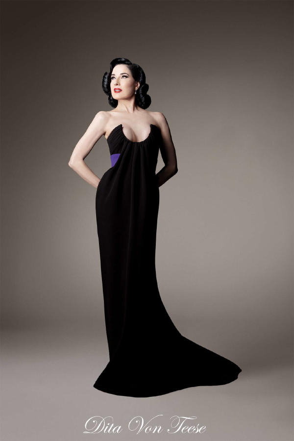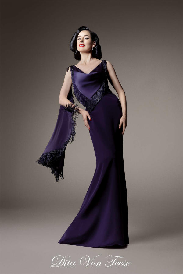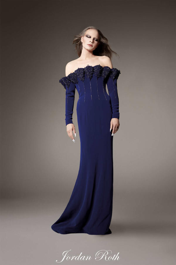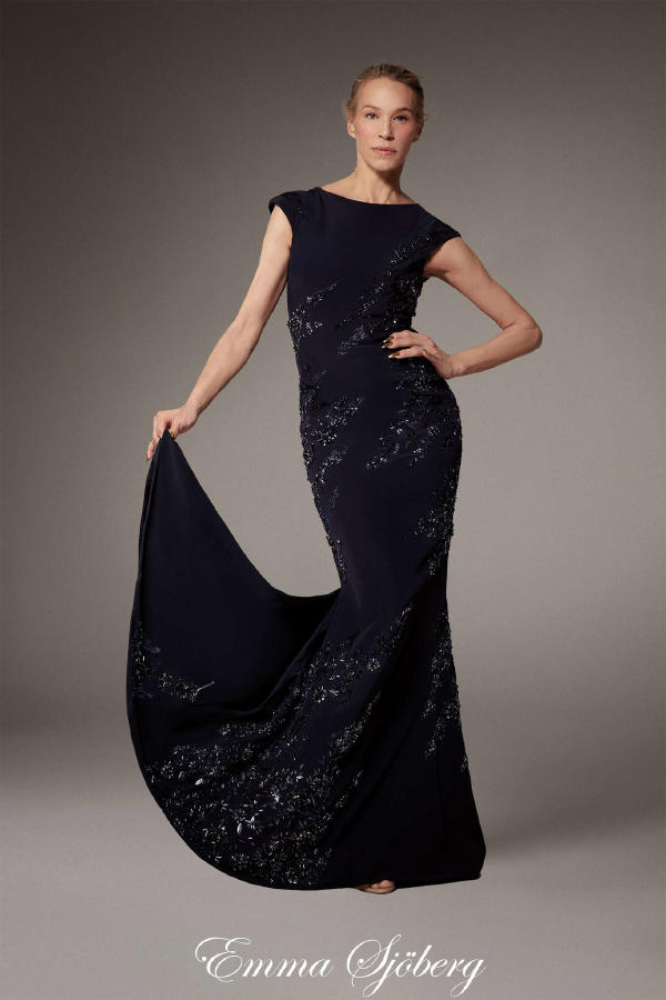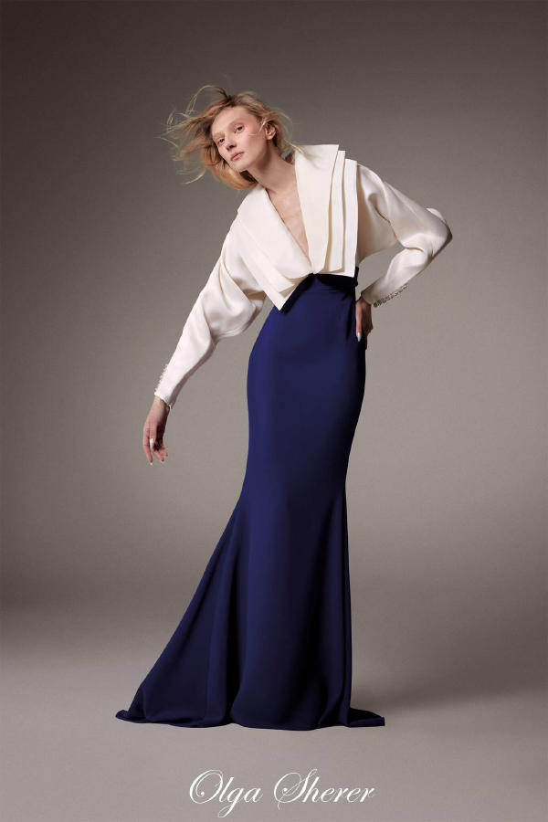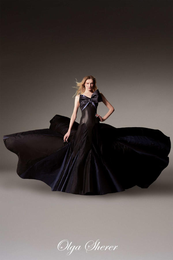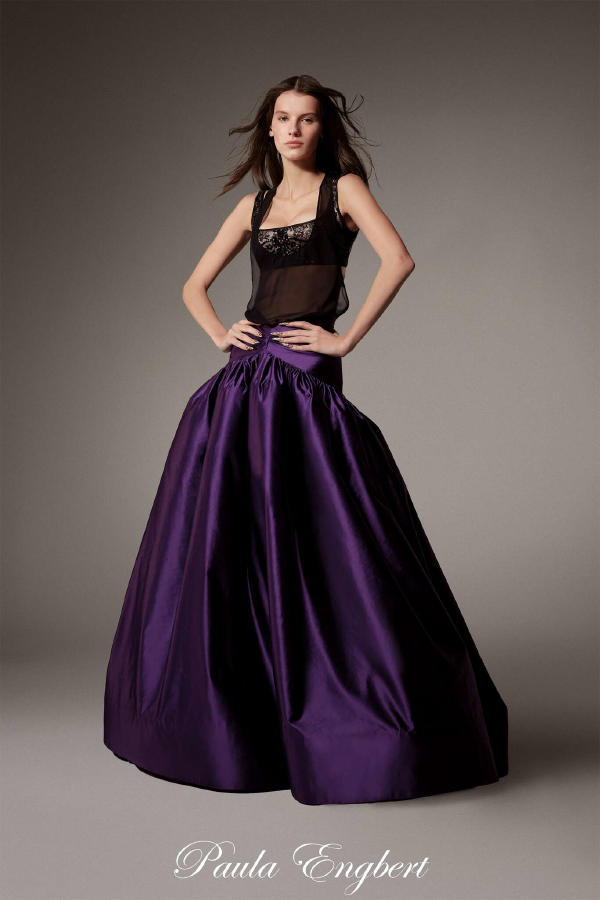 Fredrik Robertsson – Peacoat in navy leather satin with crystal buttons, with ostrich feather trim. Diala Makki – Long sheath dress in midnight-blue embroidered tulle, wrapped in royal blue satin ribbons. Olga Sherer – Gazar blouse in natural silk colour, featuring a layered collar and batwing sleeves. Worn with a long high-waisted sheath skirt in royal blue crepe mousse. Paula Engbert – Grand wrap gown crafted from white radzimir and lined with matching satin. Worn over a white tulle petticoat. Zita d’Hauteville – Long bustier sheath dress in royal blue crepe mousse with calissons incrusted with purple satin, slit to reveal a purple tulle and organza godet. Paula Engbert – Sheath dress in violet crepe with a bustier draped in a bow of matching duchess satin and lamé. Paula Engbert – Black chiffon tank top, worn over a black embroidered lace bralette. With a purple satin petticoat draped at the hips.