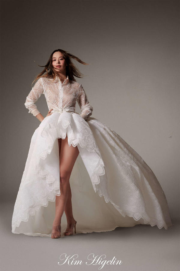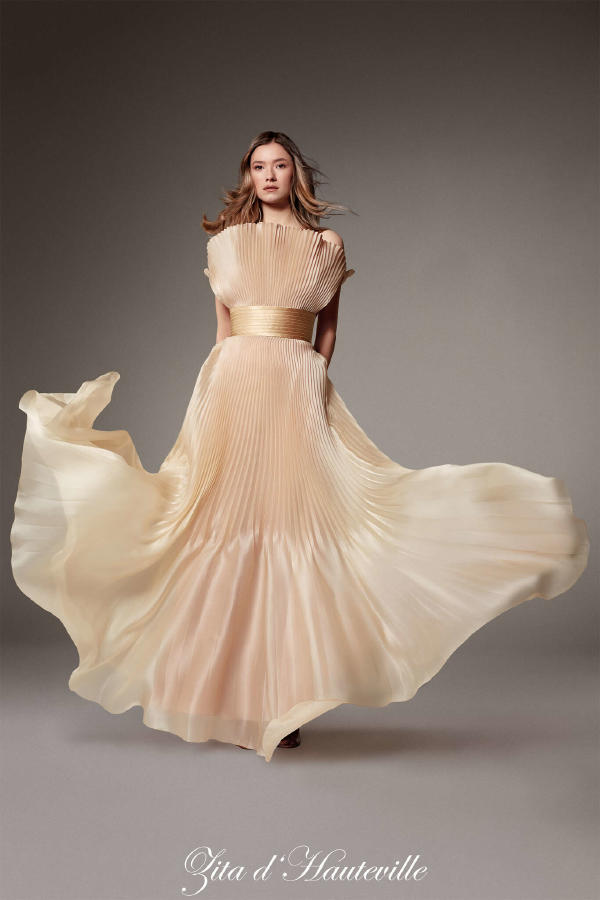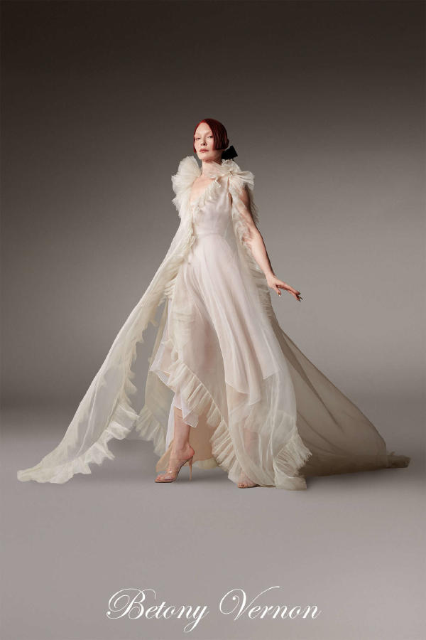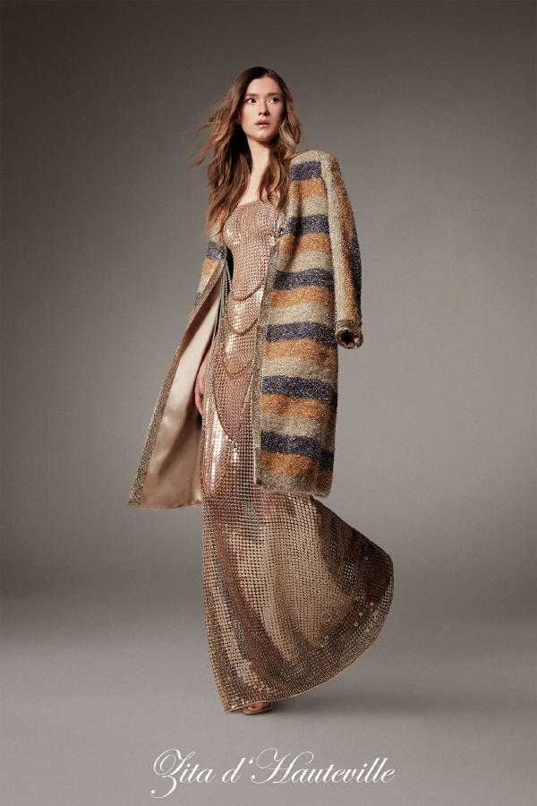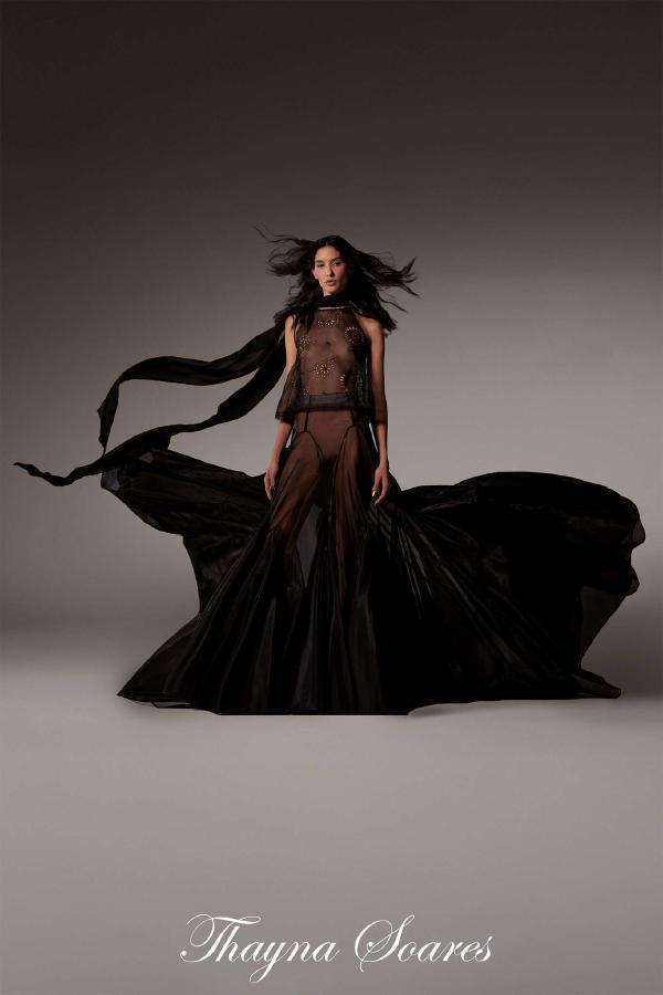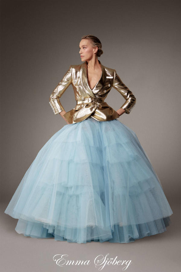 Paula Engbert – Long dress in black cassimere, deep neckline and large bow detail at the hips. Kim Higelin – White broderie anglaise shirt. Generous asymmetrical skirt in broderie anglaise on white organza. Elia Taïeb – White draped wrap-top in perforated embroidered organza and speckled veil, on a matching micro-petticoat. Thayna Soares – Black bolero in silk boutis. Evening bustier sheath in grey leopard brocade, with spots embroidered with stones and fur. Betony Vernon – Long dress in white silk organza handkerchiefs, pleated and fringed ruffles. Zita d’Hauteville – Long corset gown in sand-coloured sunray-pleated satin organza, featuring a fan-shaped neckline and a quilted satin belt. Zita d’Hauteville – Three-quarter coat in gold, silver, and gunmetal mohair lurex, held by necklaces. Worn over a long, golden sequined mesh sheath dress. Emma Sjöberg – Gold lamé tuxedo jacket with diamond buttons, belted. With a voluminous tulle petticoat in “ciel de Paris” blue.