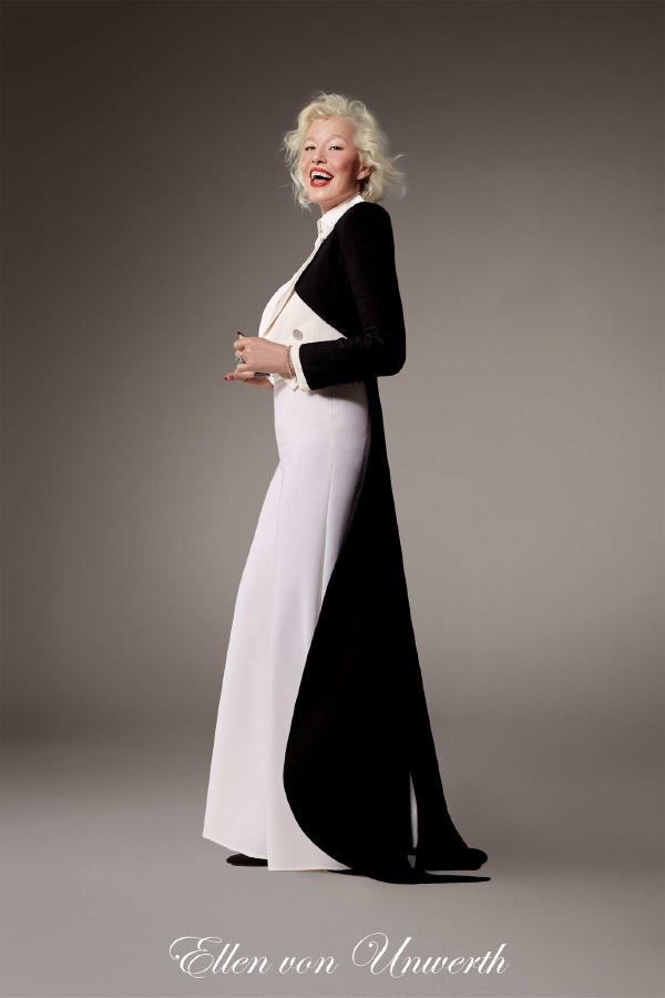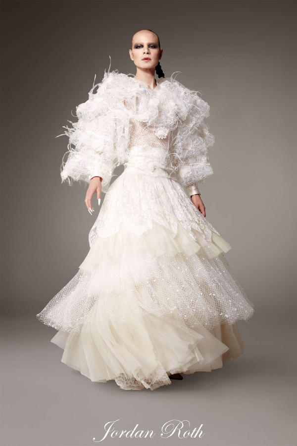 Description Look of Alexis Mabille Haute Couture SS25 / Spring Summer 2025 : Dita von Teese – Long bustier sheath dress in black crepe mousse, featuring a crescent-shaped neckline with draped pleats, cinched with violet satin. Ellen von Unwerth – Long tailcoat jacket in black princess crêpe, pleated and draped for a wavy effect. White silk crepe shirt. Long pants in white crepe. Marie-Agnès Gillot – Summer “fur” in pleated, frayed organza in black-to-white ombré. Worn over a long dress in black organza. Jordan Roth – Large sweatshirt with neckline and sleeves in mesh, lace and hair, with lace flowers and ostrich feathers in white, cream and ivory tones. Worn with a wide, swingy skirt in pleated organza with lace and mesh inlay in various shades of white. Olga Sherer – Long sheath dress, crafted from natural silk-coloured crepe and veiled with pearlescent beaded tulle, featuring a matching quilted satin “volutes” collar. Paula Engbert – Long sheath dress in white Lyon lace with cordonnet outline embroidery, featuring a quilted satin “volutes” belt in natural silk colour. Audrey Marnay – Ivory radzimir shirt with a great pleated collar, belted. With a matching tulle petticoat.