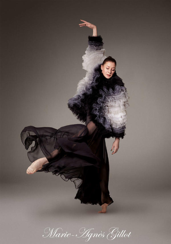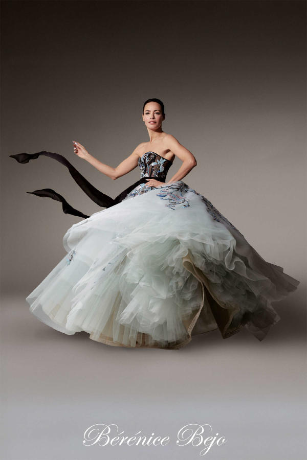 Bérénice Bejo – Sweetheart bustier dress in black tulle embroidered with multicoloured flowers, featuring a voluminous dust-colored tulle petticoat with matching embroidery. Black chiffon belt. Vanessa Filho – Double-breasted smoking jacket worn as a dress, in black wool faille with satin collar and ostrich feather trim. Paula Engbert – Long sheath dress with a plastron front in black crepe mousse, featuring double crystal-button fastening and a black satin belt. Max Sokolinski – Long tuxedo coat in black Moroccan crêpe with long slit sleeves. Ample shirt-dress in white organza with scarf collar trimmed in frayed pleats embroidered with white raffia flowers. Thayna Soares – Embroidered and openwork black organza top. Ample godet skirt in black hair.Robert Carsen – Great smoking cape in black dry wool with a matching satin reverse.