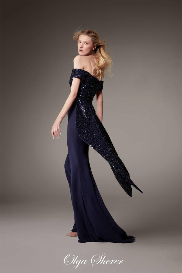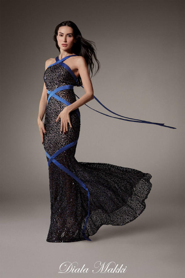 At Alexis Mabille Haute Couture Spring Summer 2025, Tina Leung – “Disc” coat in quilted glacier-blue duchesse satin. Worn over a lace body-corset. Olga Sherer – Bustier sheath dress in midnight-blue crepe mousse, with a V-neckline trimmed with gold ribbon; worn over a sky-blue sunray-pleated organza petticoat. Jordan Roth – Royal blue sheath in crêpe, corolla neckline embroidered with iridescent rocaille petals. Dita von Teese – Long sheath dress, crafted from purple ink-coloured crepe, with a cowl–shawl neckline edged with matching rocailles fringes. Olga Sherer – Long bustier dress with a big bow and ample tiered skirt of taffeta in changing shades of black, blue, grey. Olga Sherer – Long “tailcoat” corset sheath dress in midnight-blue embroidered tulle, skirt in midnight-blue lurex and chiffon overlay. Emma Sjöberg – Midnight blue crepe sheath dress with tone-on-tone embroidery.