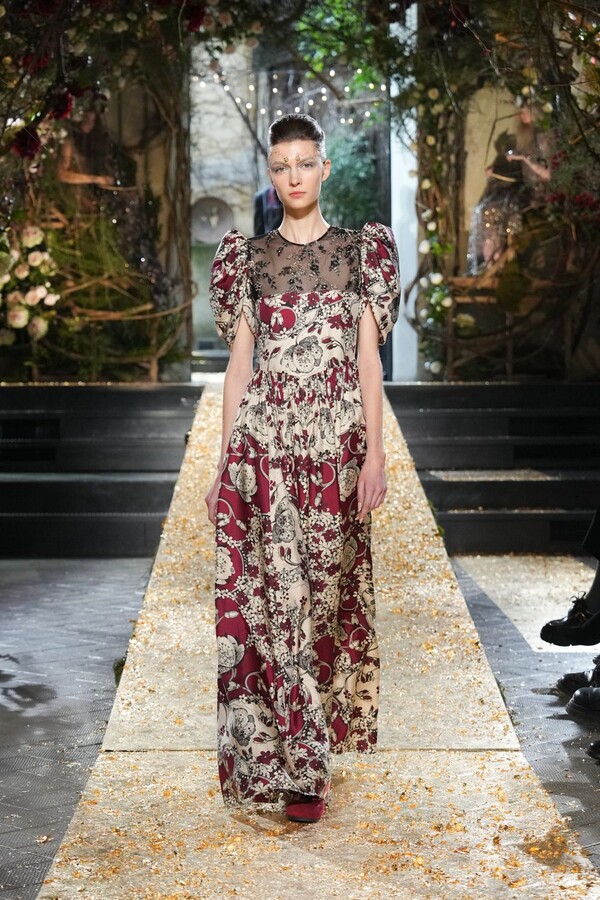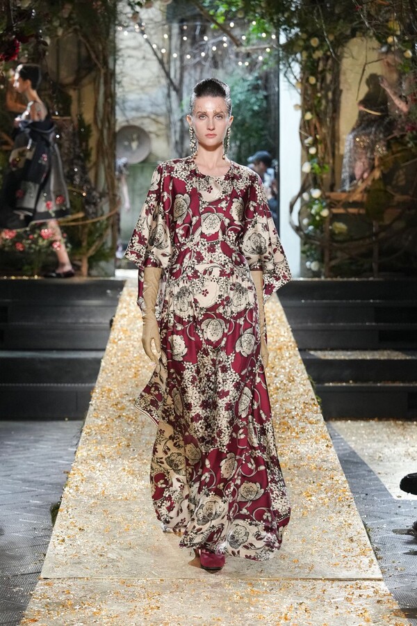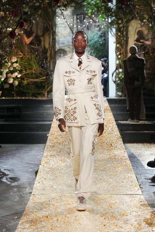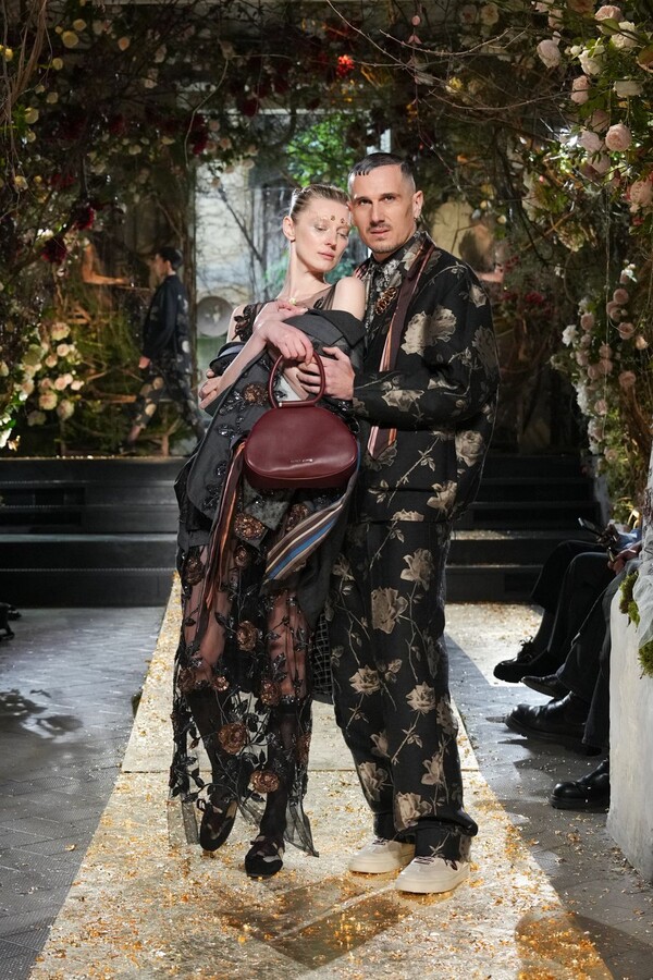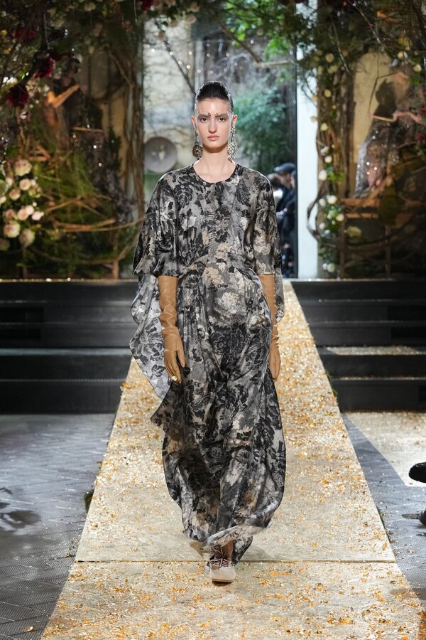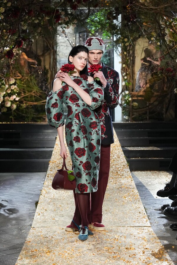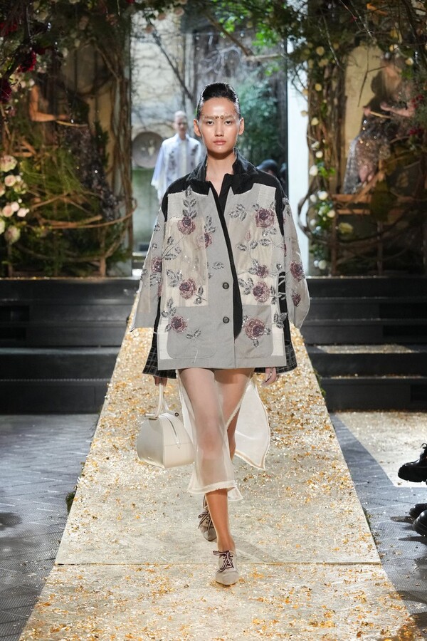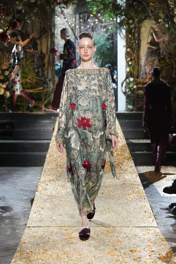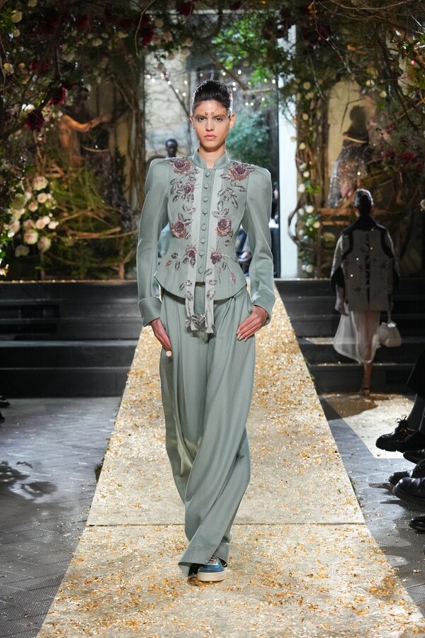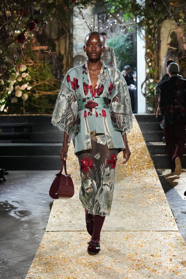 Marras has always been a master of the “harmonious contrast,” and this season is no exception. The runway reveals a deliberate tension between the ethereal and the structured. Weightless sage-green silk tunics float beneath veils of delicate lace, while tailored jackets featuring traditional masculine motifs are reimagined with grey-gold filaments. The color palette feels unearthed from a Mediterranean landscape after a storm. Hints of carmine red and burgundy climb like roses across ecrù backgrounds, while deep teals and earthy browns ground the more avant-garde silhouettes.