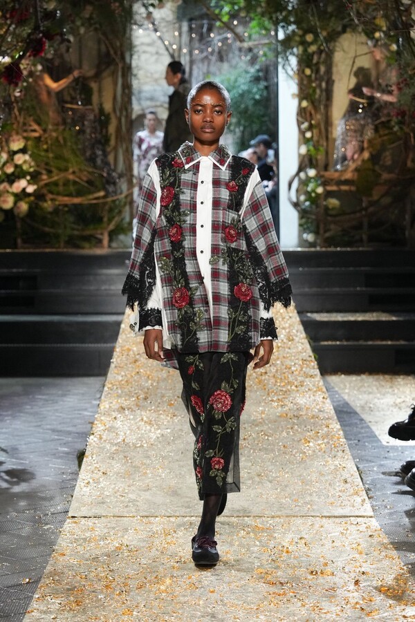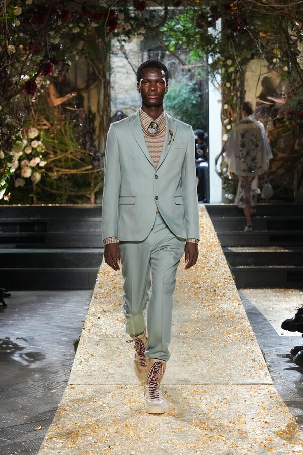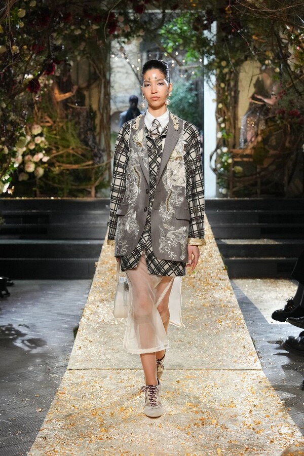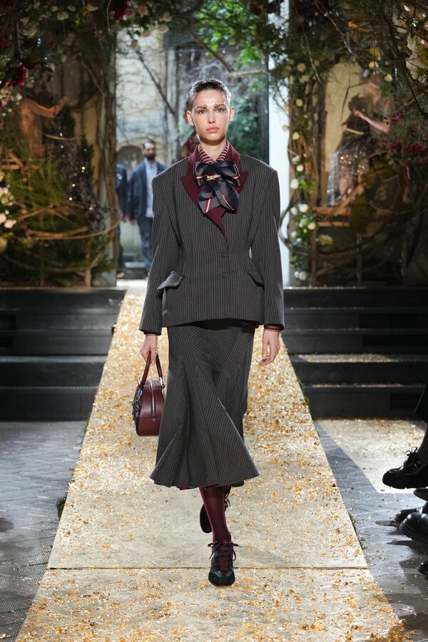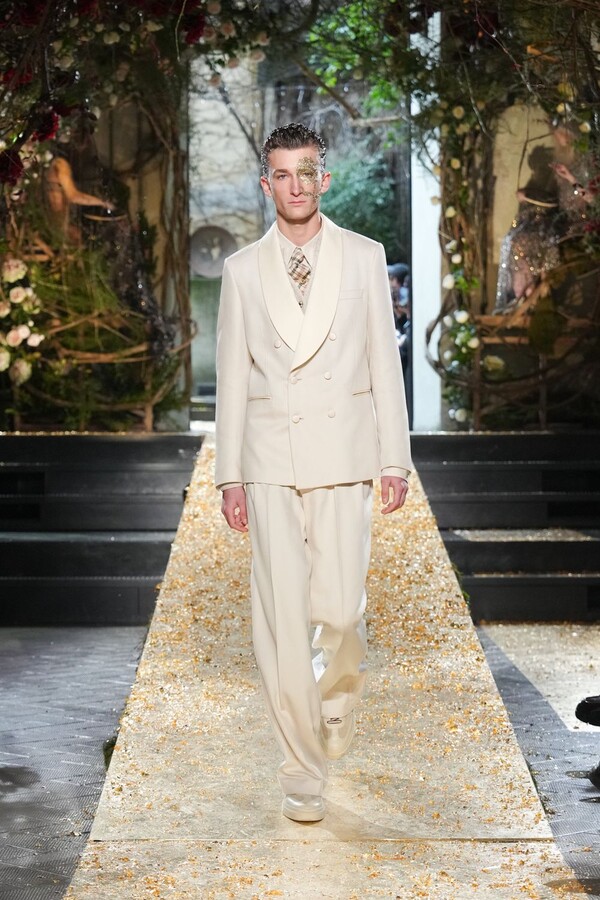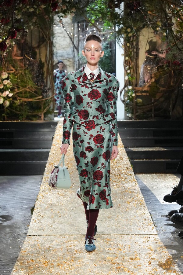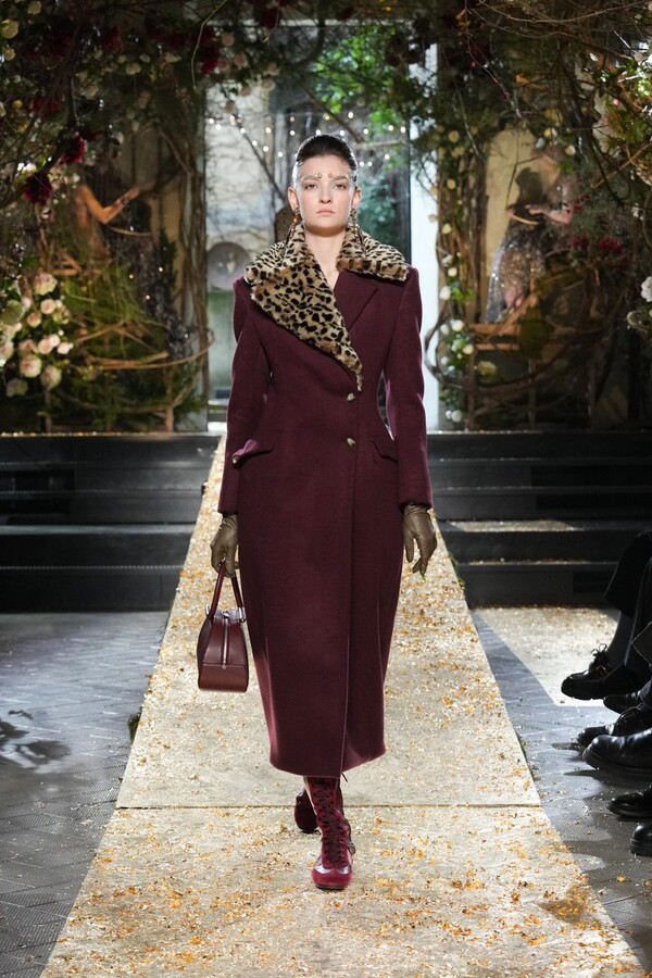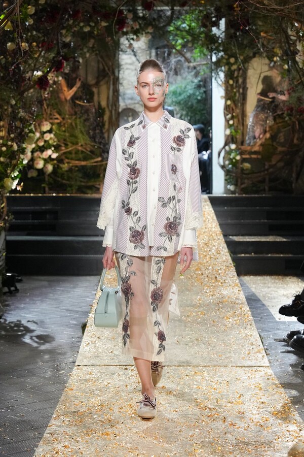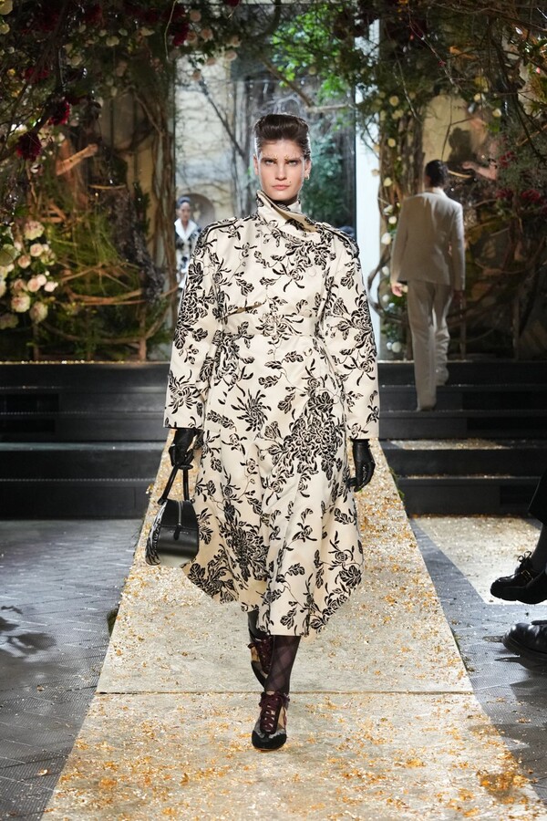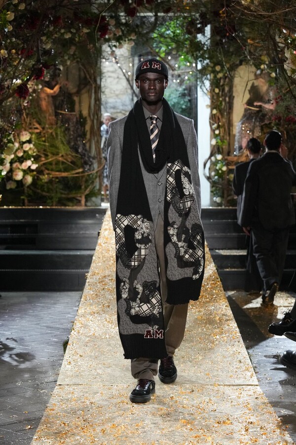 Marras has always been a master of the “harmonious contrast,” and this season is no exception. The runway reveals a deliberate tension between the ethereal and the structured. Weightless sage-green silk tunics float beneath veils of delicate lace, while tailored jackets featuring traditional masculine motifs are reimagined with grey-gold filaments. The color palette feels unearthed from a Mediterranean landscape after a storm. Hints of carmine red and burgundy climb like roses across ecrù backgrounds, while deep teals and earthy browns ground the more avant-garde silhouettes.