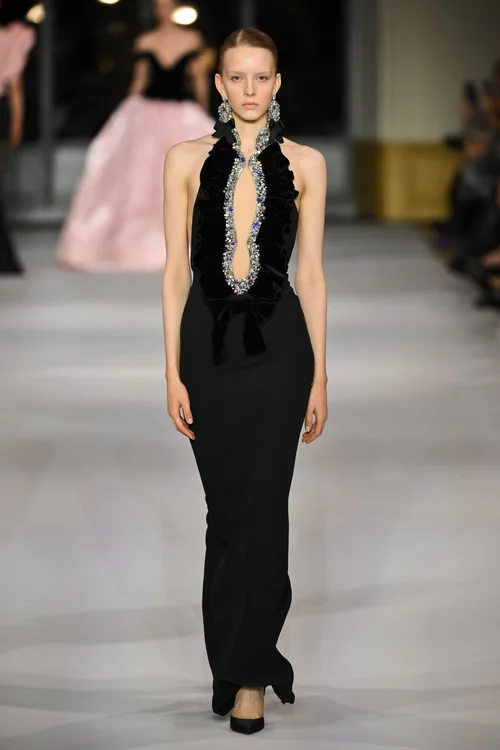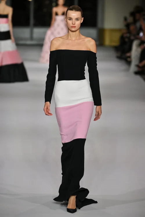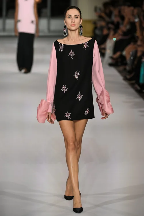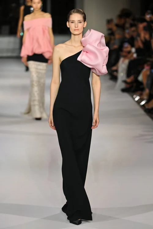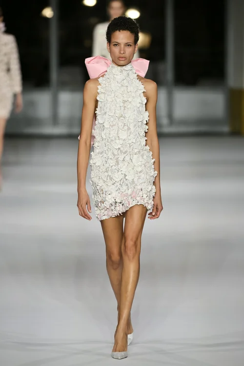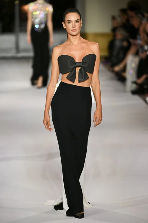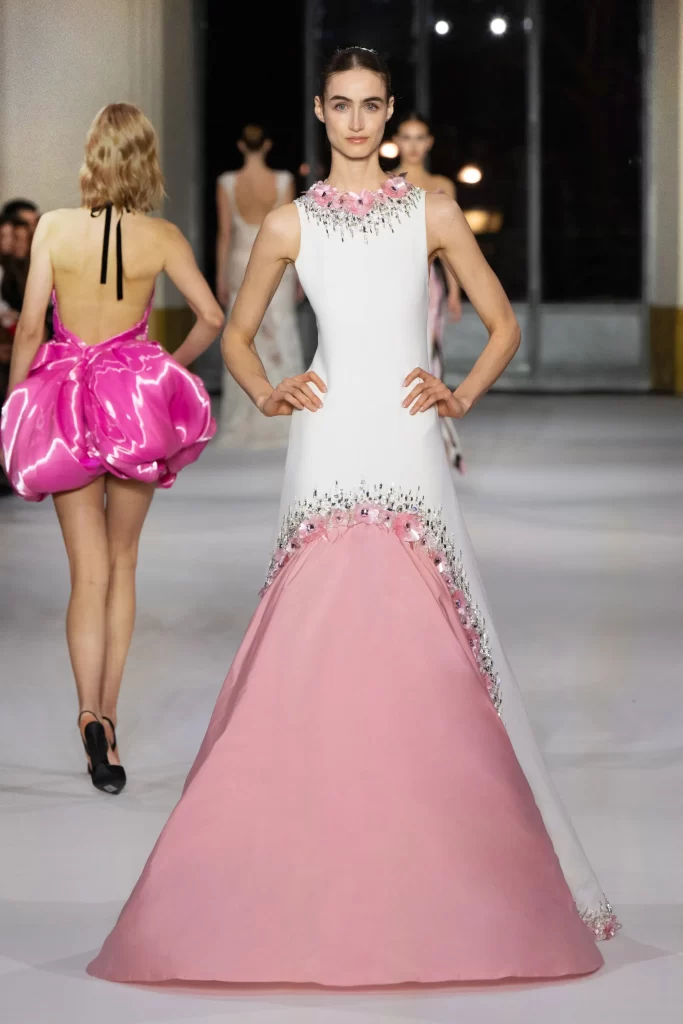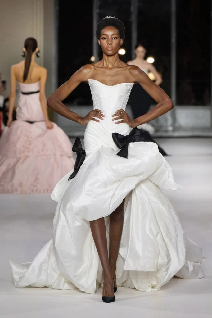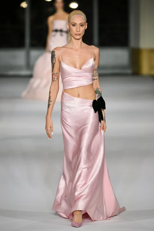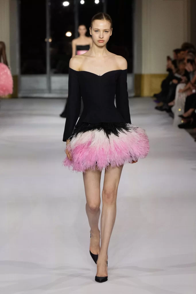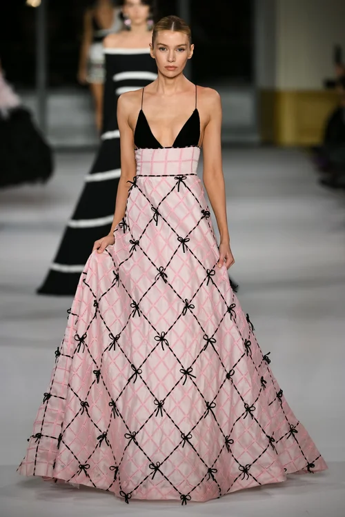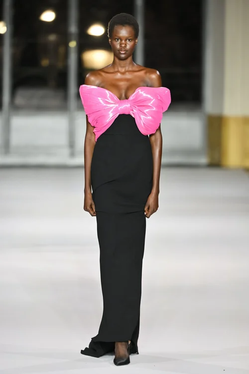and sweeping gowns are adorned with oversized bows and delicate ribbons, while trompe l’oeil details and handmade embroidery evoke a sense of whimsical artistry, transforming garments into wearable art designed to accentuate the feminine figure. In this collection, their distinct appearance and graceful demeanor find a whimsical balance swaying through pink sunsets and sparkling summer nights, creating a sense of escape and paradise. Layers of voluminous fabrics mimic their delicate plumage, while fitted silhouettes and sharp tailoring reflect its sleek, poised form, enhanced by dramatic bows that cascade into movement. The infusion of pink—ranging from blush to fuchsia—stands as a tribute to the audacious beauty of life, offset by the striking sophistication of black and the purity of white.