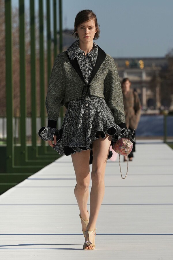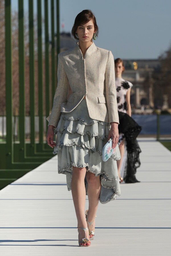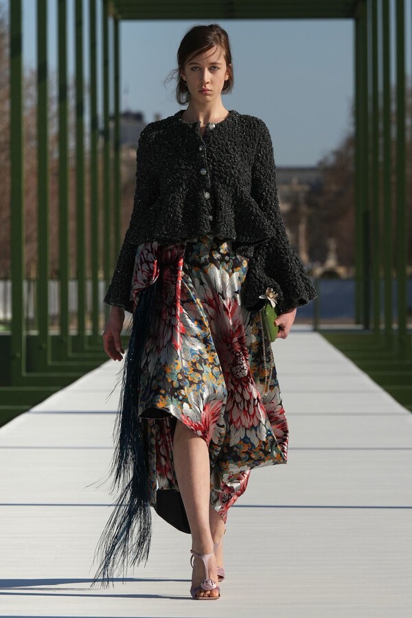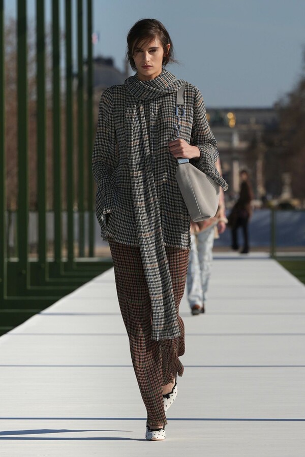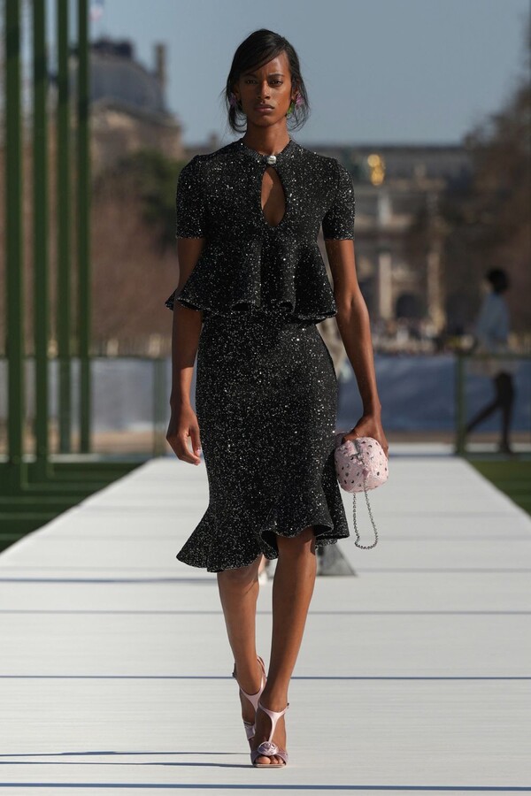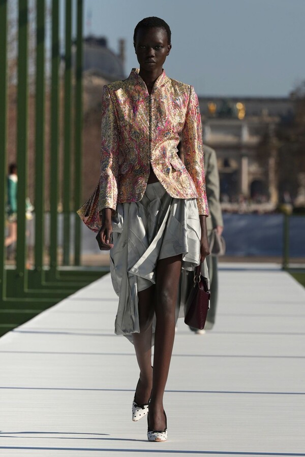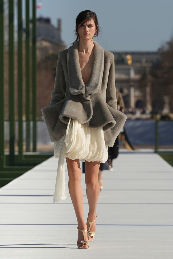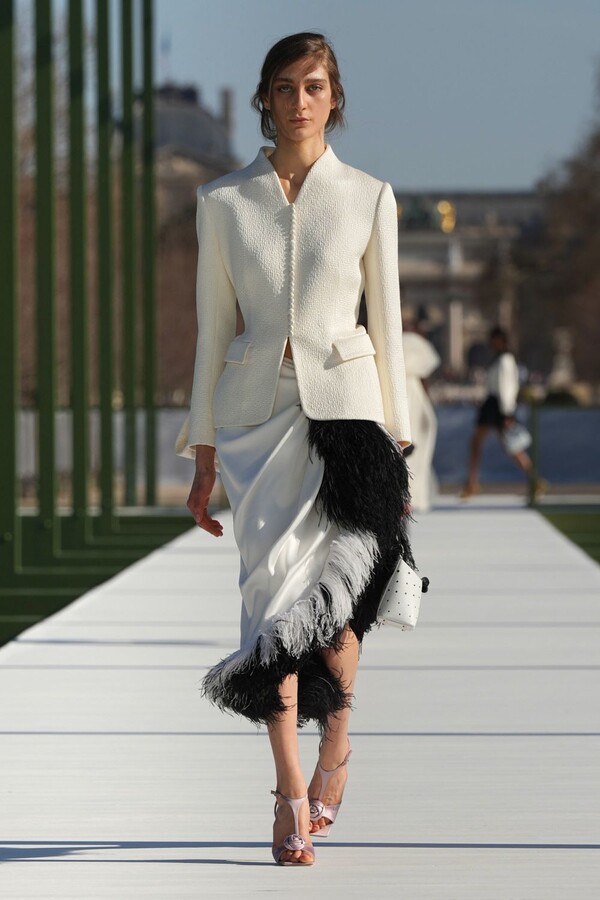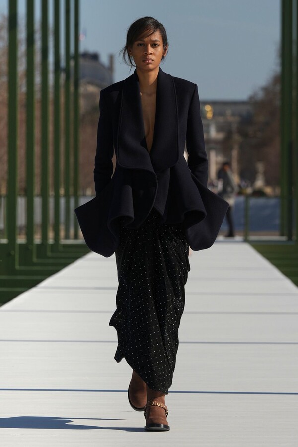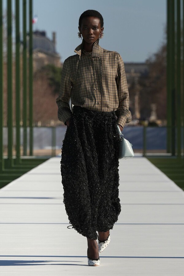 The skirts were a revelation. Tiered constructions in silk organza and gingham alternated with lean column silhouettes in double-faced wool. Several arrived with subtle volume — not the theatrical exaggeration of recent baroque revivals, but a whispered conversation with the Bar suit’s original vocabulary. Volume that implies, rather than insists.