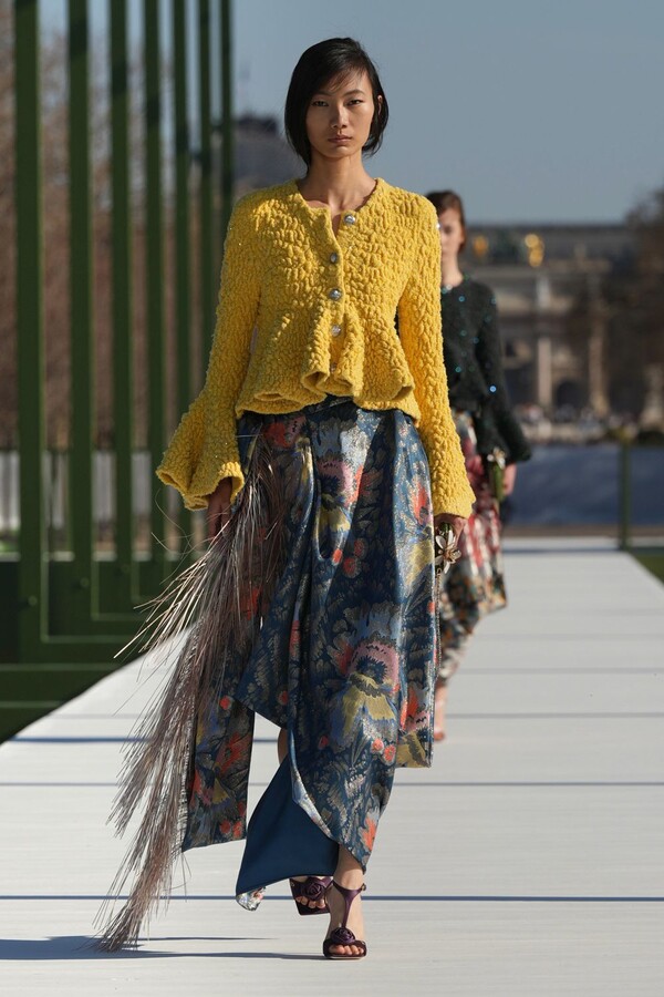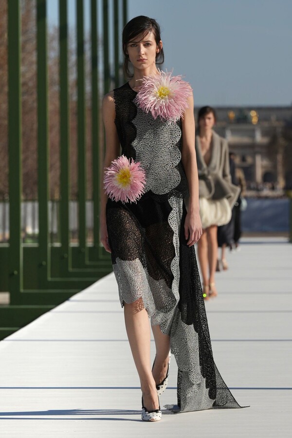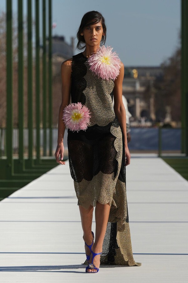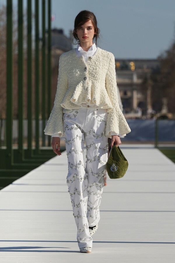 Embroidery — always a Dior signature — reached a new pitch of ambition. Wildflower and floral motifs cascaded across a black velvet coat, their execution so precise and dense as to be almost hallucinatory up close. A cream crêpe midi dress bore a single embroidered motif along the hem: a pomegranate, split open, seeds glistening in French knots. Symbolic, lush, oddly affecting.