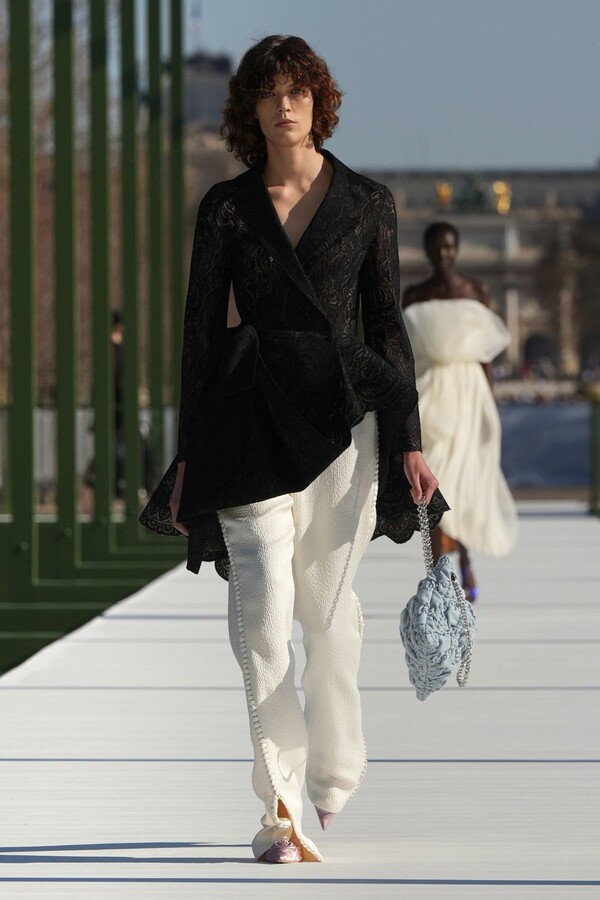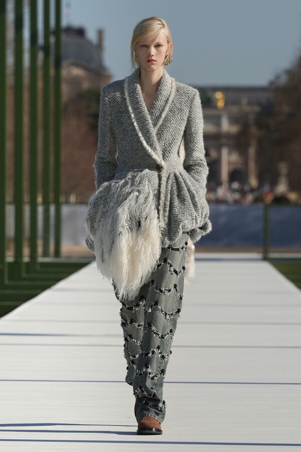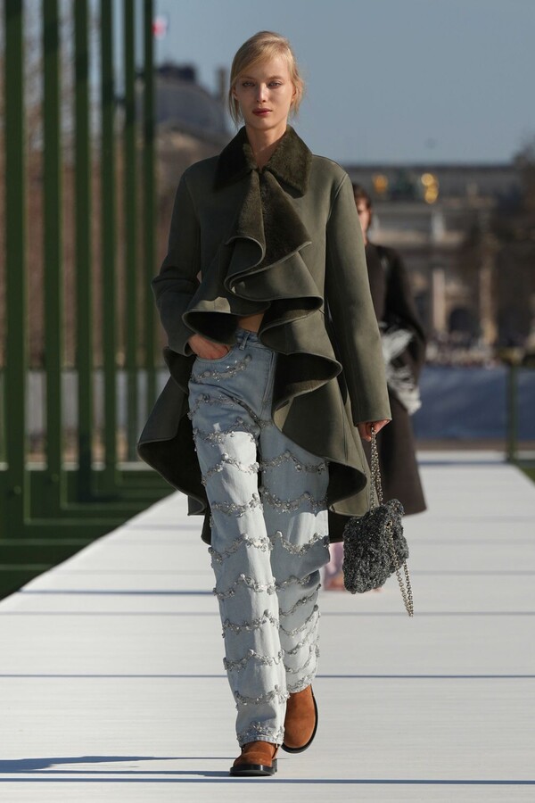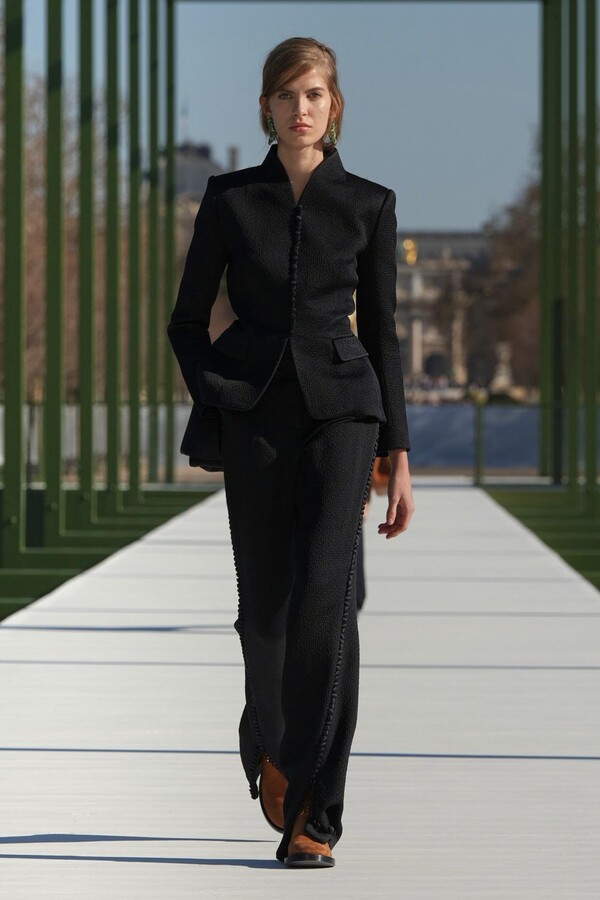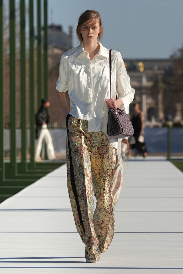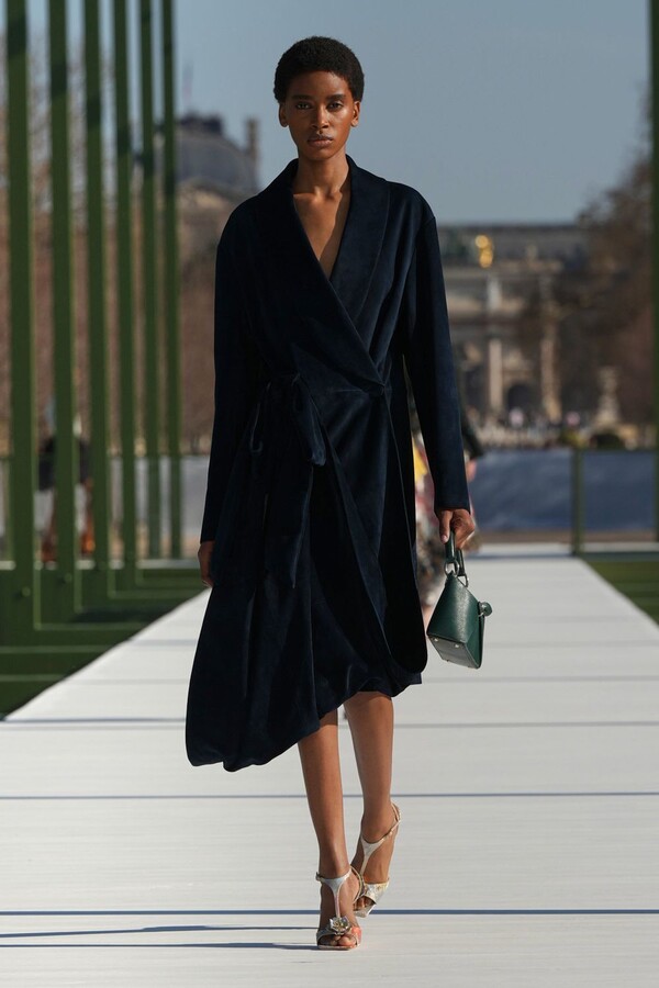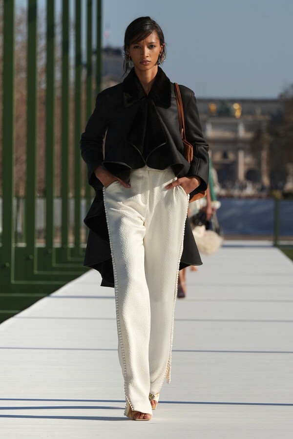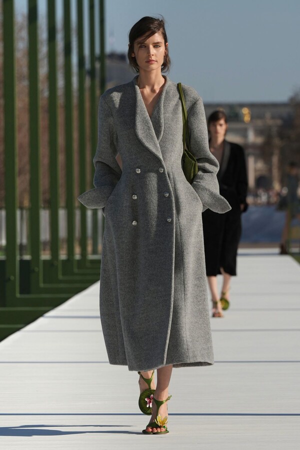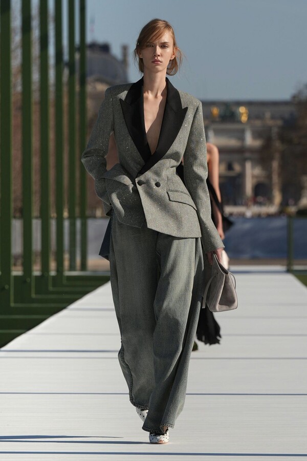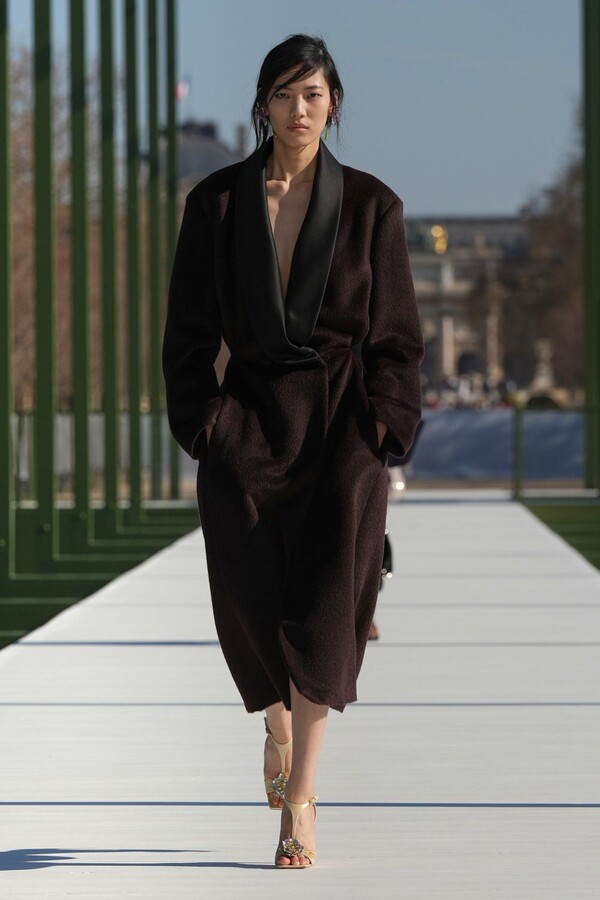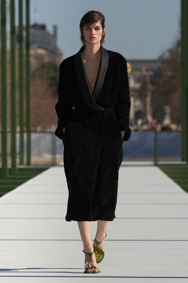 Anderson sculpted the shoulder differently this season — rounding it, softening the aggressive geometry that has dominated recent collections across the industry. His jackets fell longer, their proportions borrowed from frock coats and riding habits, but modernised through generous volume in the sleeve and a particular attention to how fabric falls rather than how it stands. Worn open over wide-leg trousers in habutai silk, they moved with the carelessness of morning robes — clothes that suggest a woman dressed for herself first.