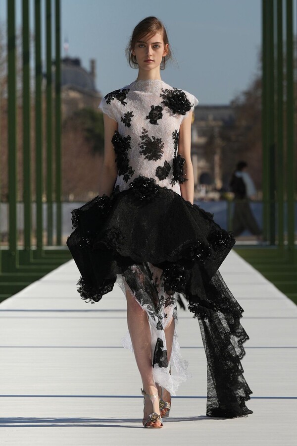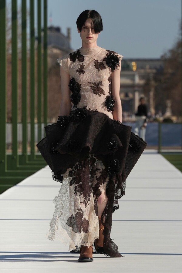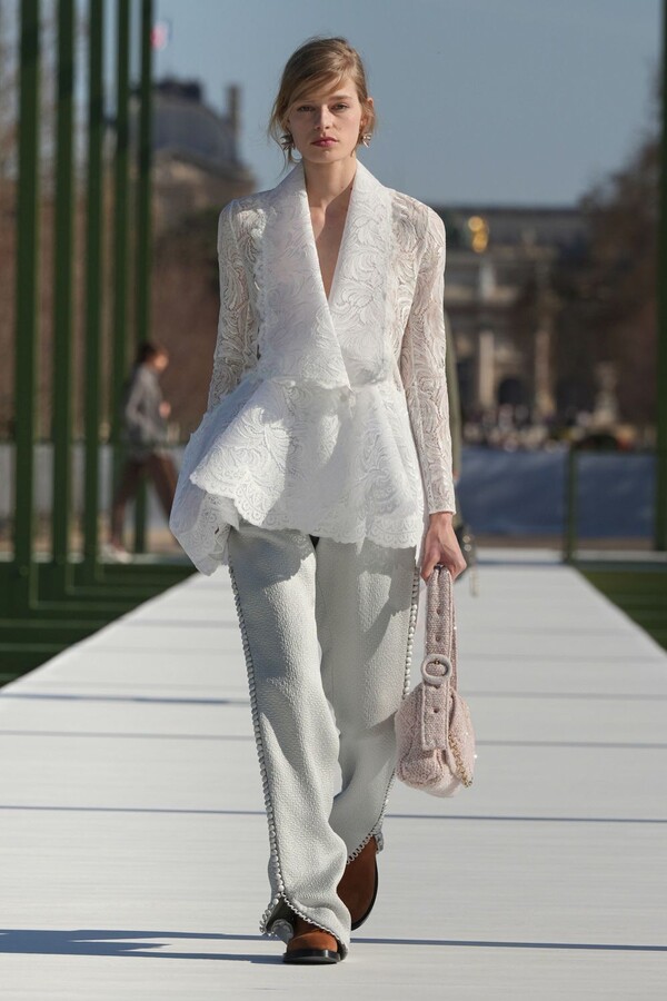 References in fashion are only interesting when they’re absorbed rather than quoted. Anderson absorbed. The shadow of Christian Dior’s Corolle line fell across the collection without turning it nostalgic — these clothes did not want to live in 1947. They wanted to walk to dinner in 2026 with authority. Chantilly lace returned not as decoration but as structure, its patterns echoed in laser-cut neoprene, its delicacy translated into something altogether more contemporary. A Bar jacket in ivory silk faille, reimagined with abbreviated proportions and layered over embroidered mini-crinis, wore its history with pride and without apology.