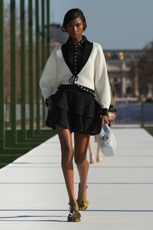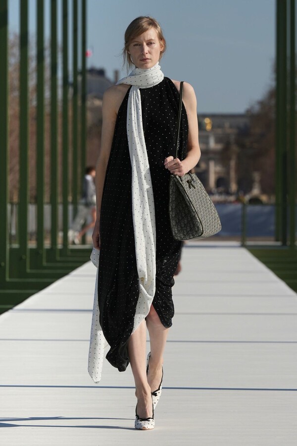 Knitwear appeared as counterweight: dense, tactile, almost medieval in texture, but draped with the ease of a shawl. A cabled turtleneck layered beneath a transparent organza skirt became one of the most effortlessly wearable moments in recent Dior memory. Warmth, fragility, contradiction — dressed in a single look.