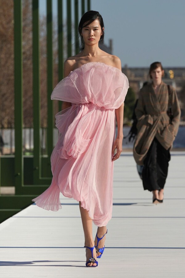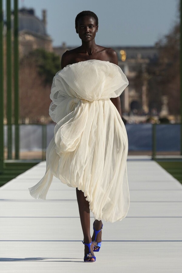 As the final model emerged — a long column of pleated ivory silk that caught the light with the simple, devastating grace of water — the applause arrived before the music faded.