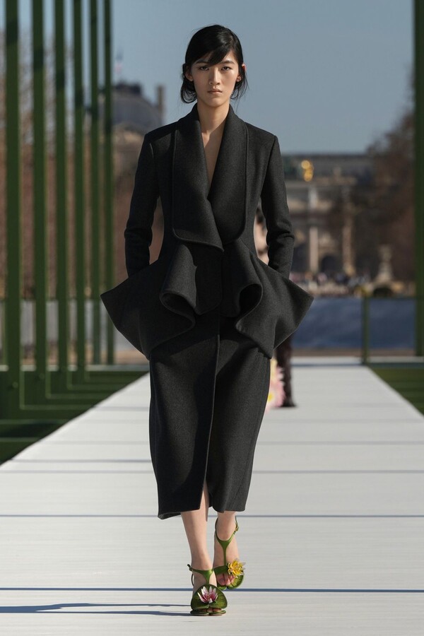 What followed was a collection of remarkable tonal restraint. The palette moved through the spectrum of a winter garden at dusk: muted celadon, tarnished champagne, the bruised violet of dried lavender, warm charcoal anchored by sudden, deliberate flashes of lacquer red. Nothing shrieked. Everything resonated.
