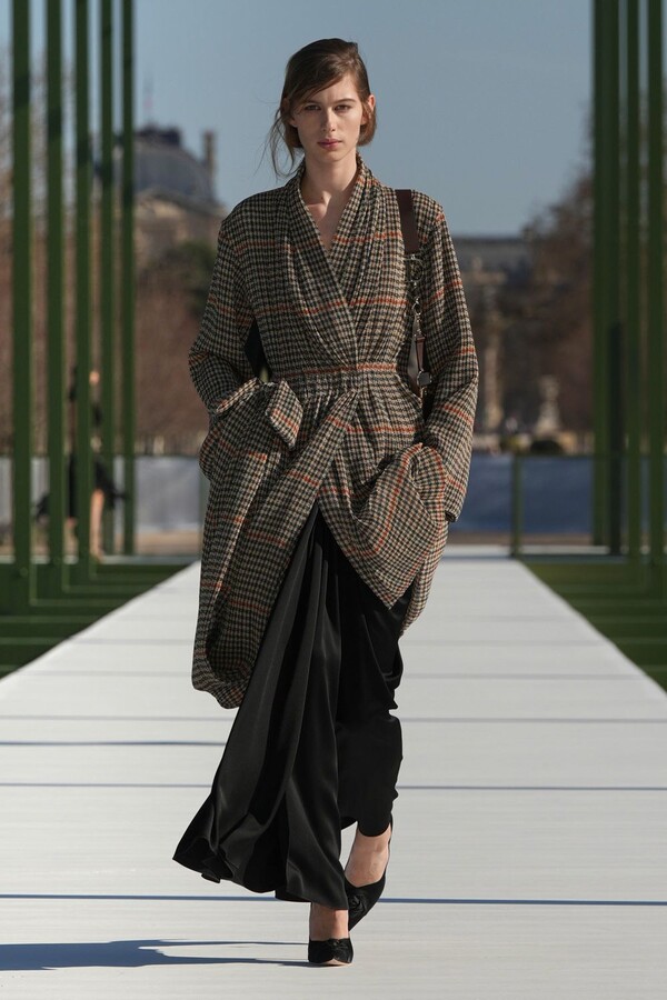 No serious collection today exists without it — the acknowledgment that beautiful clothes must also live. A series of looks mid-show loosened the rhetoric considerably: straight-cut trousers in a fine Prince of Wales check worn with a simple cashmere crewneck and a single statement belt; a fluid wrap coat in camel wool that asked nothing of its wearer except movement; tailored shirt-dresses in silk charmeuse that recalled the ease of the wrap dress while retaining a structural backbone. Entry points, dressed as equal partners to the spectacle.