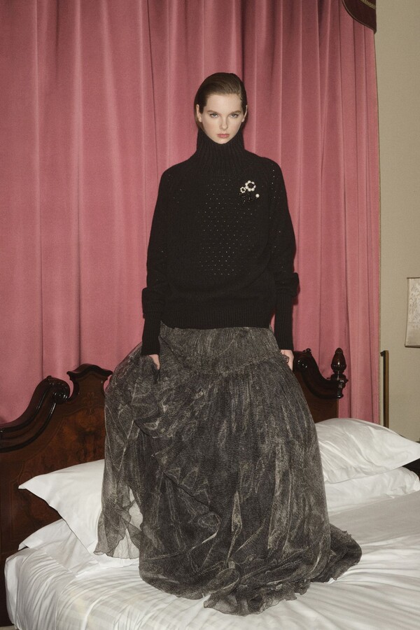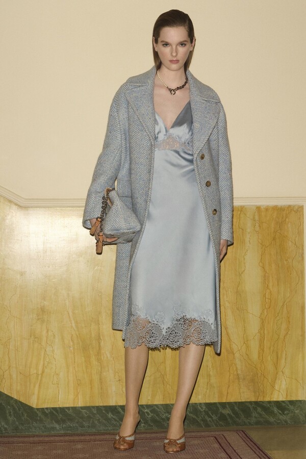 This tension between enveloping softness and materials with a lived-in intimacy evokes the world of underpinnings and the private sphere. It translates the ease and assuredness of personal attire into an outerwear wardrobe. Refined workmanship defines the collection’s identity. Embroidery, experimentation, and artisanal interventions give depth and complexity to surfaces. Rebrodé lace, sculpted as much as embroidered, takes on the dimensionality of bas-relief and sometimes blends with fur; silk satin retains its luminosity, yet through a special double construction lends mini skirts the precise bloom of a corolla; knitwear merges seamlessly with lingerie codes.