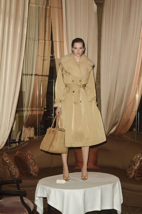 The bags reprise the season’s key materials: vintage shearling, long-haired suede, and polished crocodile flanks, shaped with clean lines and meticulous craftsmanship. Footwear follows the same direction: mules and pumps feature swallow-tail brogue perforations; boots alternate stretch nappa with lace appliqué and shaded shearling; sneakers combine airy furs with suede printed to resemble denim.