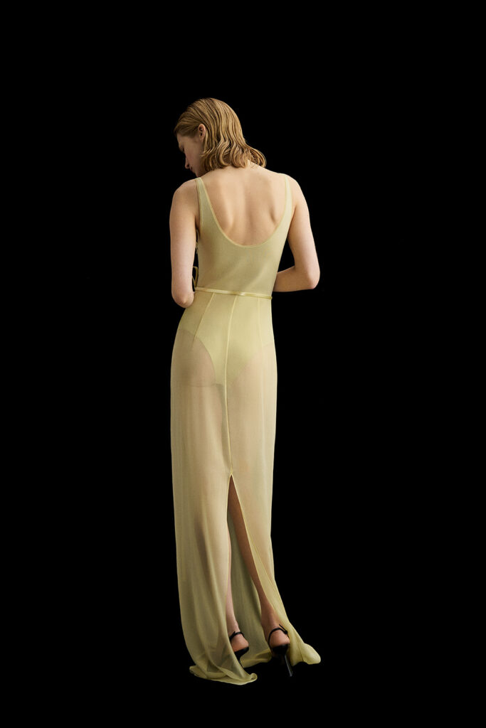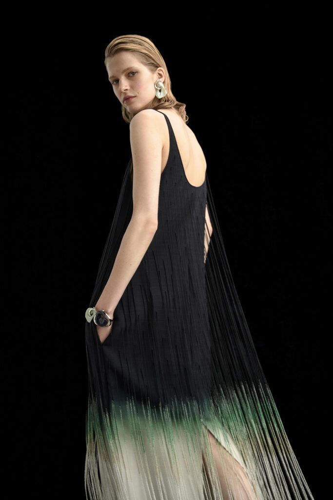 Fine fringes flow like gradient threads shaded in onyx and jade, always adorned with microcrystals. The collection alternates between stillness, movement, and dimensionality, much like the painterly visions of the finest gardens. Wendy Golden’s monofilament baskets inspire the textures of viscose and silk knitwear, partially blended with Lycra and finished with metallic threads to heighten their sculptural essence. These garments echo the fluidity of mobile columns in their length. Dresses with invisible bustiers are rendered in soft pebble tones, sublimated by shades of gray agate. Some fabrics resemble wisps of cloud, carded and feathered in effect. Leather, as thin as silk, expresses a sensuality that transcends attitude, season, and temperature.