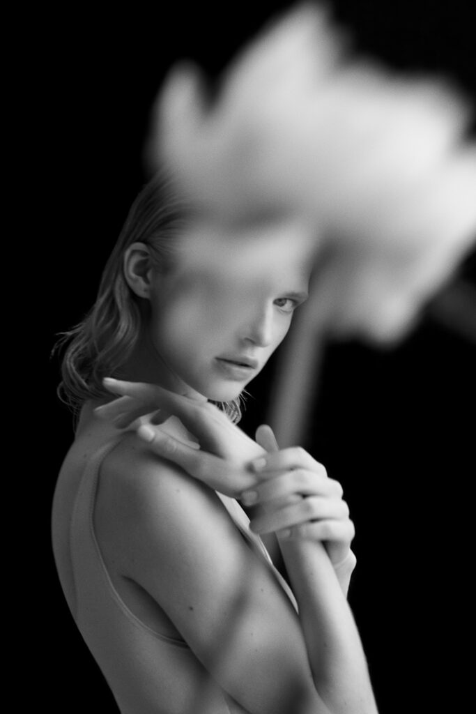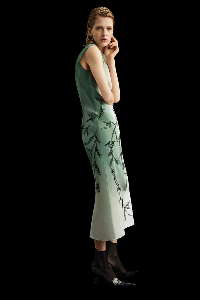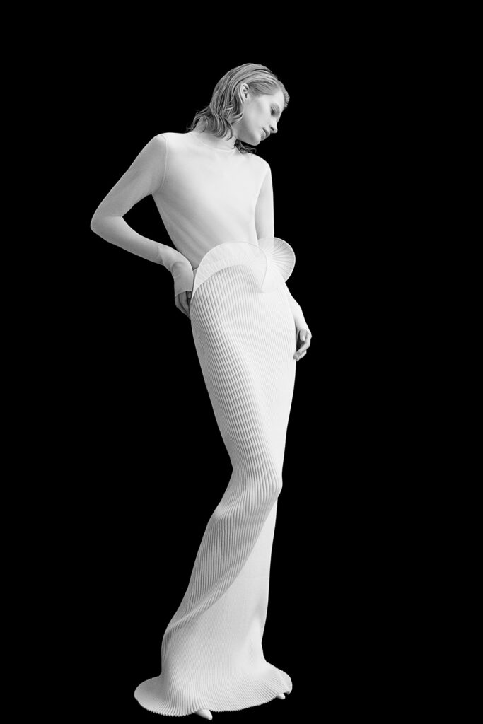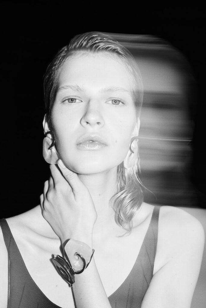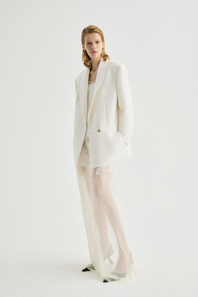 The irregular and emotional stroke of ink sketches petals and leaves for prints, embroideries, and intricate fabrications. Invisible raffia over chiffon creates devoré effects born of a patient artisanal technique of material subtraction. Peony ramages whisper elegant echoes – layering over sheer white dresses and flowing through radiant, slender silhouettes, embroidered in white-on-white or stark black-on-white contrasts. These floral memories morph into geometric volumes, shaping resin necklaces and brooches – rounded, organic pieces for women who appreciate hand-worked, sculptural materials.
