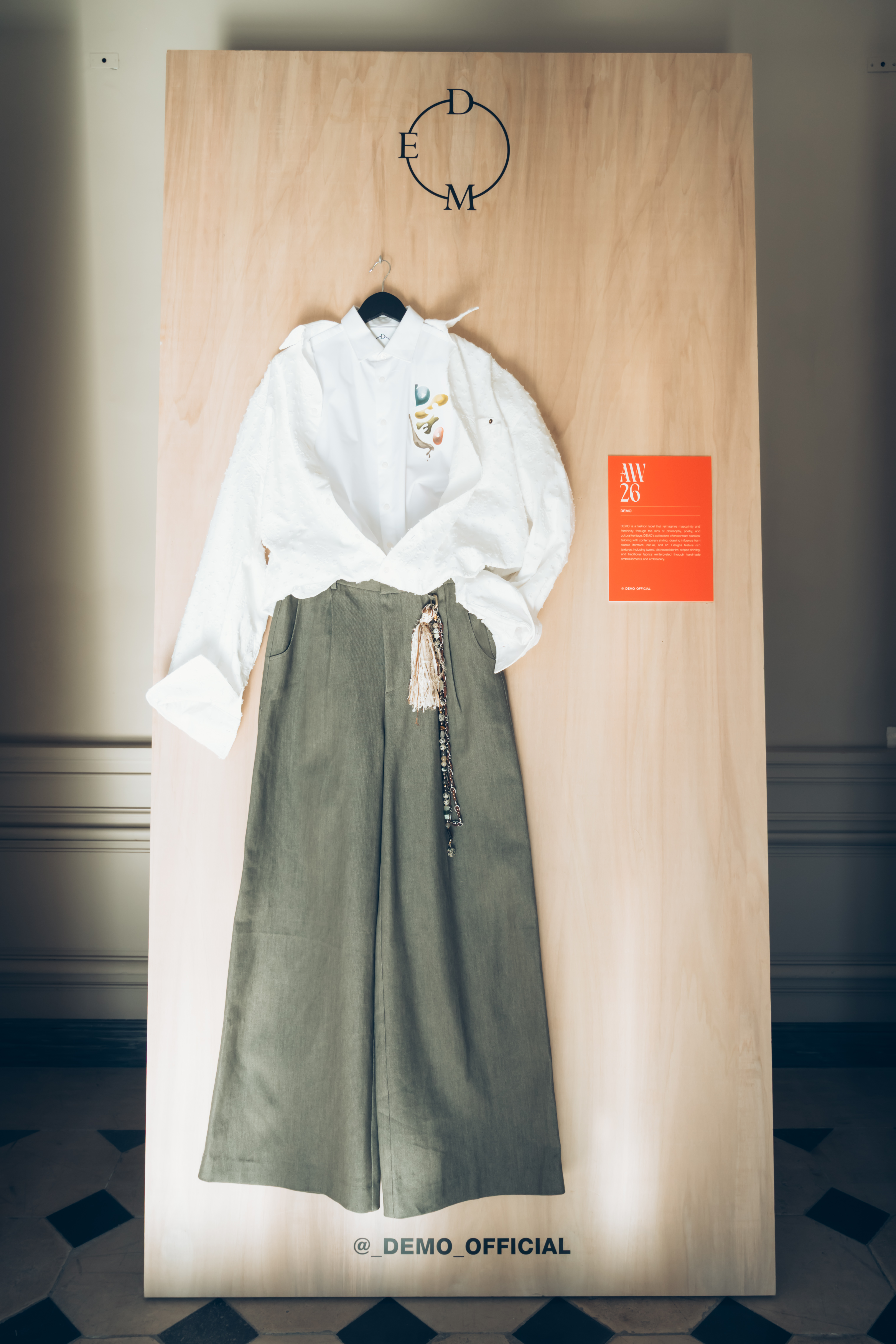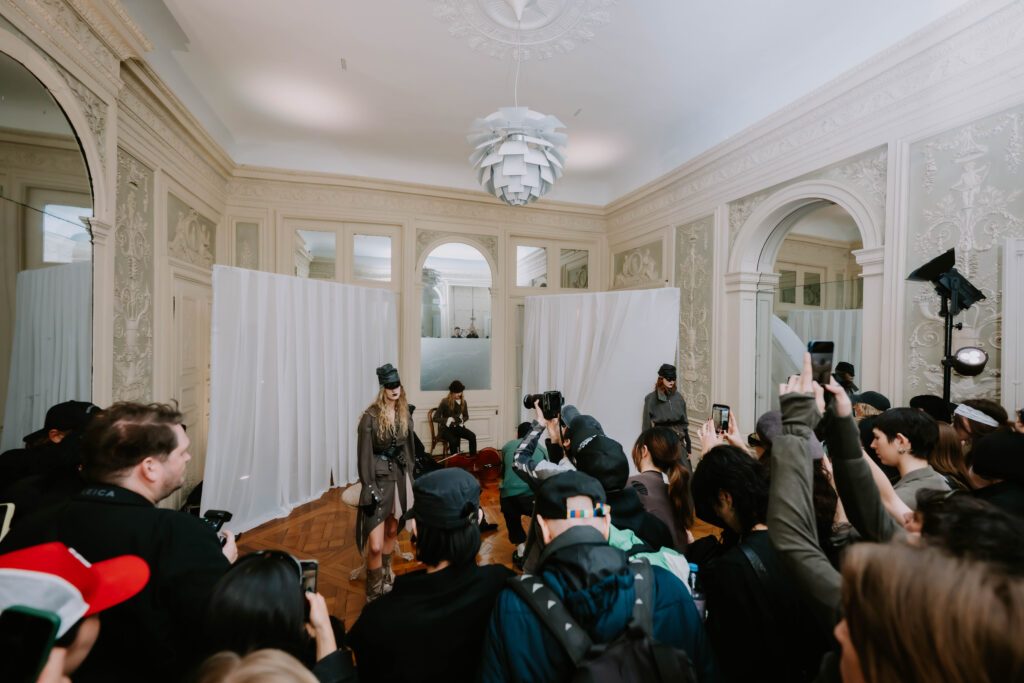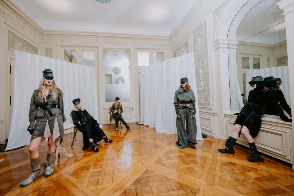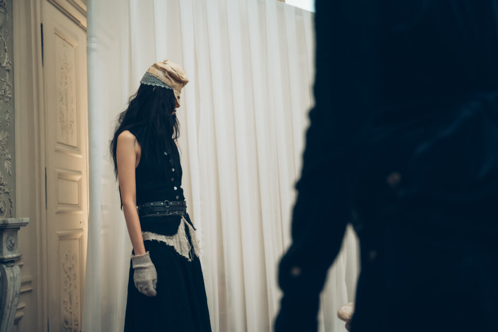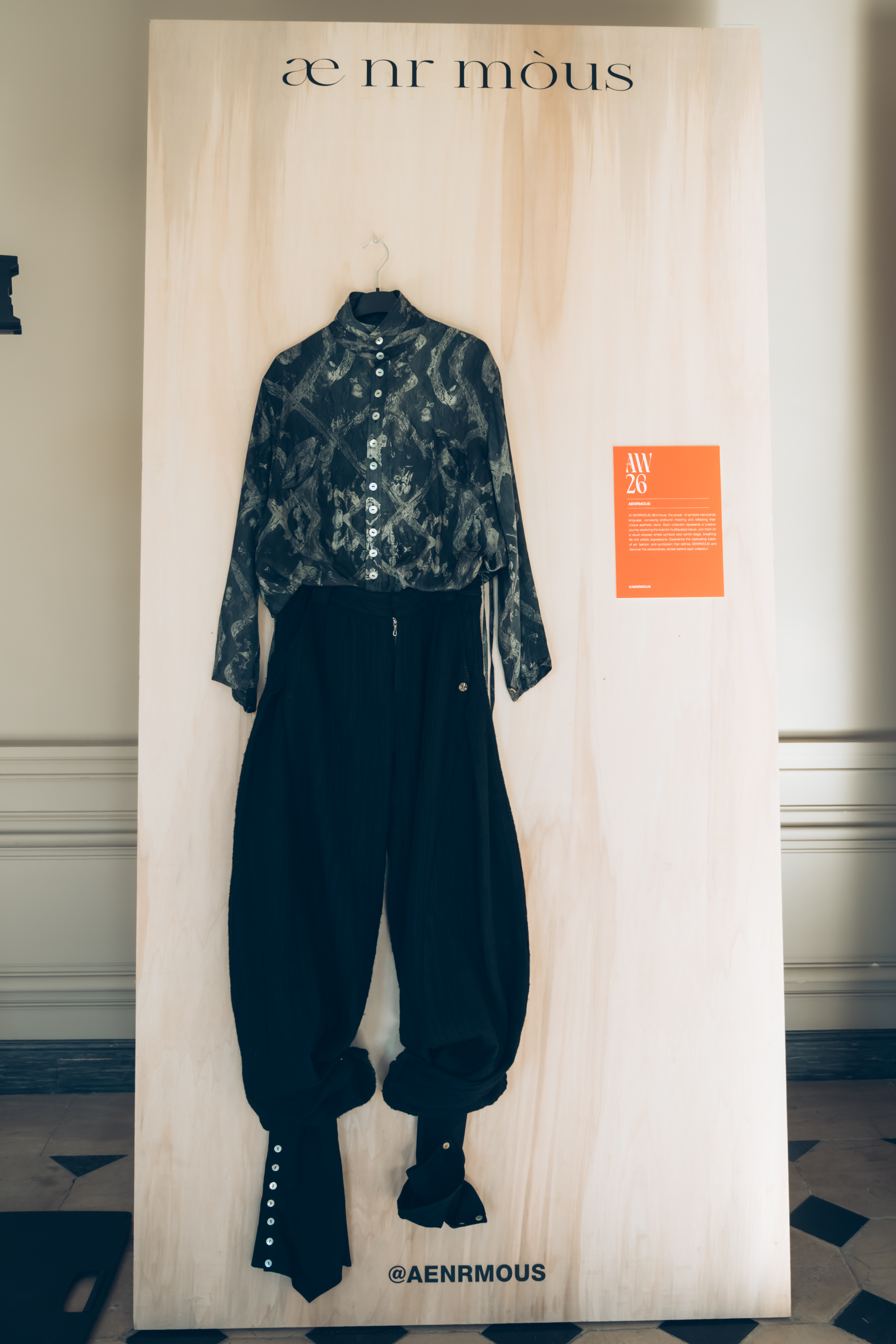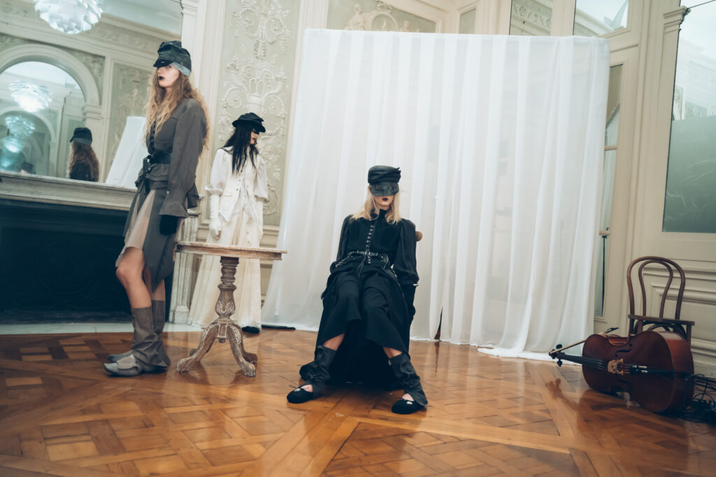 AENRMOUS invited the audience to enter their world as if opening a door into the unknown. The concept focused on rebuilding after ashes using the hand to stitch back the shape of the soul, symbolising hope and repair. Silhouettes reference medieval armor, hats, and hoods as symbols of identity and protection. Wax finishing was applied to suspend time, preserving garments in a frozen state. Inspired by the 1965 Polish film Ashes, the collection explored identity, war, and existential questions. The presentation included a collaboration with a cello musician Ouri, reinterpreting classical compositions through contemporary synthesis to create a live performance atmosphere.