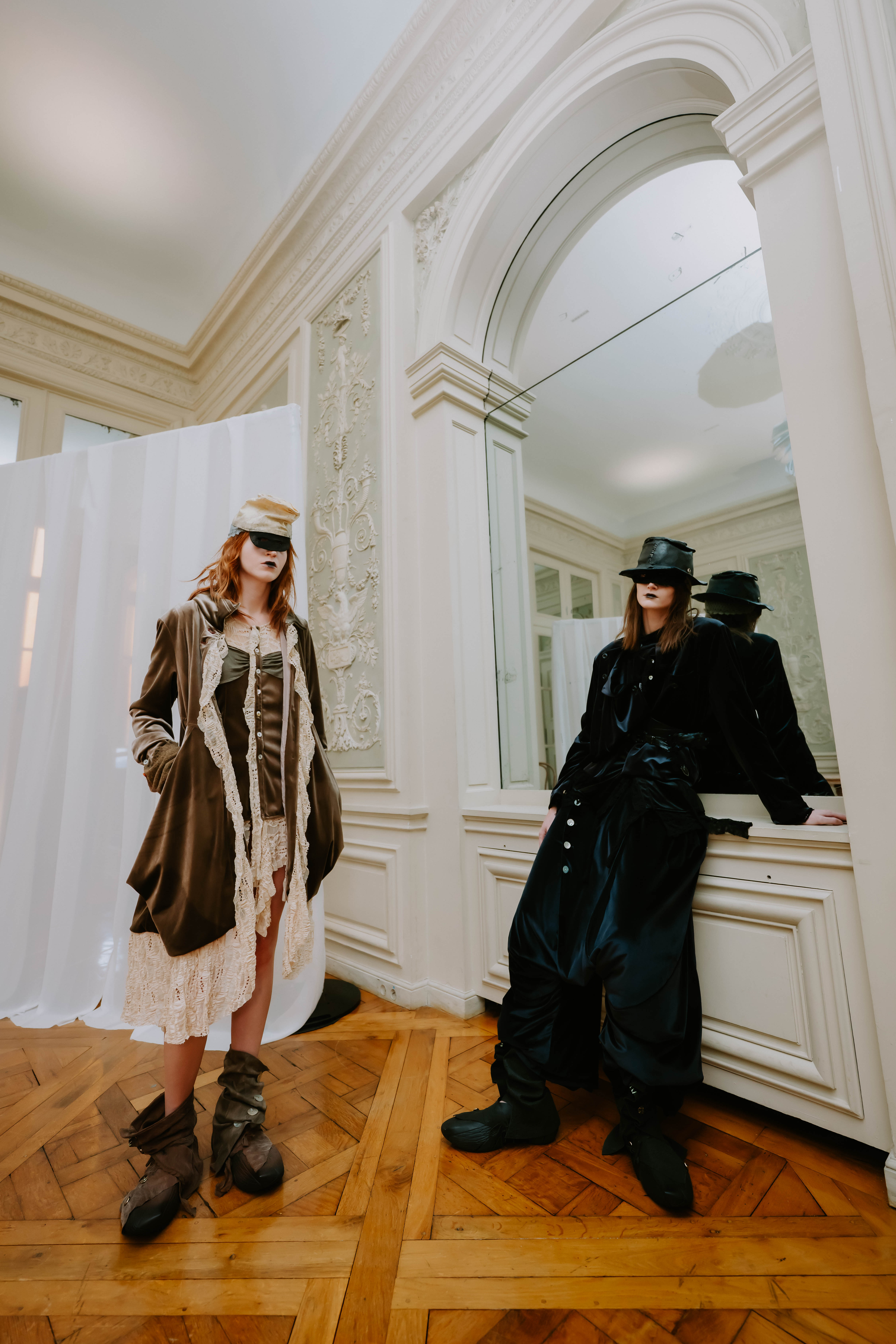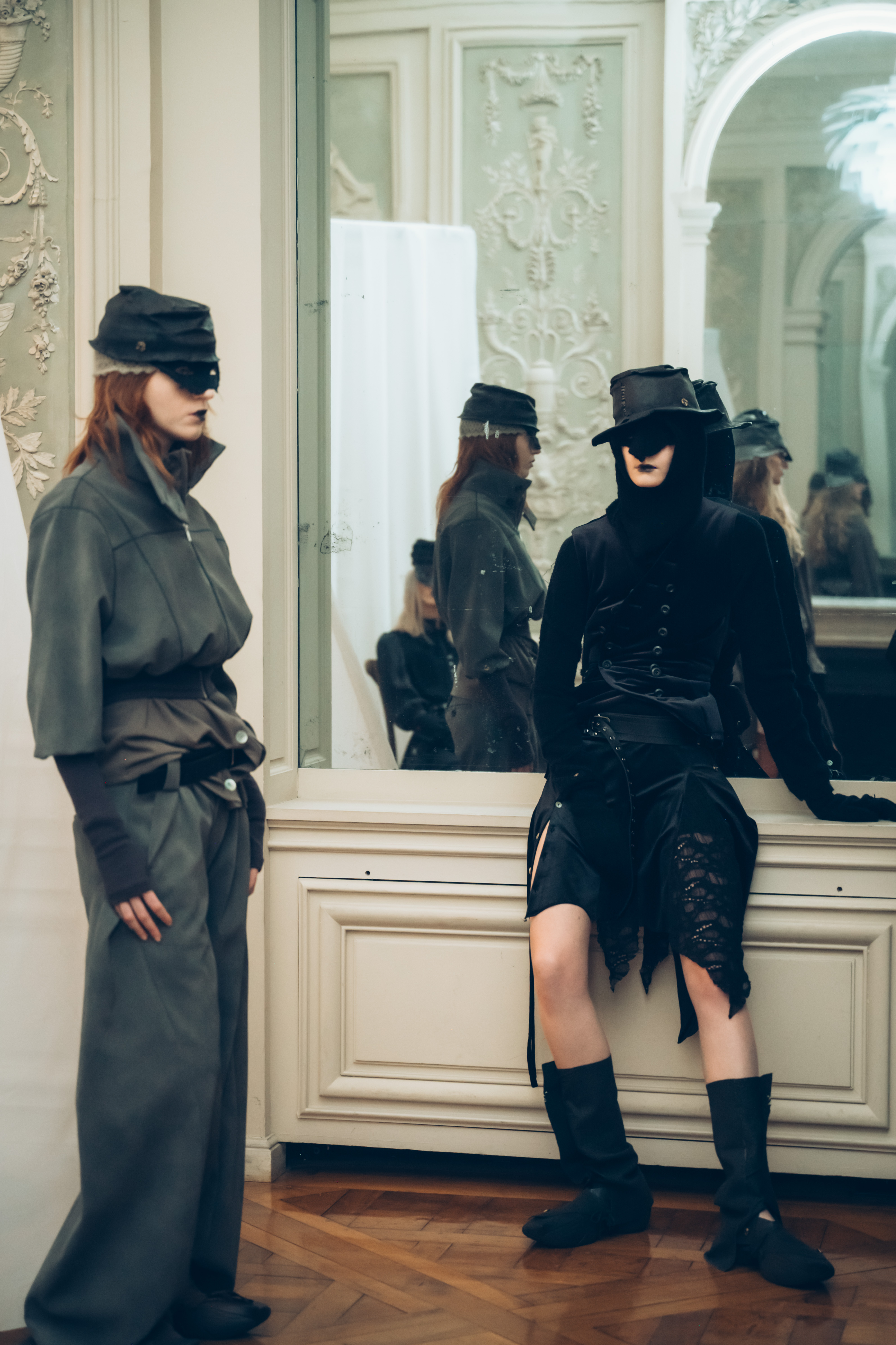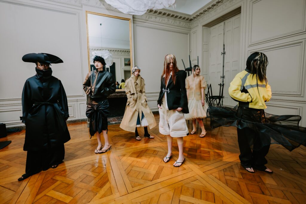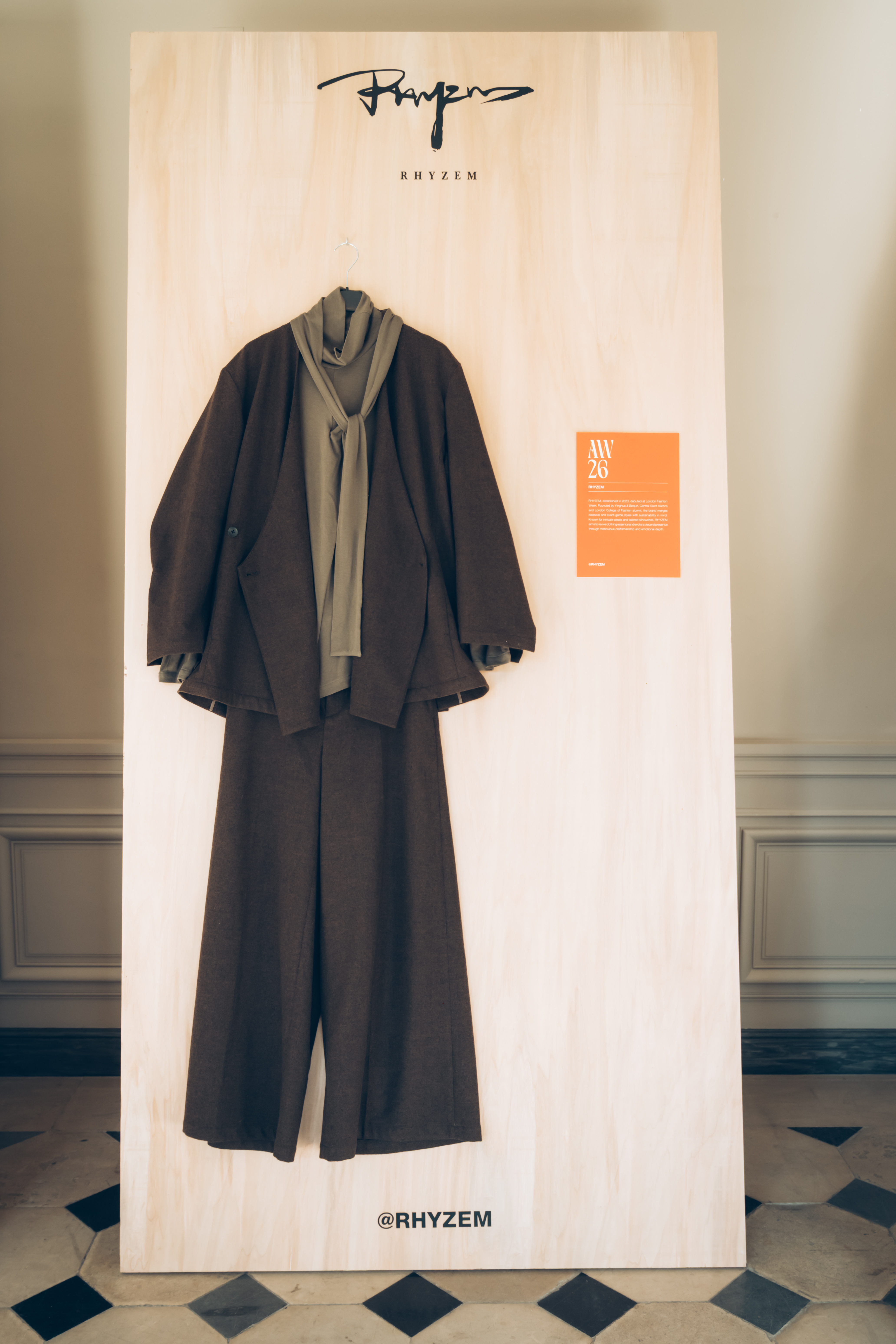 AENRMOUS invited the audience to enter their world as if opening a door into the unknown. The concept focused on rebuilding after ashes using the hand to stitch back the shape of the soul, symbolising hope and repair. Silhouettes reference medieval armor, hats, and hoods as symbols of identity and protection. Wax finishing was applied to suspend time, preserving garments in a frozen state. Inspired by the 1965 Polish film Ashes, the collection explored identity, war, and existential questions. The presentation included a collaboration with a cello musician Ouri, reinterpreting classical compositions through contemporary synthesis to create a live performance atmosphere.