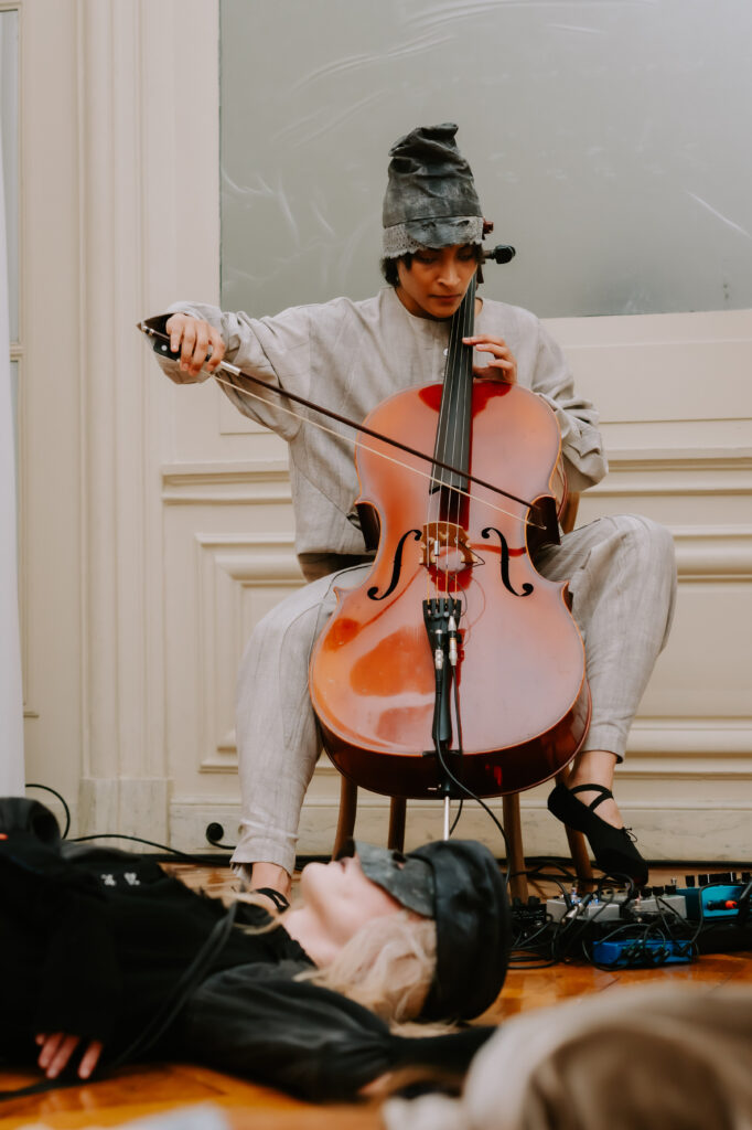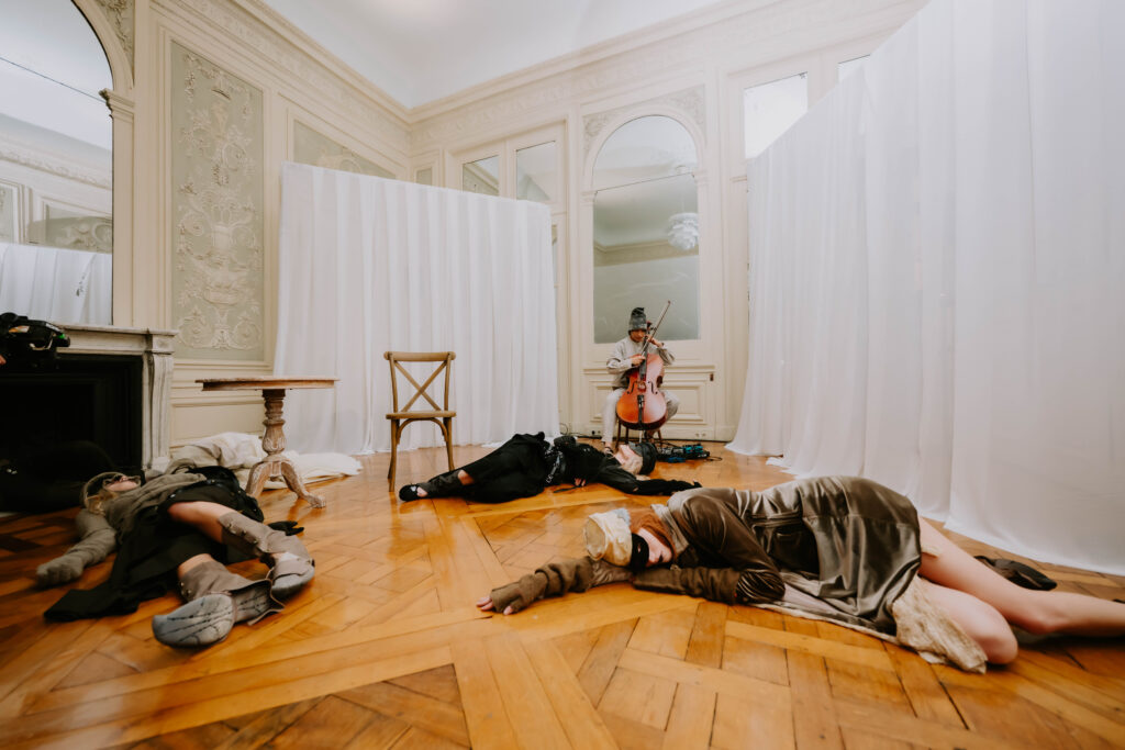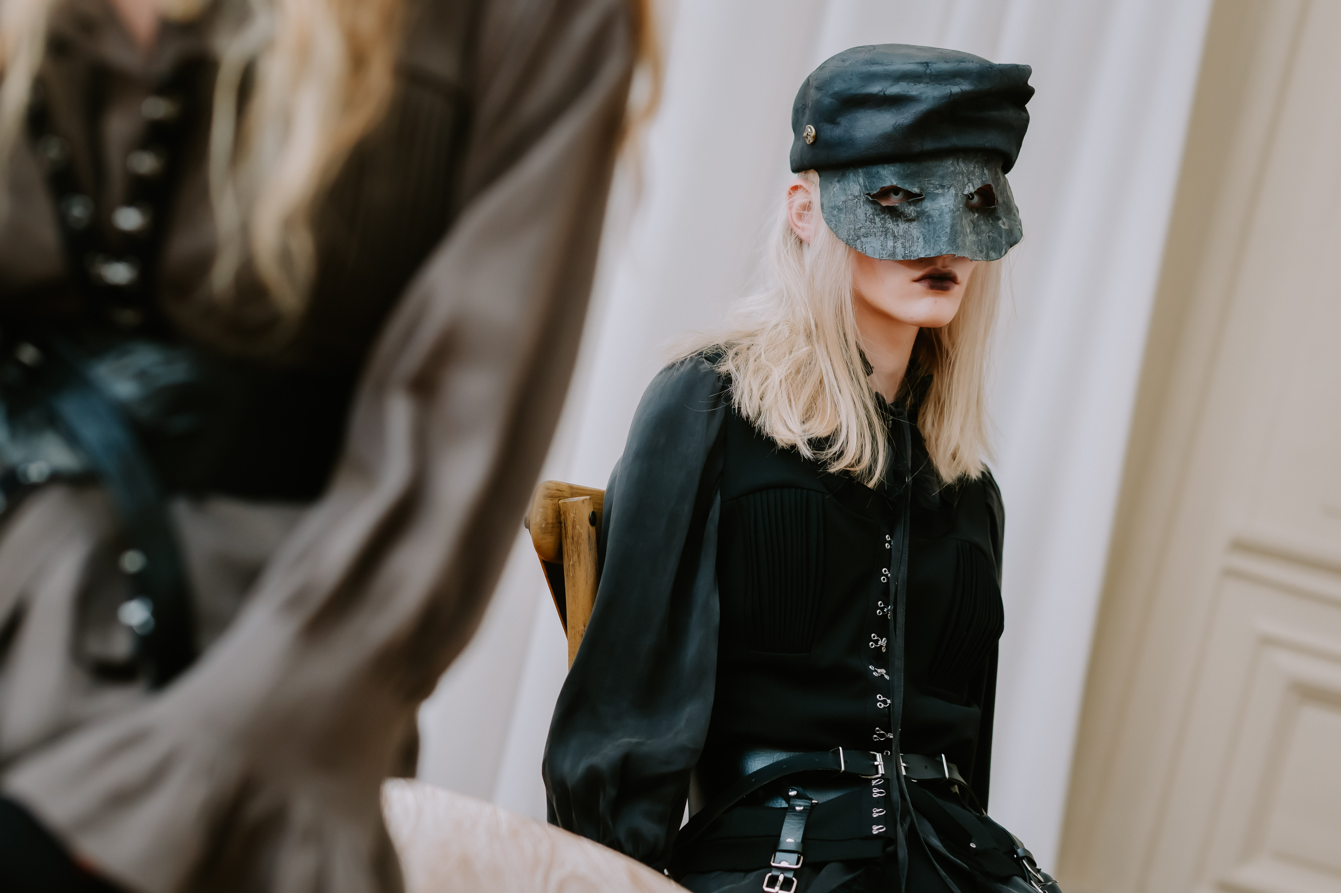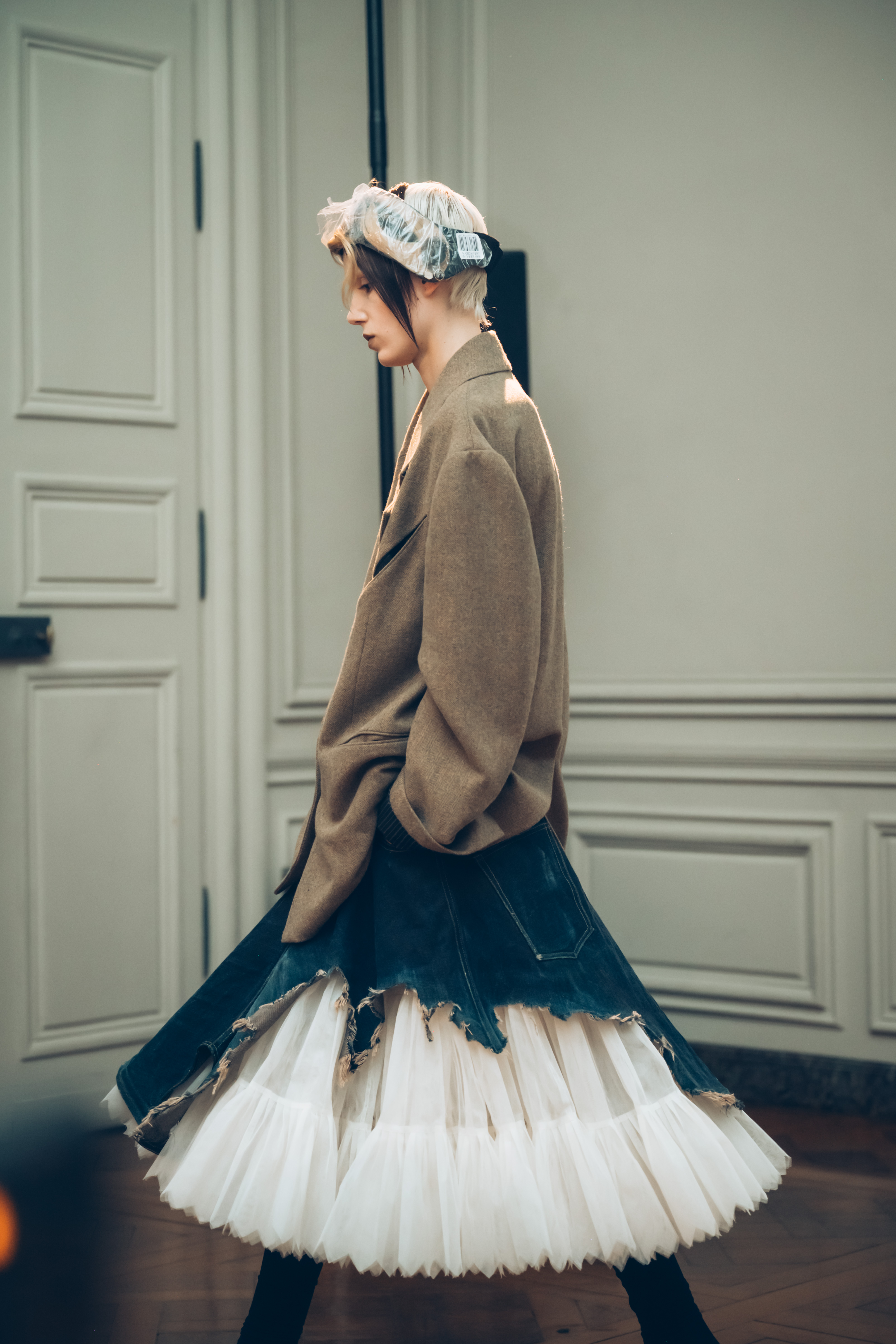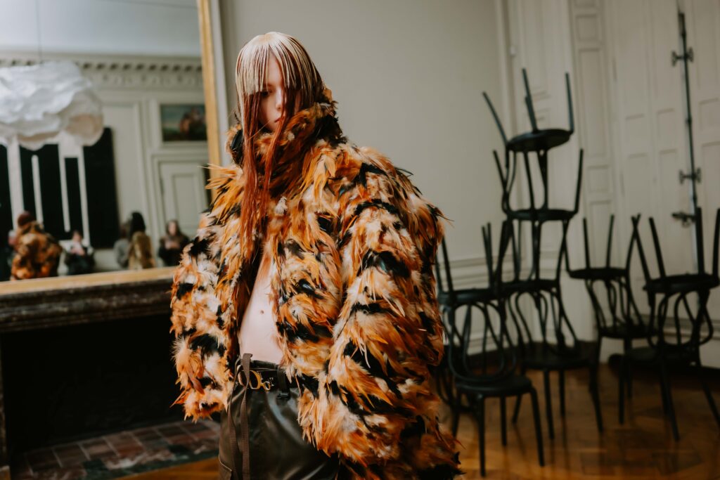 AENRMOUS invited the audience to enter their world as if opening a door into the unknown. The concept focused on rebuilding after ashes using the hand to stitch back the shape of the soul, symbolising hope and repair. Silhouettes reference medieval armor, hats, and hoods as symbols of identity and protection. Wax finishing was applied to suspend time, preserving garments in a frozen state. Inspired by the 1965 Polish film Ashes, the collection explored identity, war, and existential questions. The presentation included a collaboration with a cello musician Ouri, reinterpreting classical compositions through contemporary synthesis to create a live performance atmosphere.