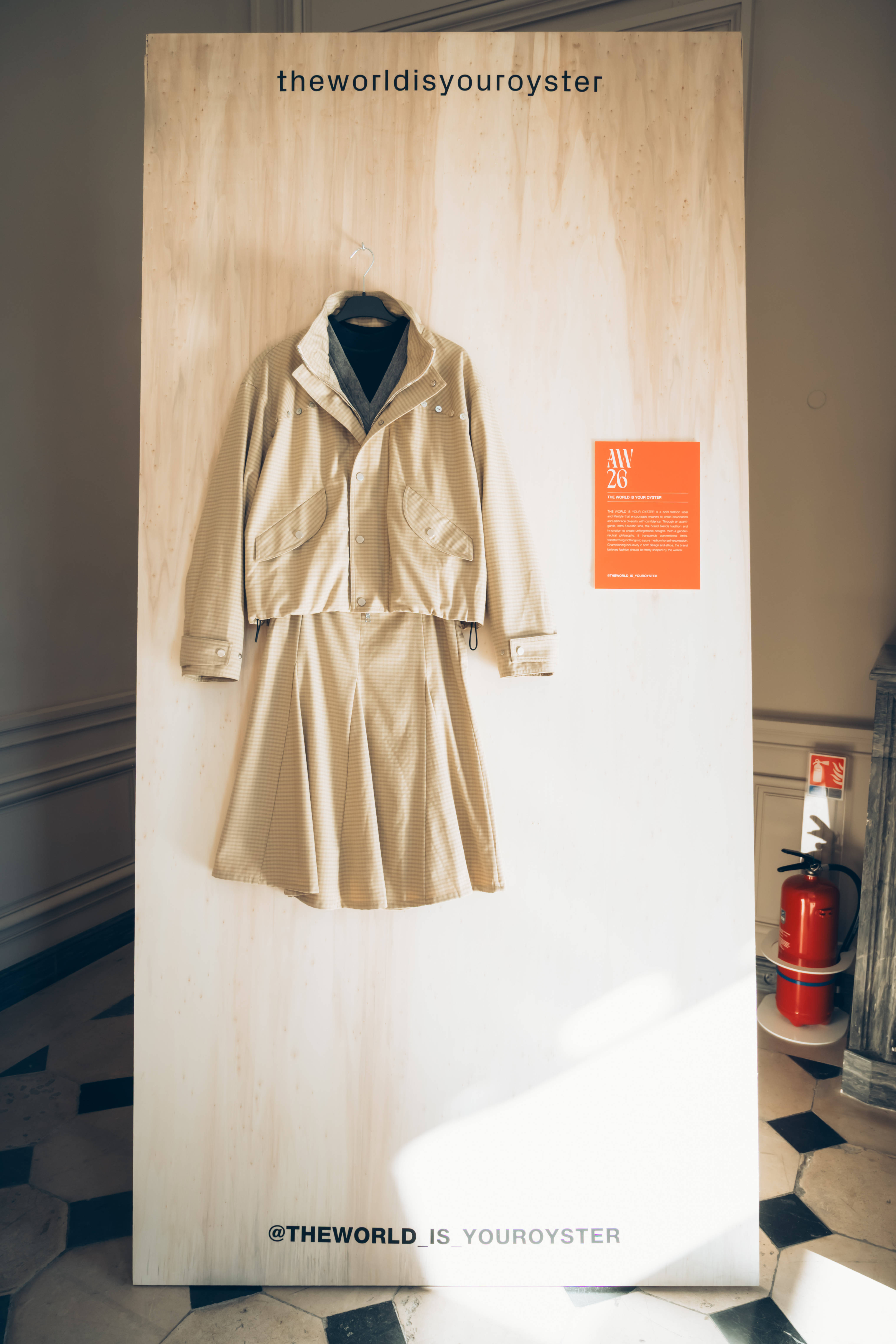 The ‘Unseen Poem’ collection from RHYZEM draws inspiration from the experimental film ‘Meshes of the Afternoon’, delving into the boundary between reality and dreams to explore the haziness and uncertainty of visual perception. Through the artful juxtaposition of ethereal fabrics and architectural silhouettes, the interplay of solid and void in layered construction, and breathing negative space in the tailoring, this collection cultivates a quiet, enigmatic aura. THE WORLD IS YOUR OYSTER presents ‘The Post-Adolescent Uniform’: a stylistic deconstruction that journeys from school corridors to office cubicles. Inspired by Jacques Tati’s film ‘Playtime’—with its highly ordered, transparent, and geometric modern spaces—the collection serves as a brilliant metaphor for examining the relationship between the ‘uniform’ and the ‘individual’. The designer cleverly infuses a relaxed, intelligent, youthful energy, blurring the lines of age and occasion.