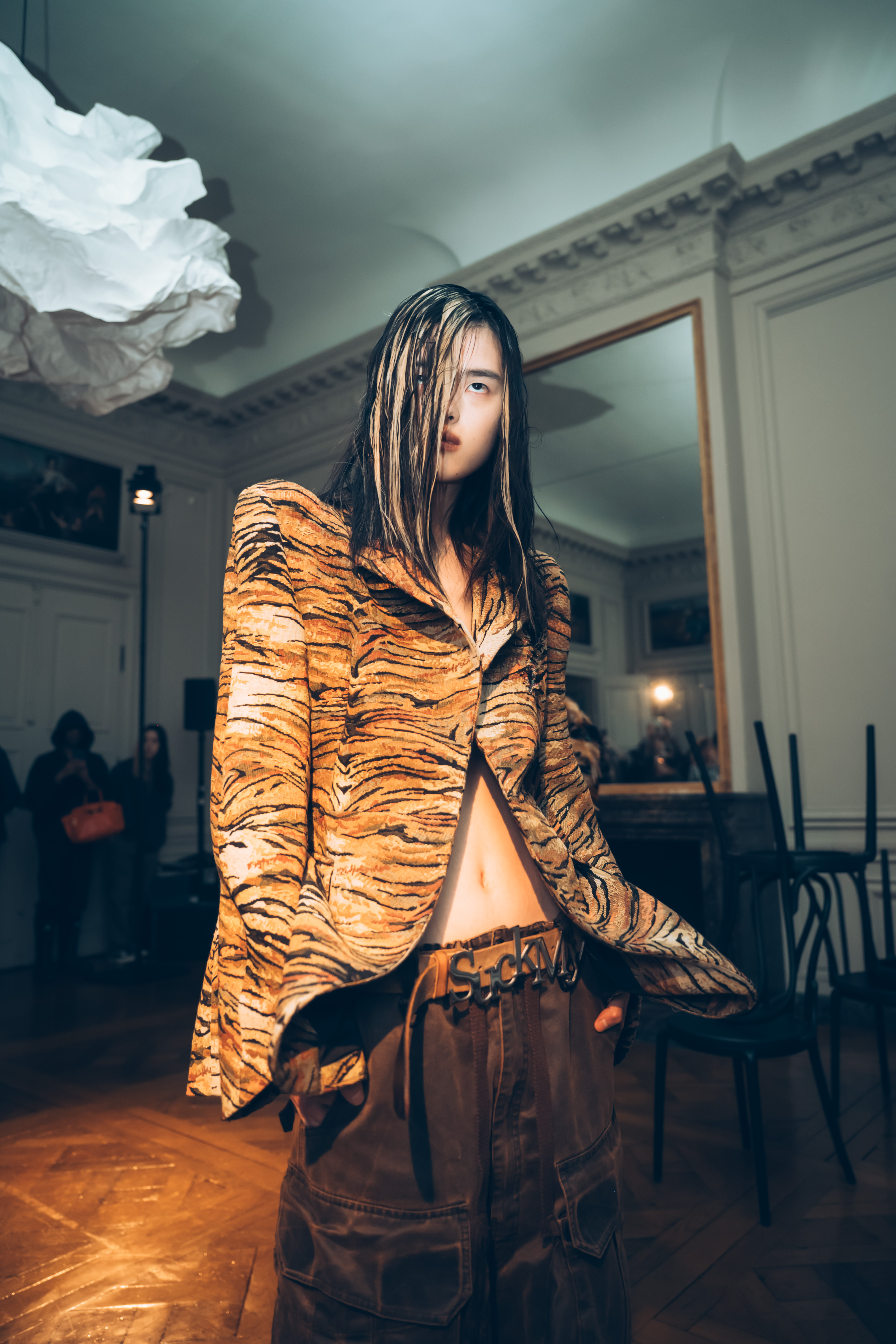 The ‘Tiger Lake’ collection is presented through a highly theatrical spatial composition. At the centre, a clustered formation of chairs establishes the visual focal point, while lighting cast from both sides defines sharp gradations of light and shadow. Models enter the illuminated space one by one, stepping into the spotlight where their presence is revealed and examined at the threshold between brightness and obscurity. This echoes the collection’s theme of ‘Duality’, inviting a close reading of haute couture craftsmanship alongside vernacular symbols under contrasting light, and creating a visual tension where opulence and precarity coexist.