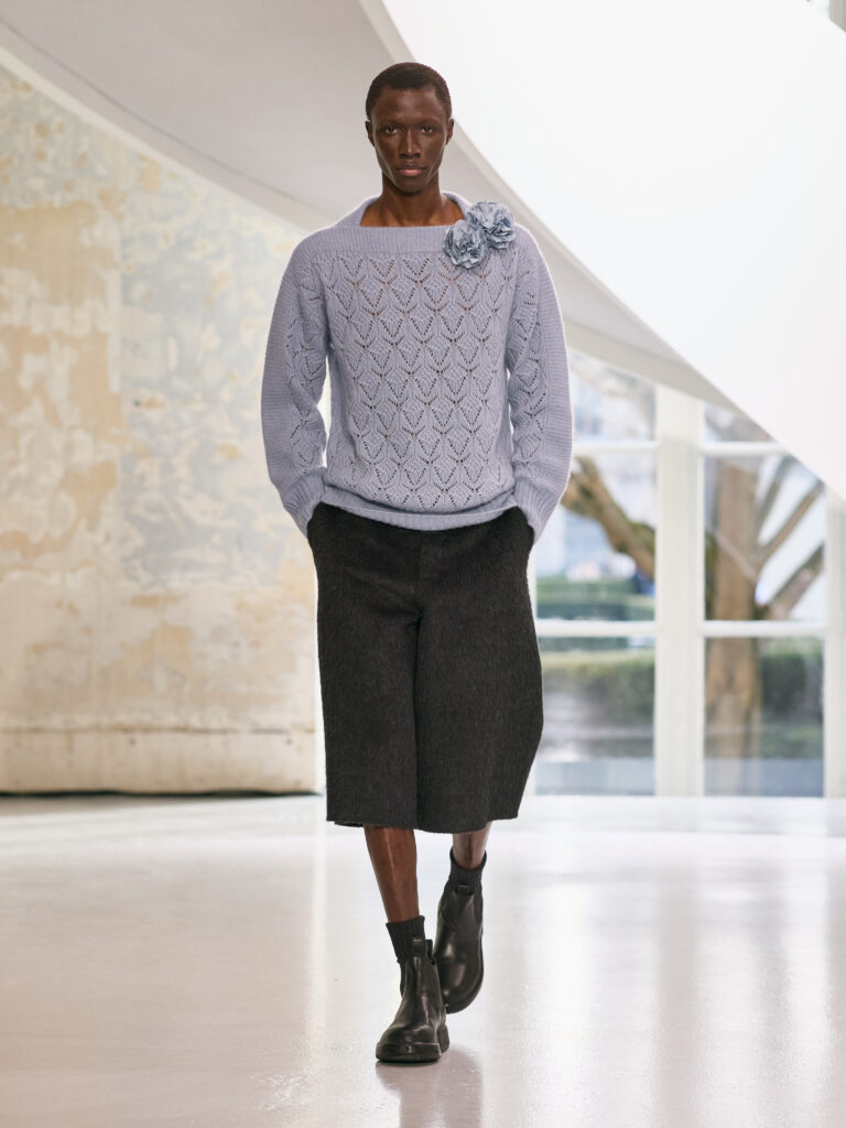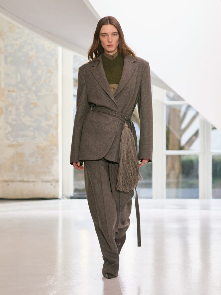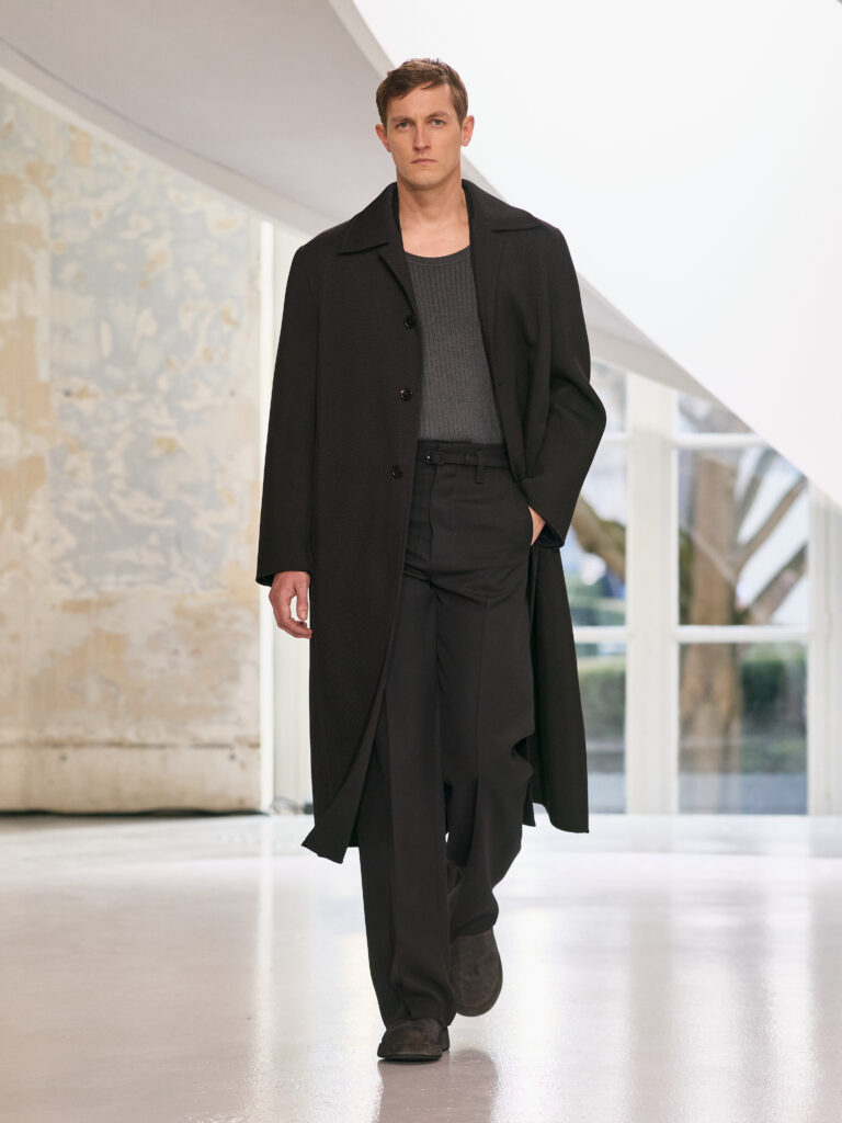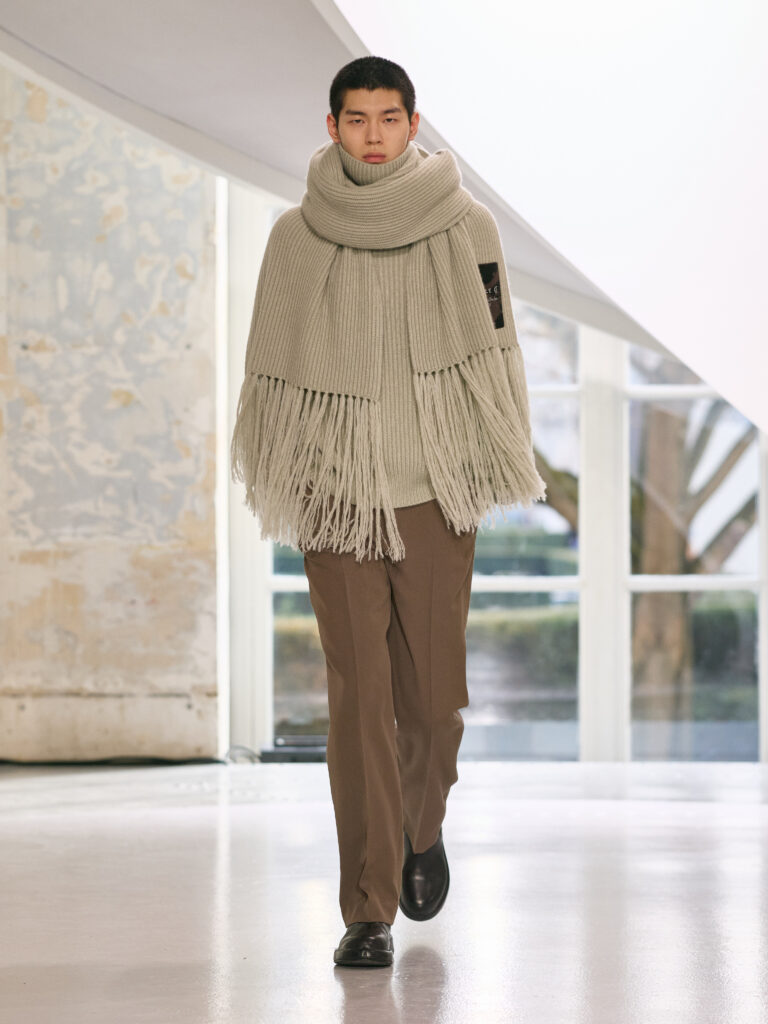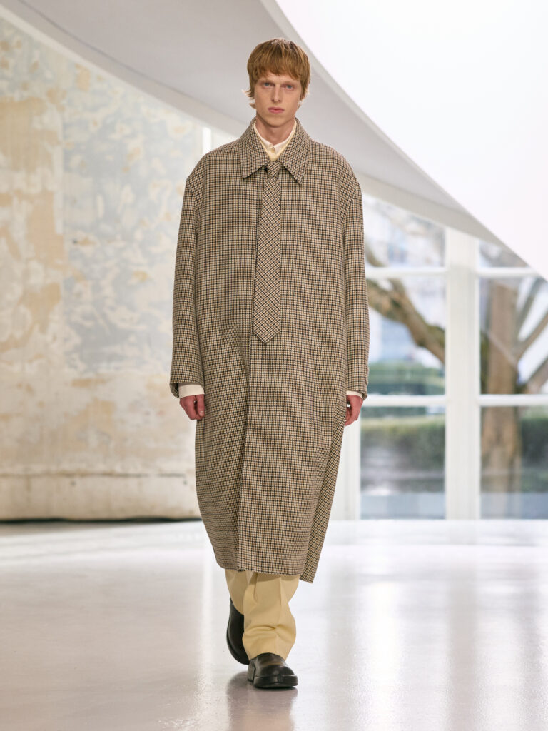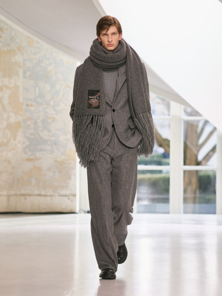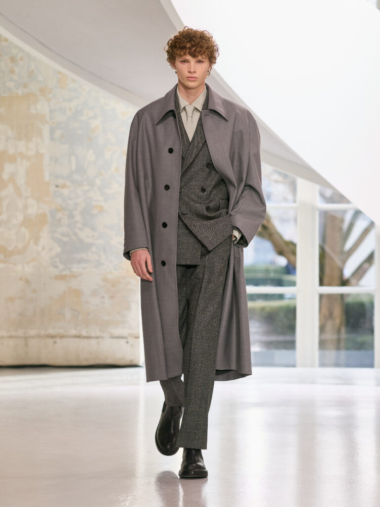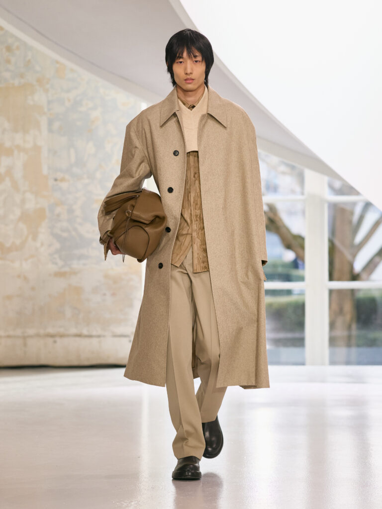 The menswear collection defines a more assertive elegance. New classics born of traditional craftsmanship are revisited in terms of materials and proportions. The archetypes of menswear persist, finding a softer expression through delicate fabrics. Silhouettes are lightened by silk and cashmere, a counterpoint to sturdy tweeds, wool houndstooth and compact waistcoats. The collection proposes that beauty arises from a simple movement, a fold, a gesture. It is a celebration of the beauty of the