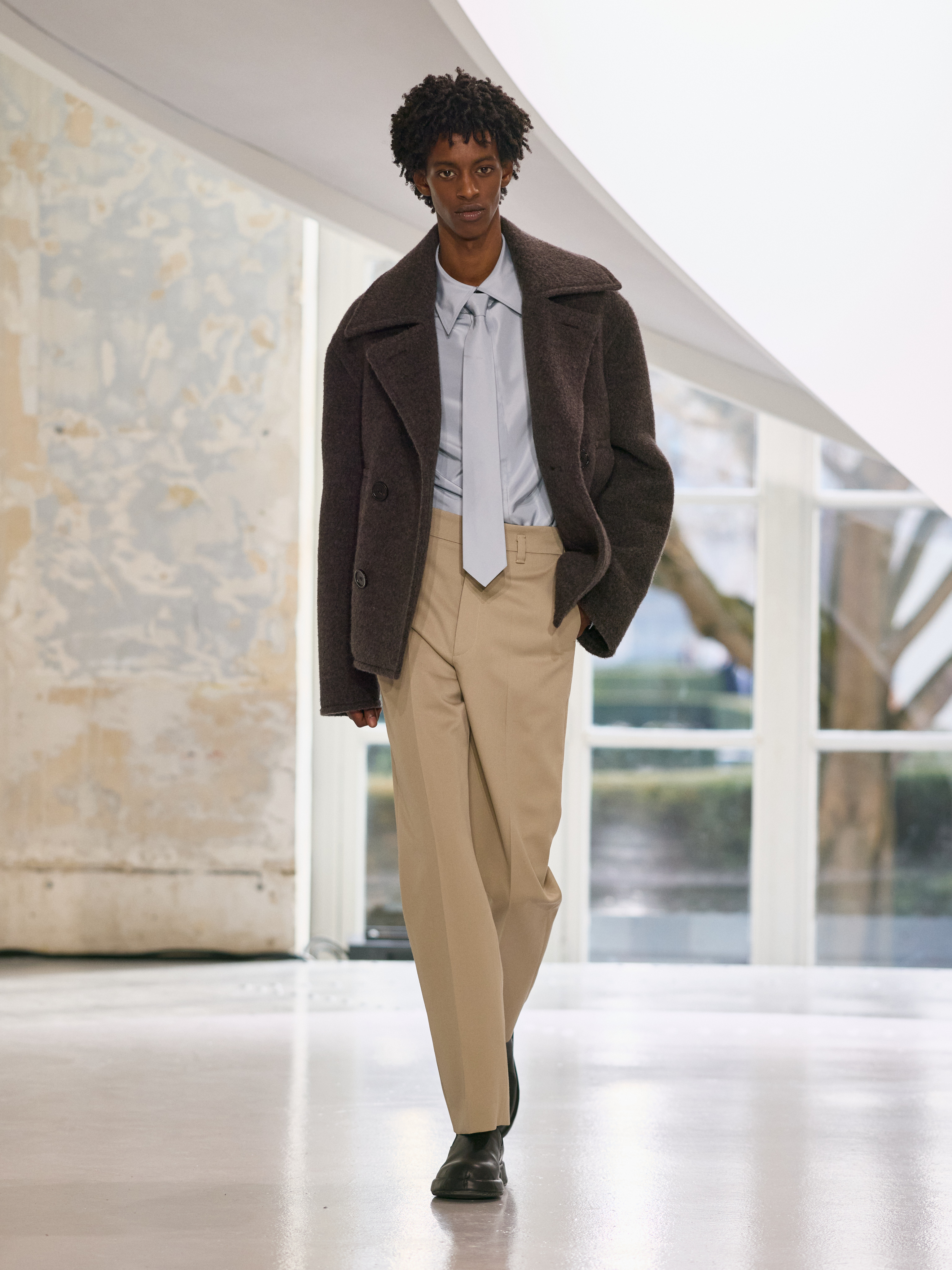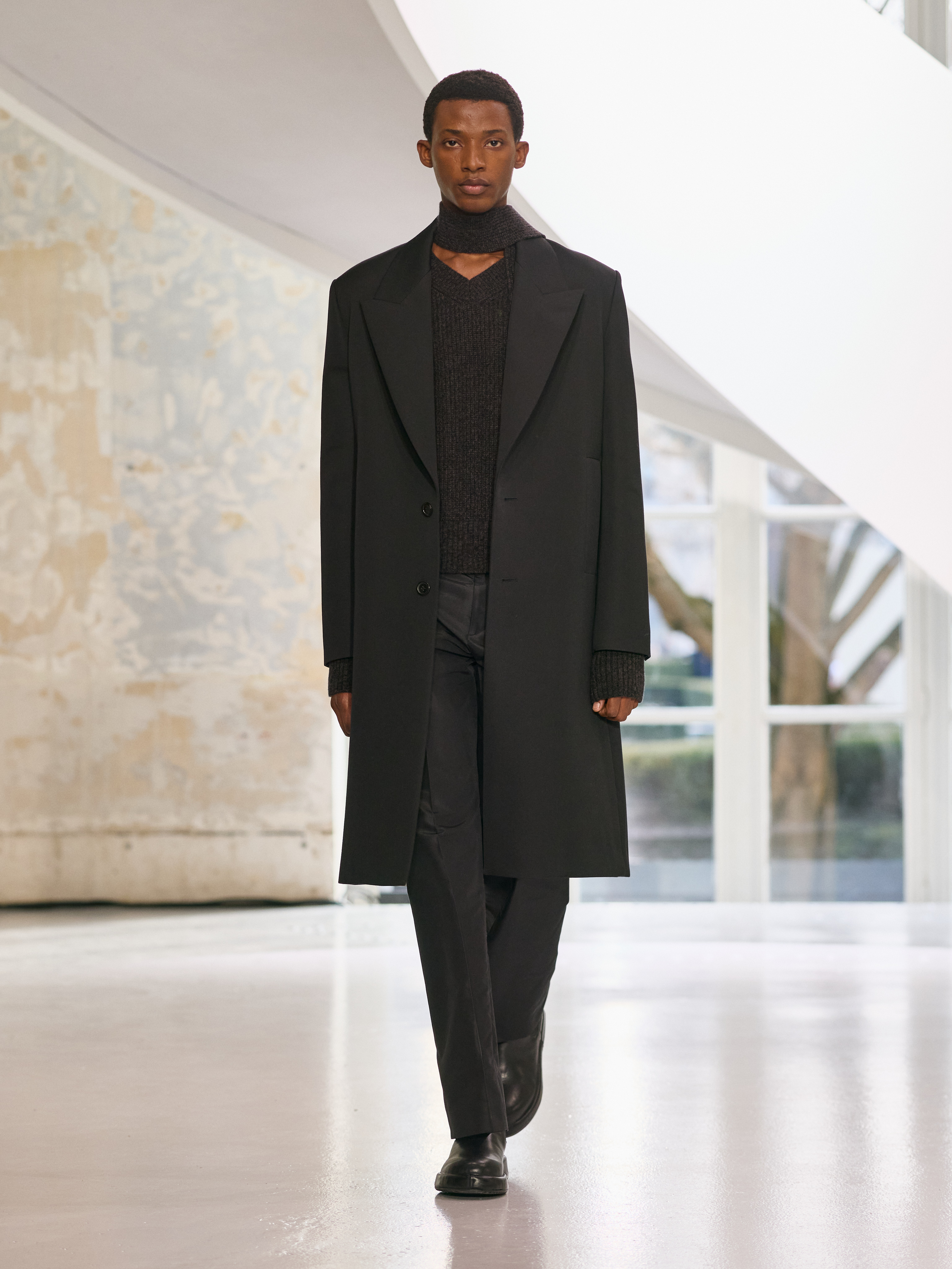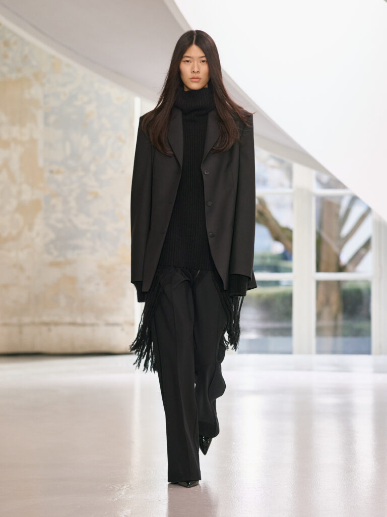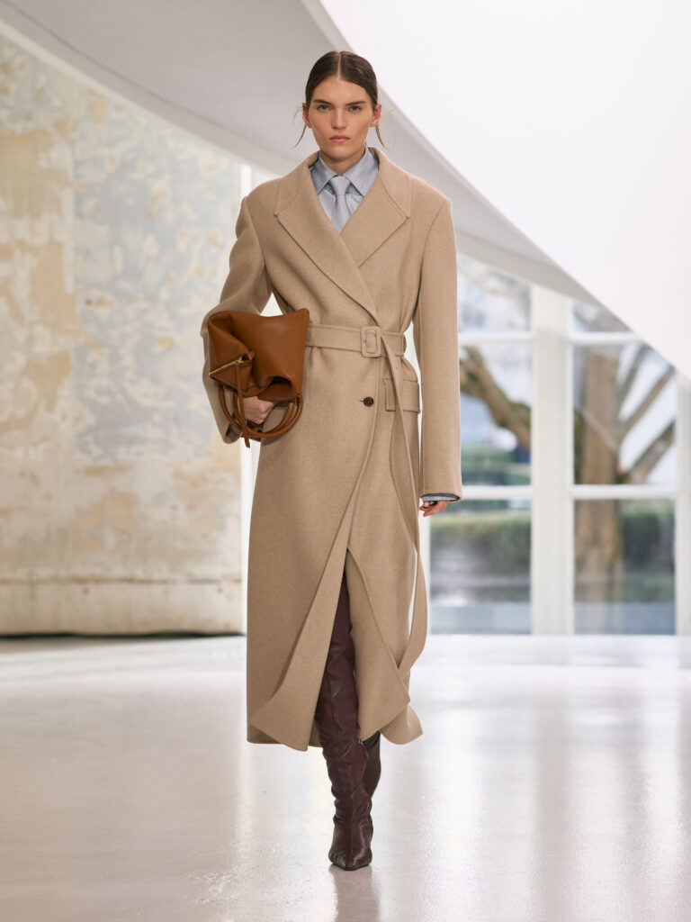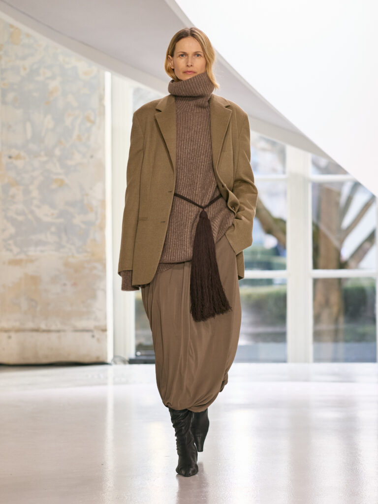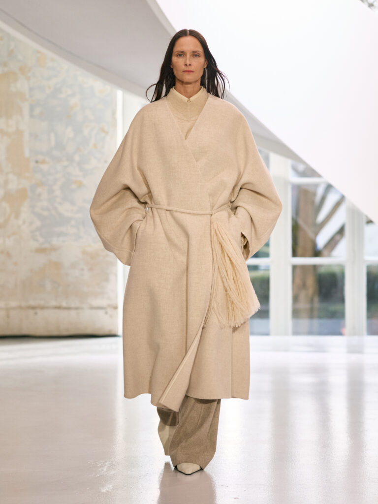 The menswear collection defines a more assertive elegance. New classics born of traditional craftsmanship are revisited in terms of materials and proportions. The archetypes of menswear persist, finding a softer expression through delicate fabrics. Silhouettes are lightened by silk and cashmere, a counterpoint to sturdy tweeds, wool houndstooth and compact waistcoats. The collection proposes that beauty arises from a simple movement, a fold, a gesture. It is a celebration of the beauty of the