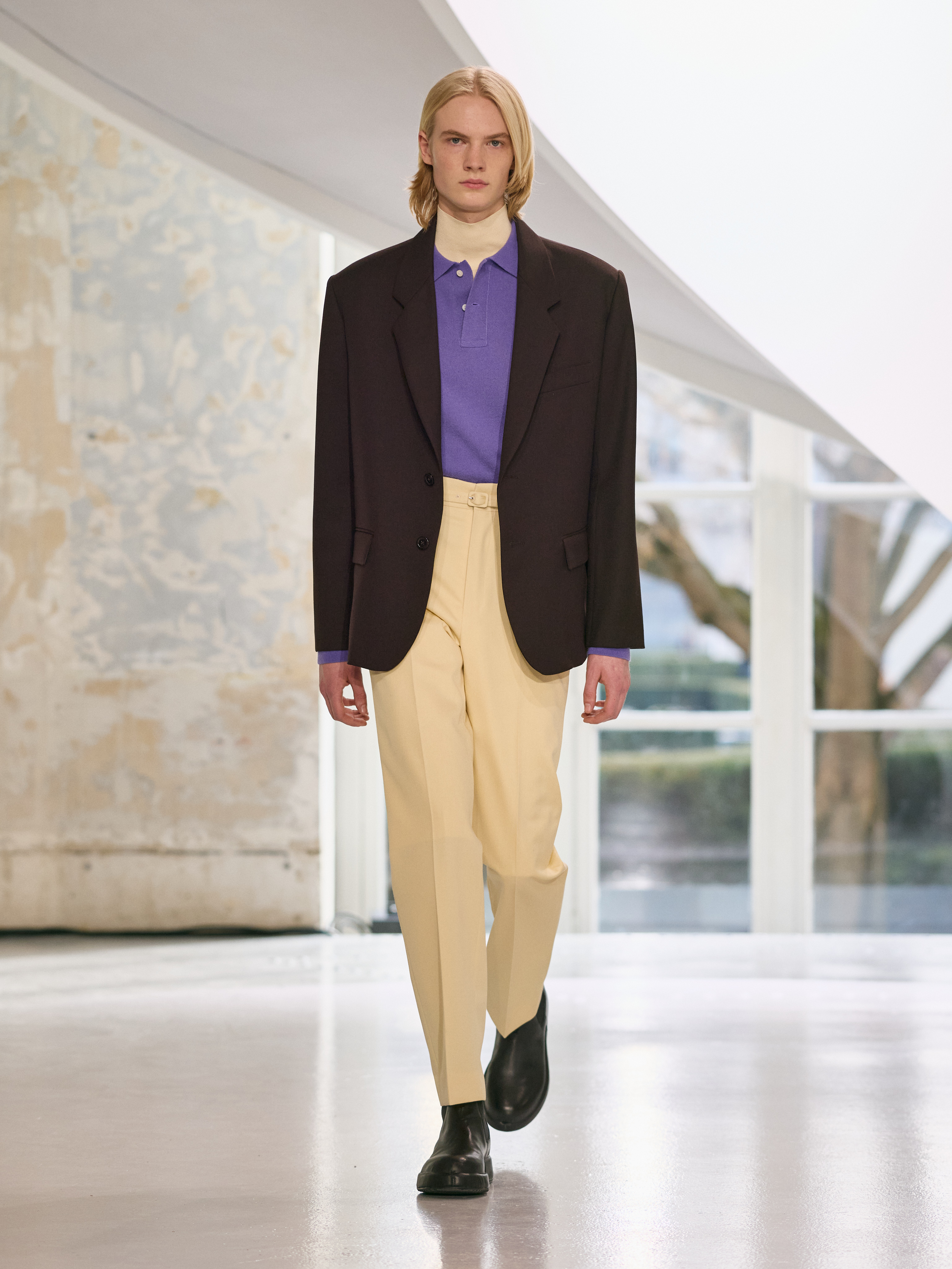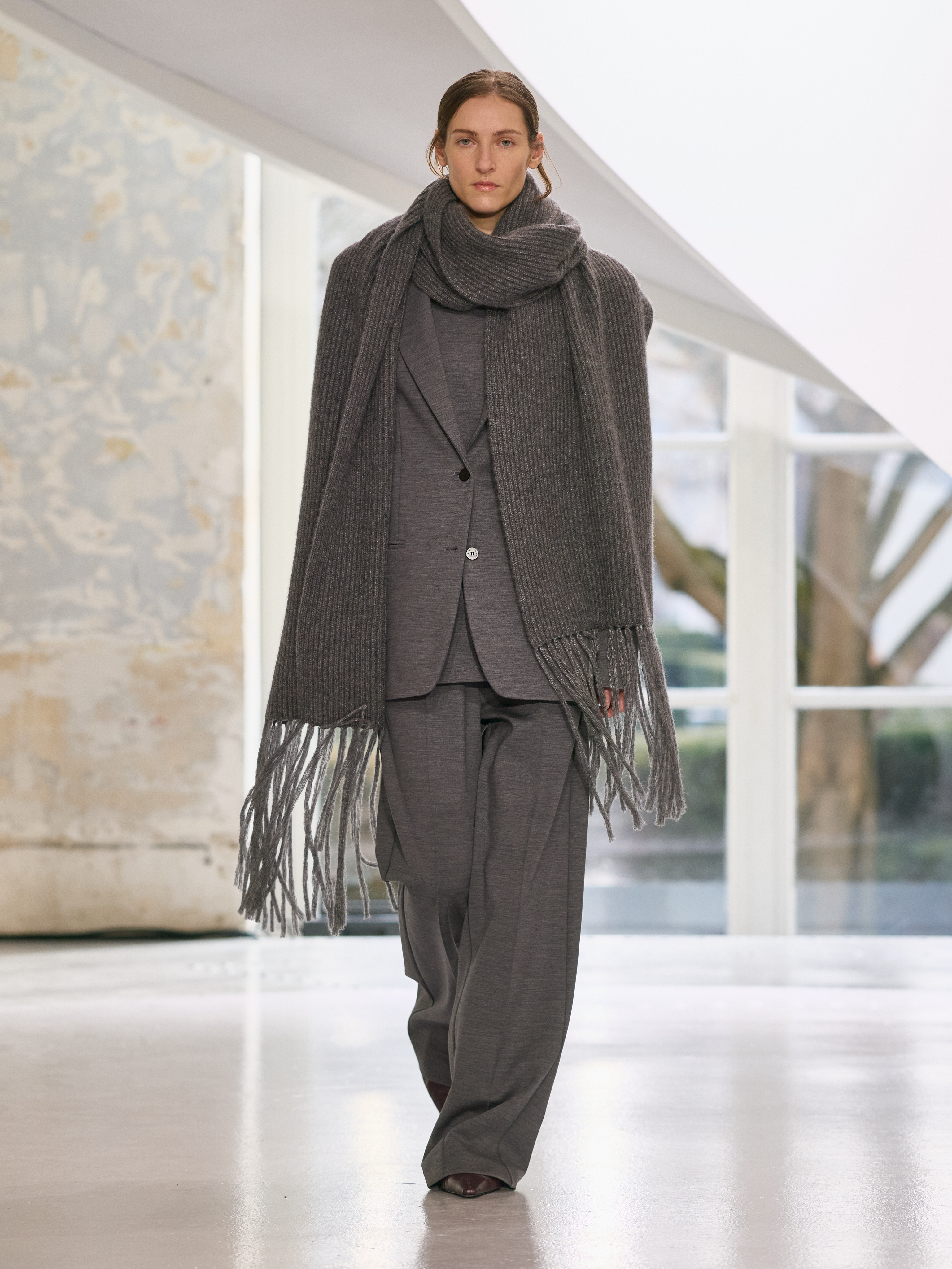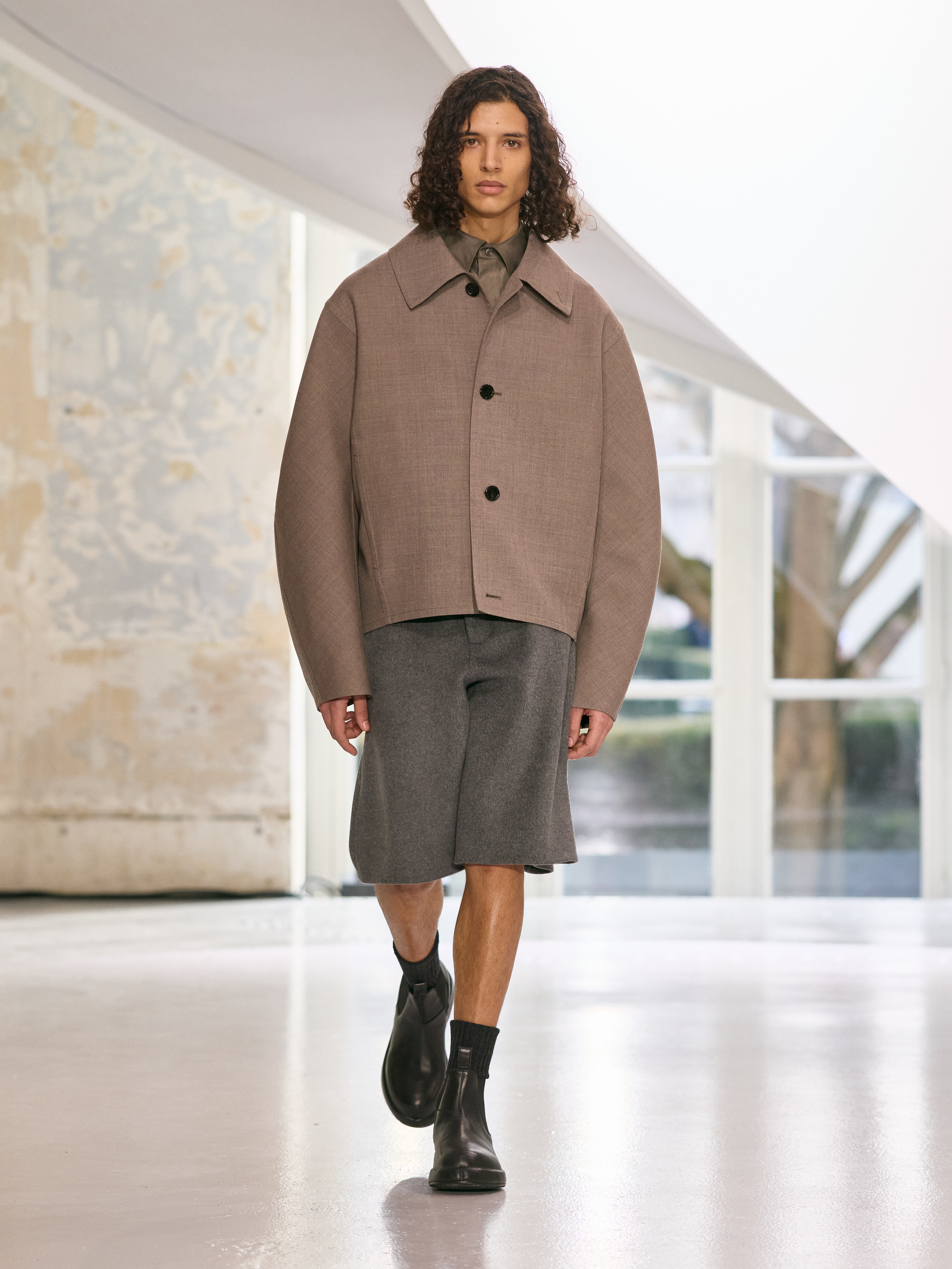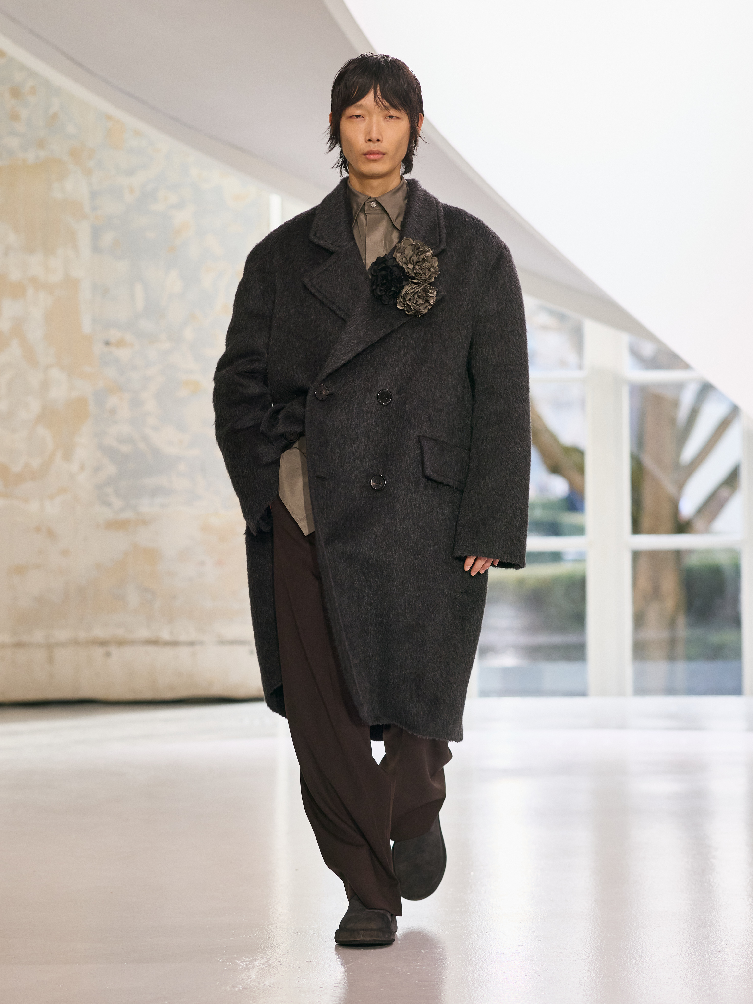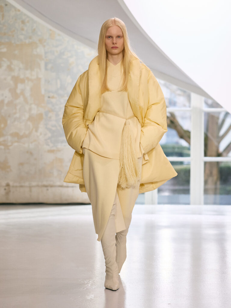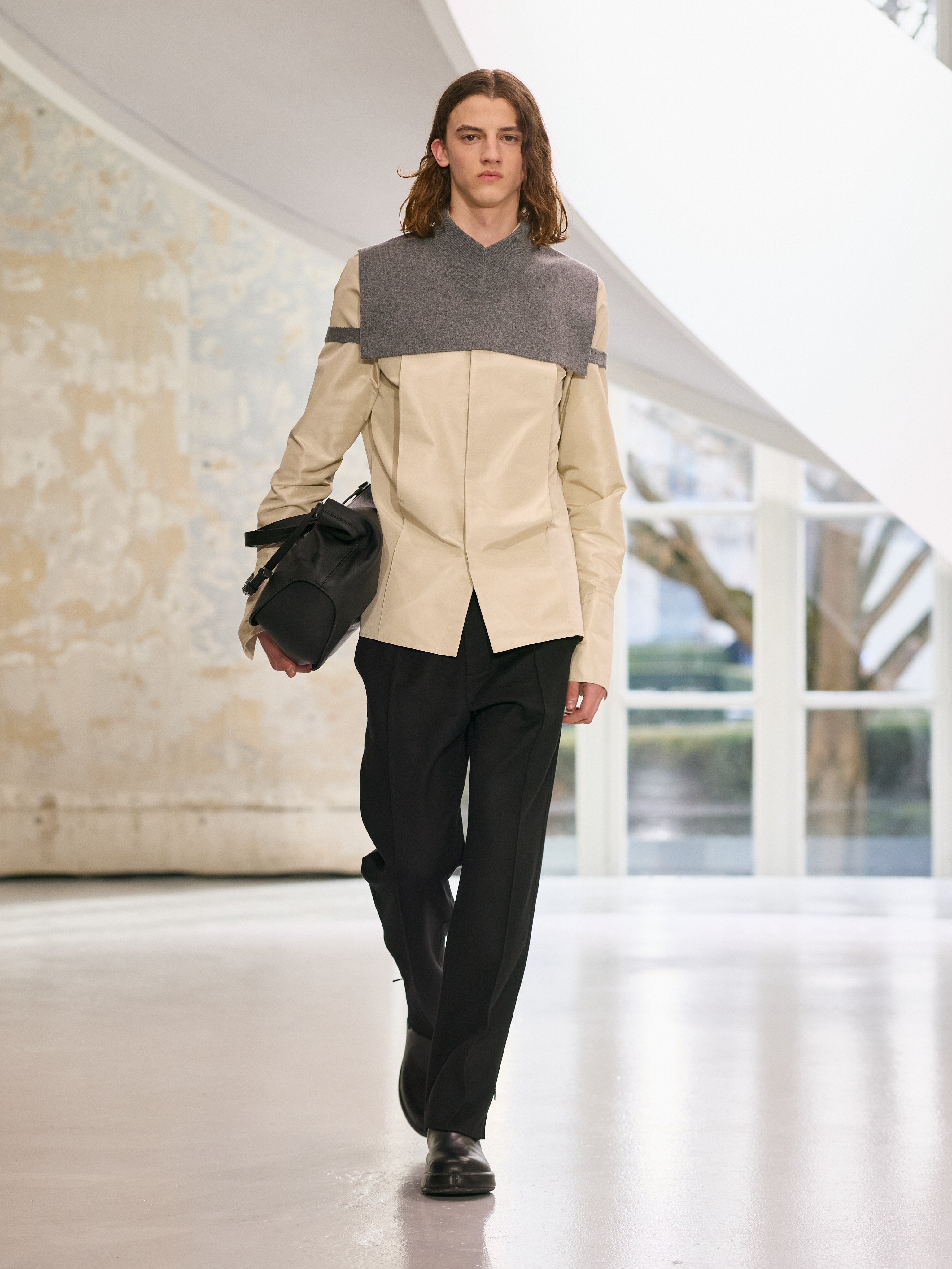The menswear collection defines a more assertive elegance. New classics born of traditional craftsmanship are revisited in terms of materials and proportions. The archetypes of menswear persist, finding a softer expression through delicate fabrics. Silhouettes are lightened by silk and cashmere, a counterpoint to sturdy tweeds, wool houndstooth and compact waistcoats. The collection proposes that beauty arises from a simple movement, a fold, a gesture. It is a celebration of the beauty of the