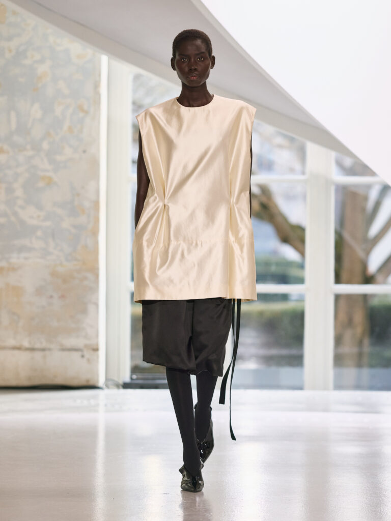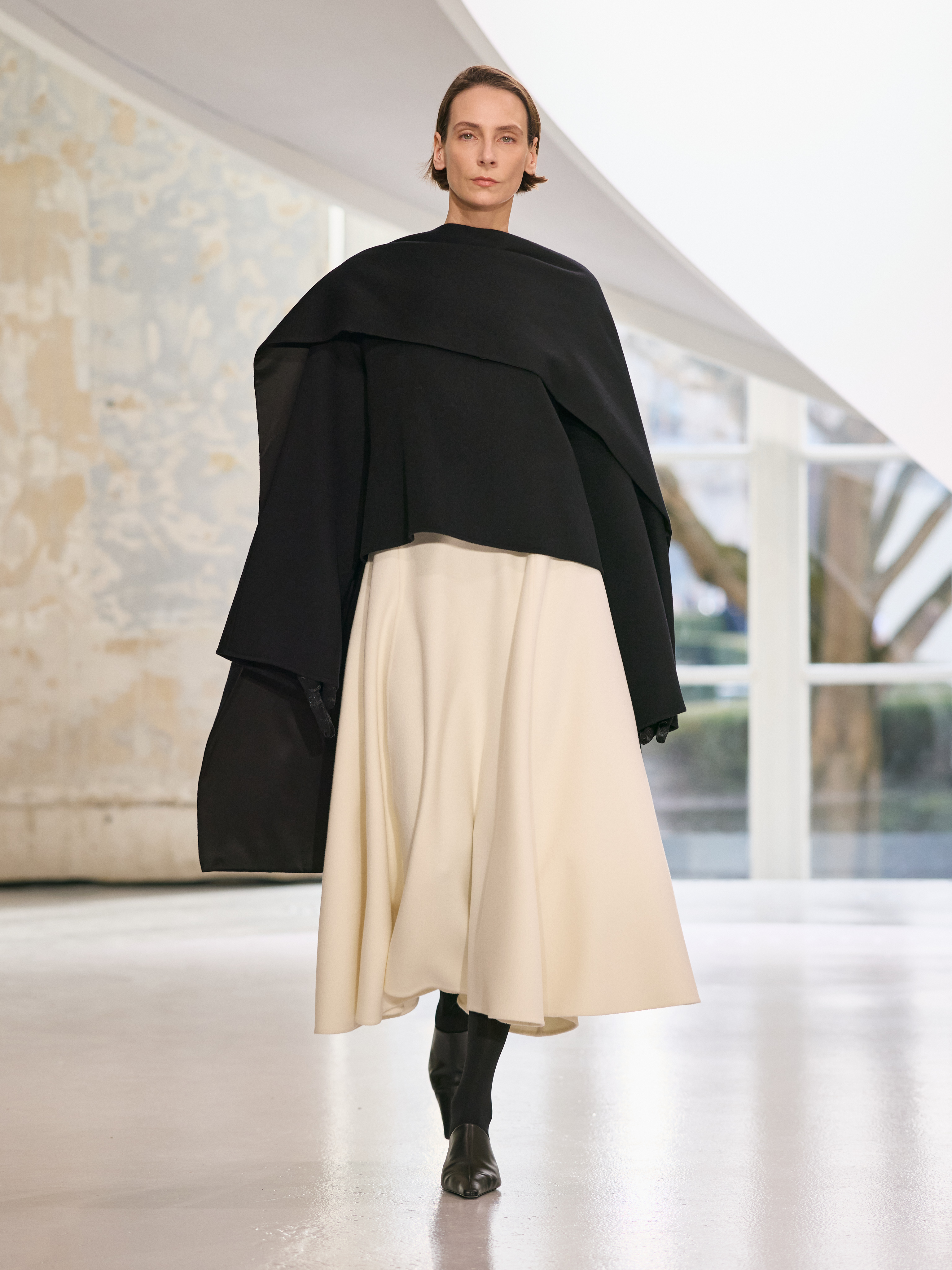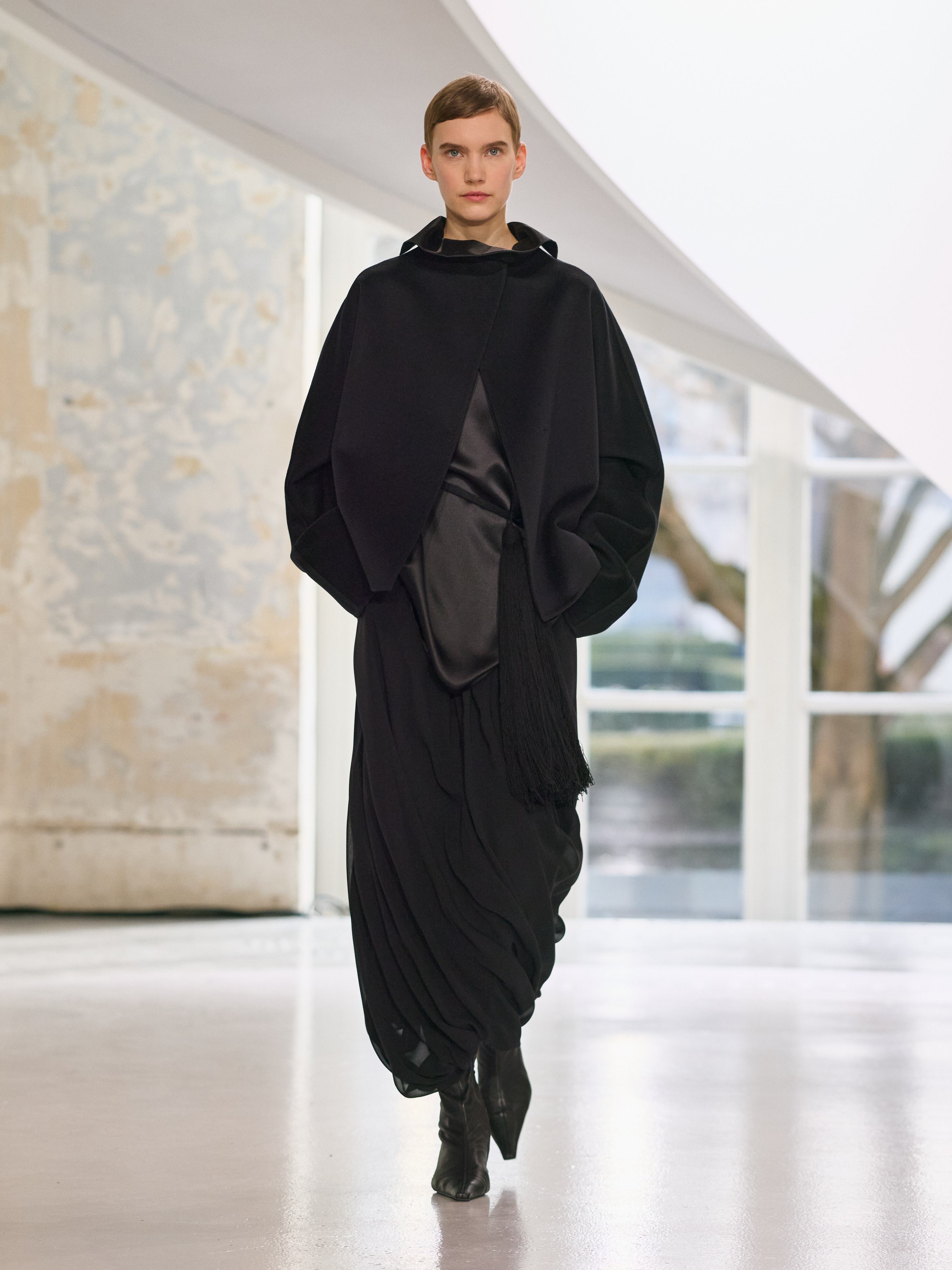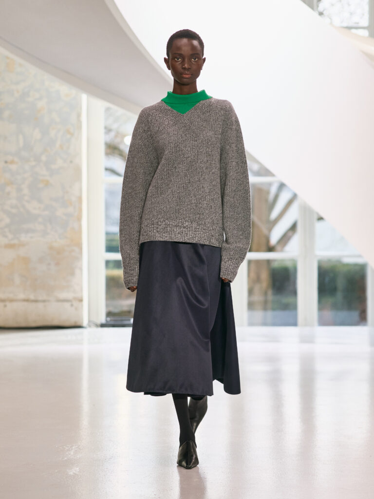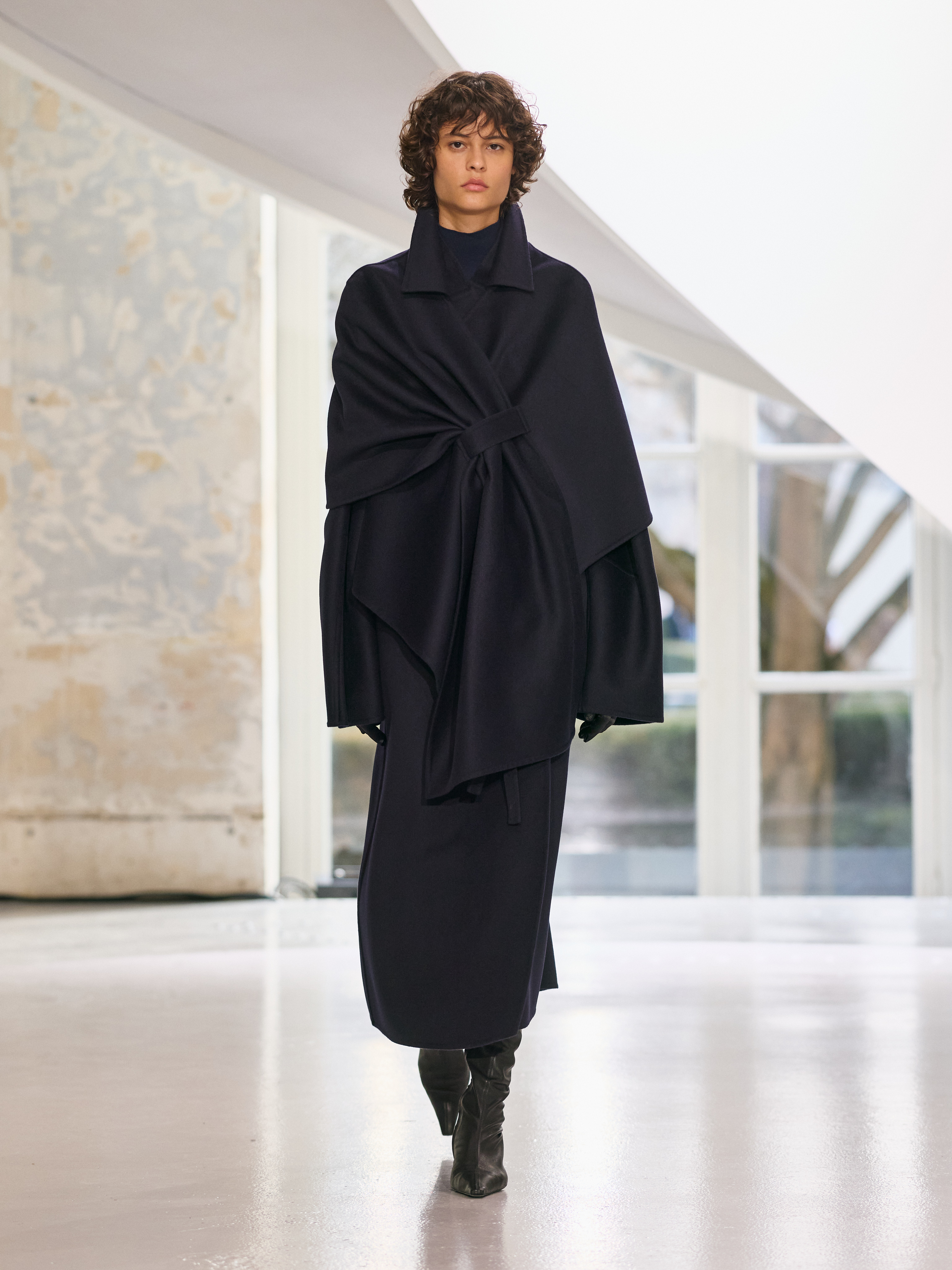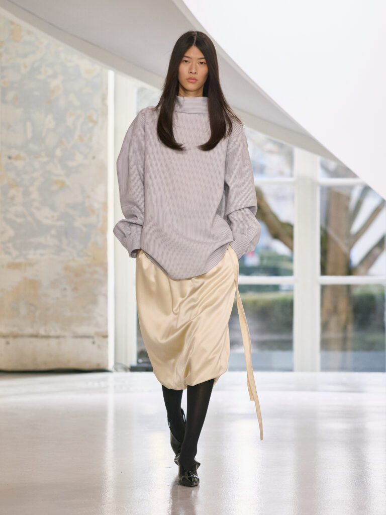 Satin introduces a subtle gleam. It slips between layers of wool, a reflection illuminating the depth of a heavy fold. Within these broad wool surfaces, it appears almost as light emerging from behind stone. The palette brings together timeless neutrals, raven black, ink blue, oyster shell and grey, with earthy browns and moss greens, punctuated by flashes of bright red and green. The folds unfurl through a system of loops placed at the waist or shoulder, releasing volume and allowing lines to shift and move. Balloon skirts play on the tension between delicacy and fullness, curving at the hem and flowing around the body.