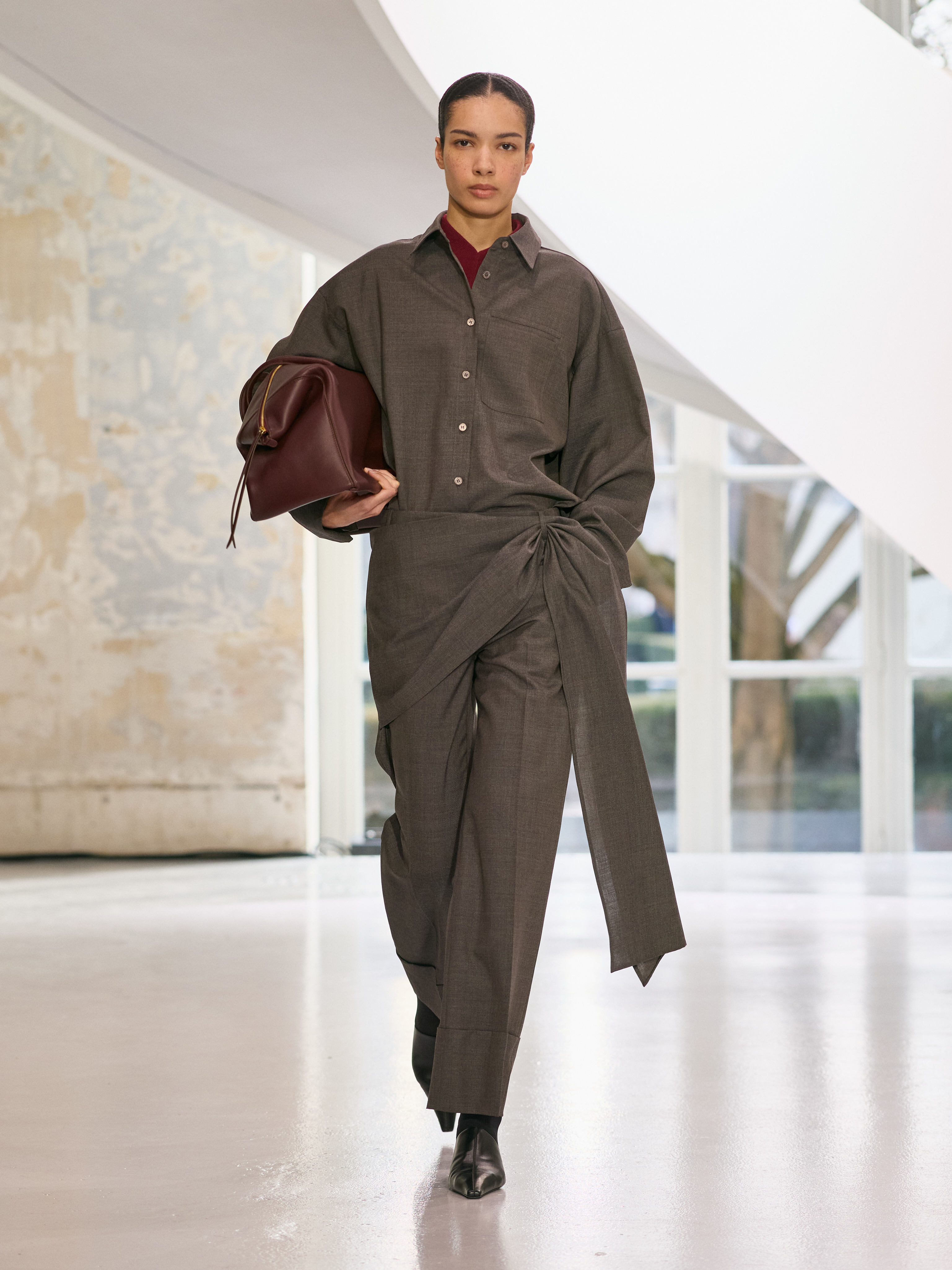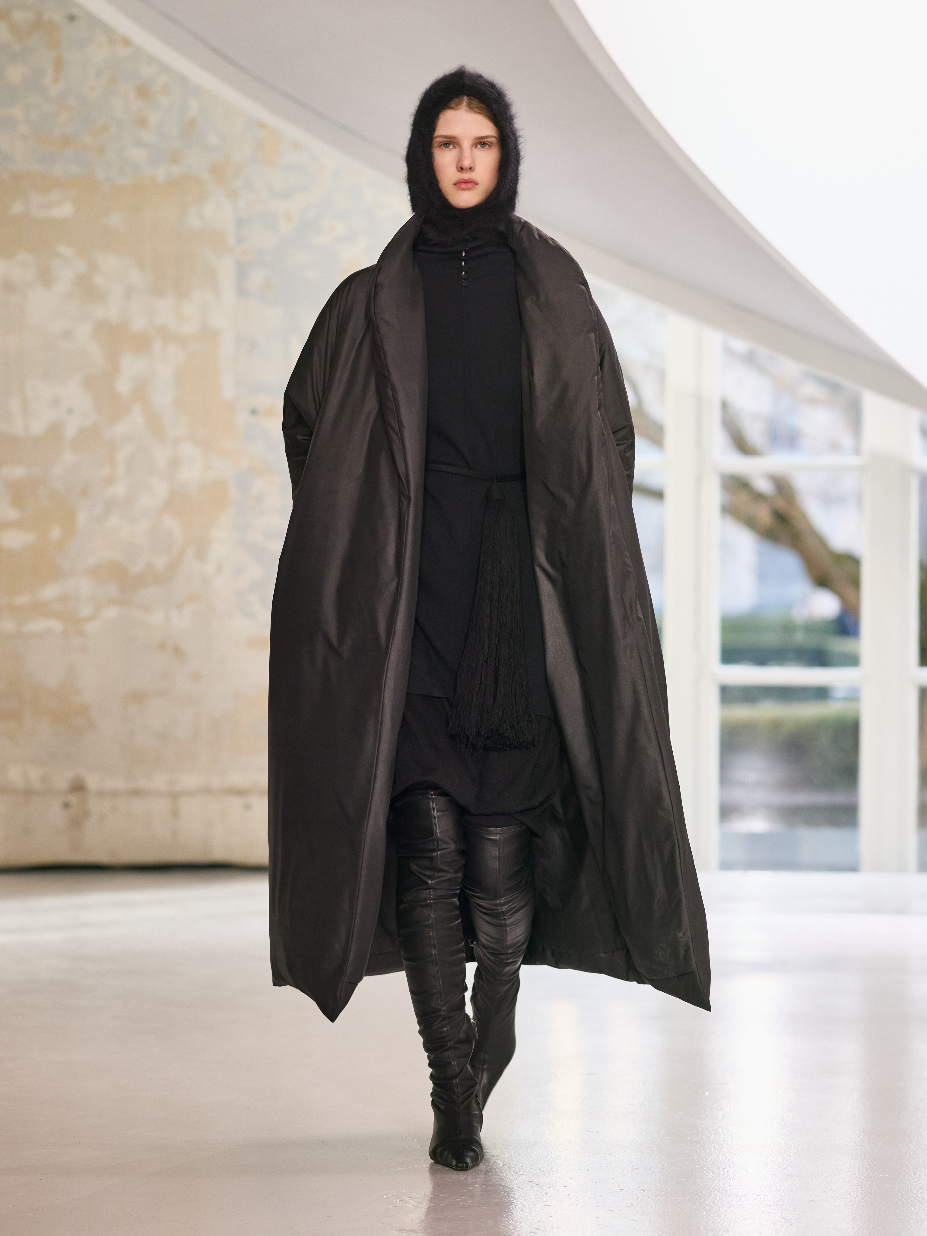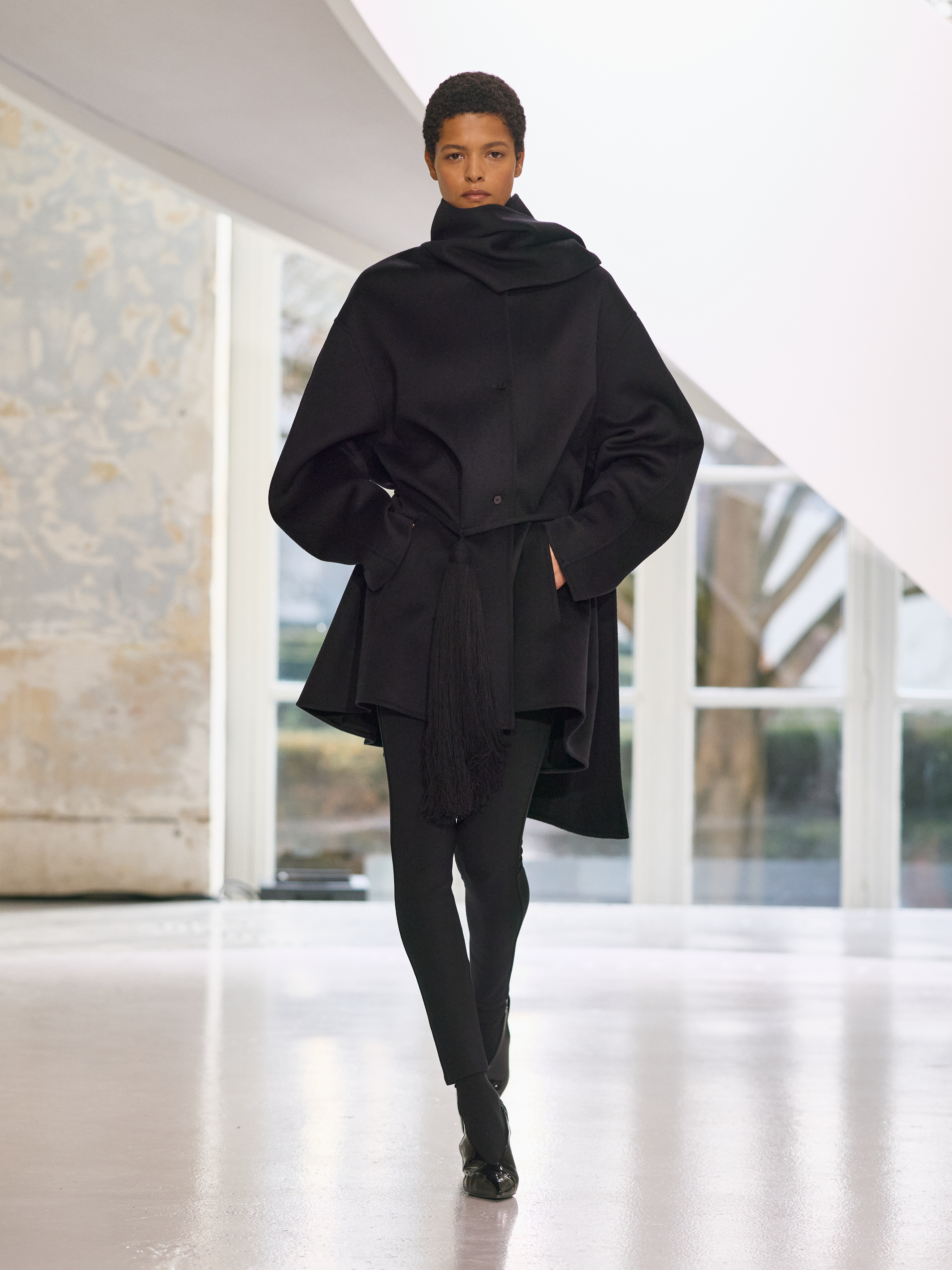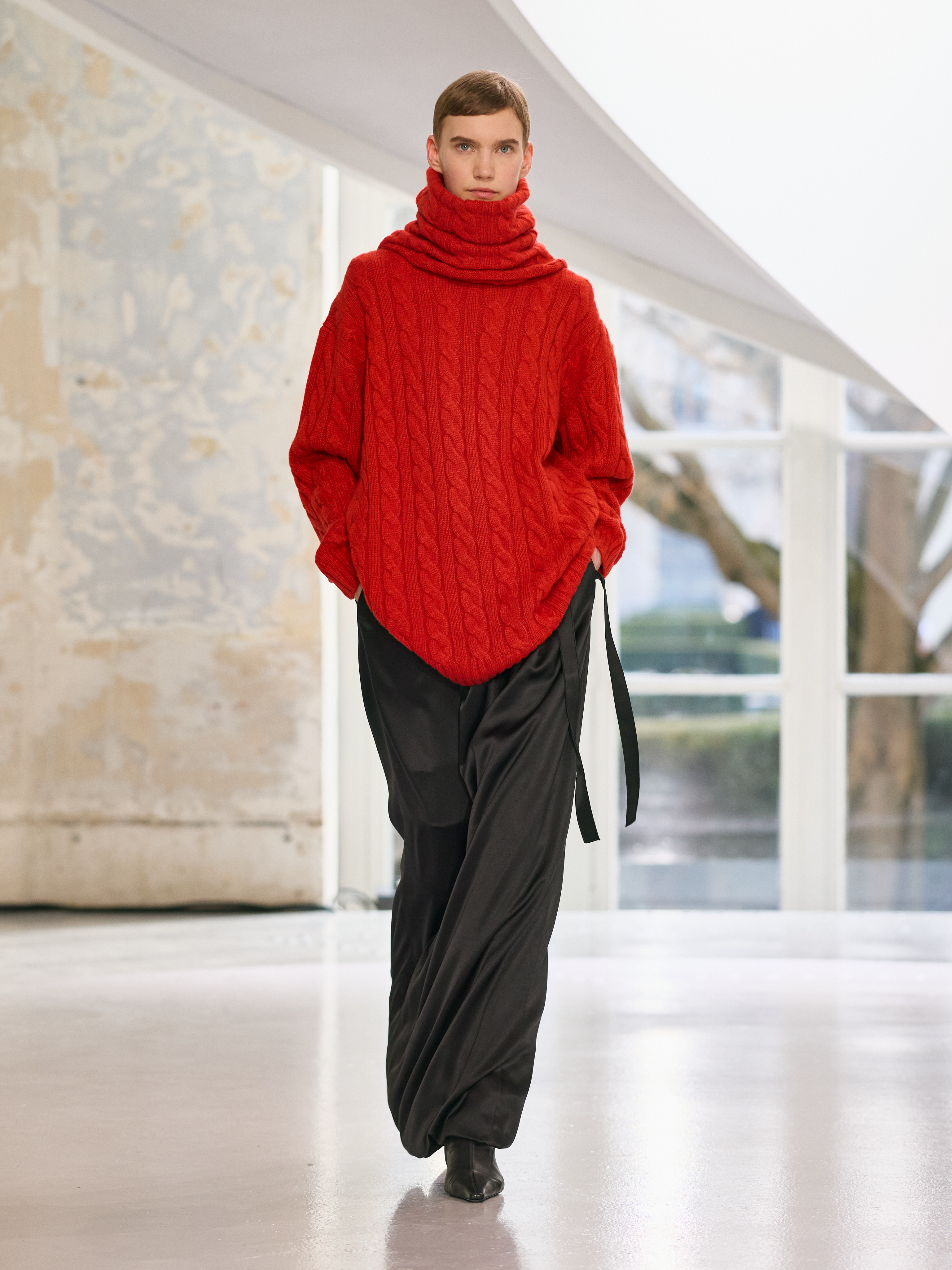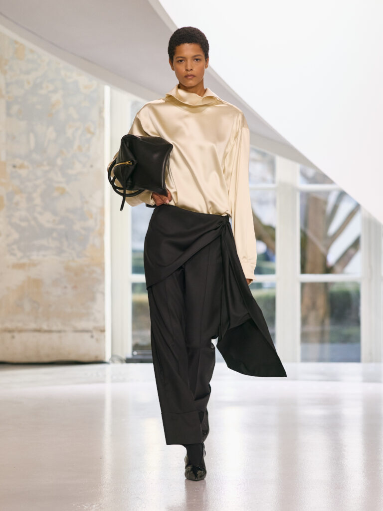 Satin introduces a subtle gleam. It slips between layers of wool, a reflection illuminating the depth of a heavy fold. Within these broad wool surfaces, it appears almost as light emerging from behind stone. The palette brings together timeless neutrals, raven black, ink blue, oyster shell and grey, with earthy browns and moss greens, punctuated by flashes of bright red and green. The folds unfurl through a system of loops placed at the waist or shoulder, releasing volume and allowing lines to shift and move. Balloon skirts play on the tension between delicacy and fullness, curving at the hem and flowing around the body.