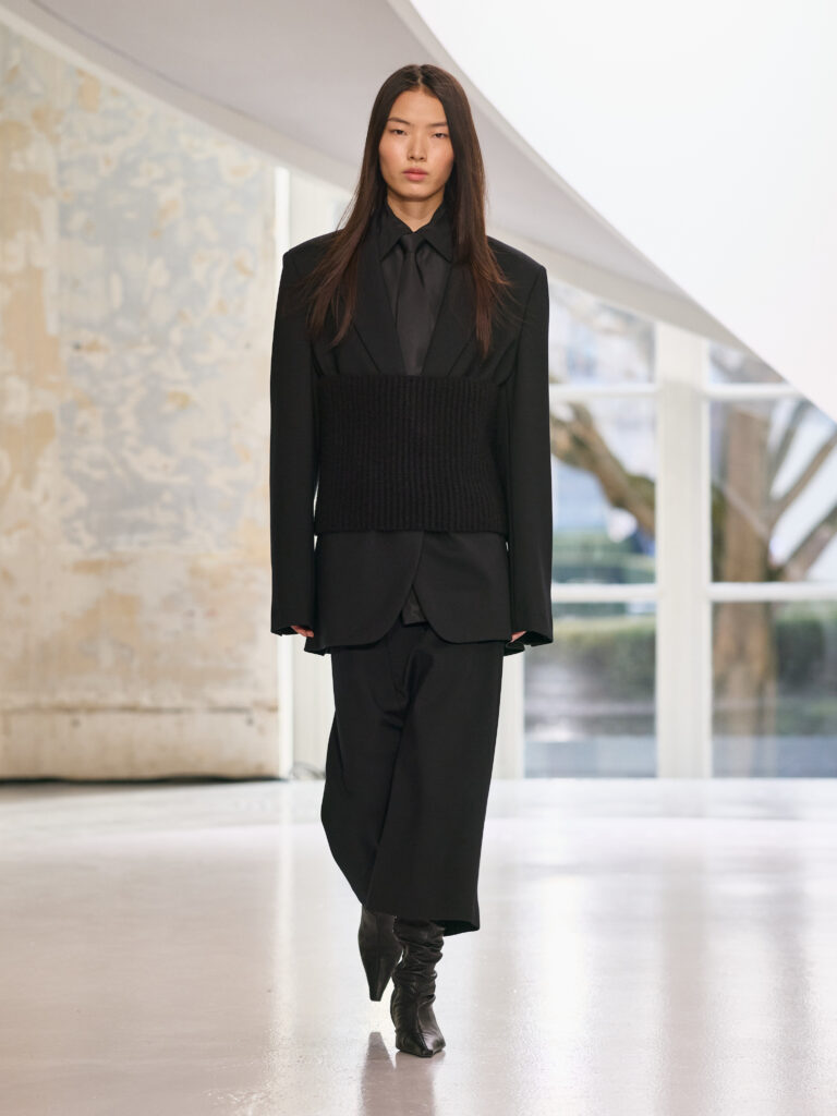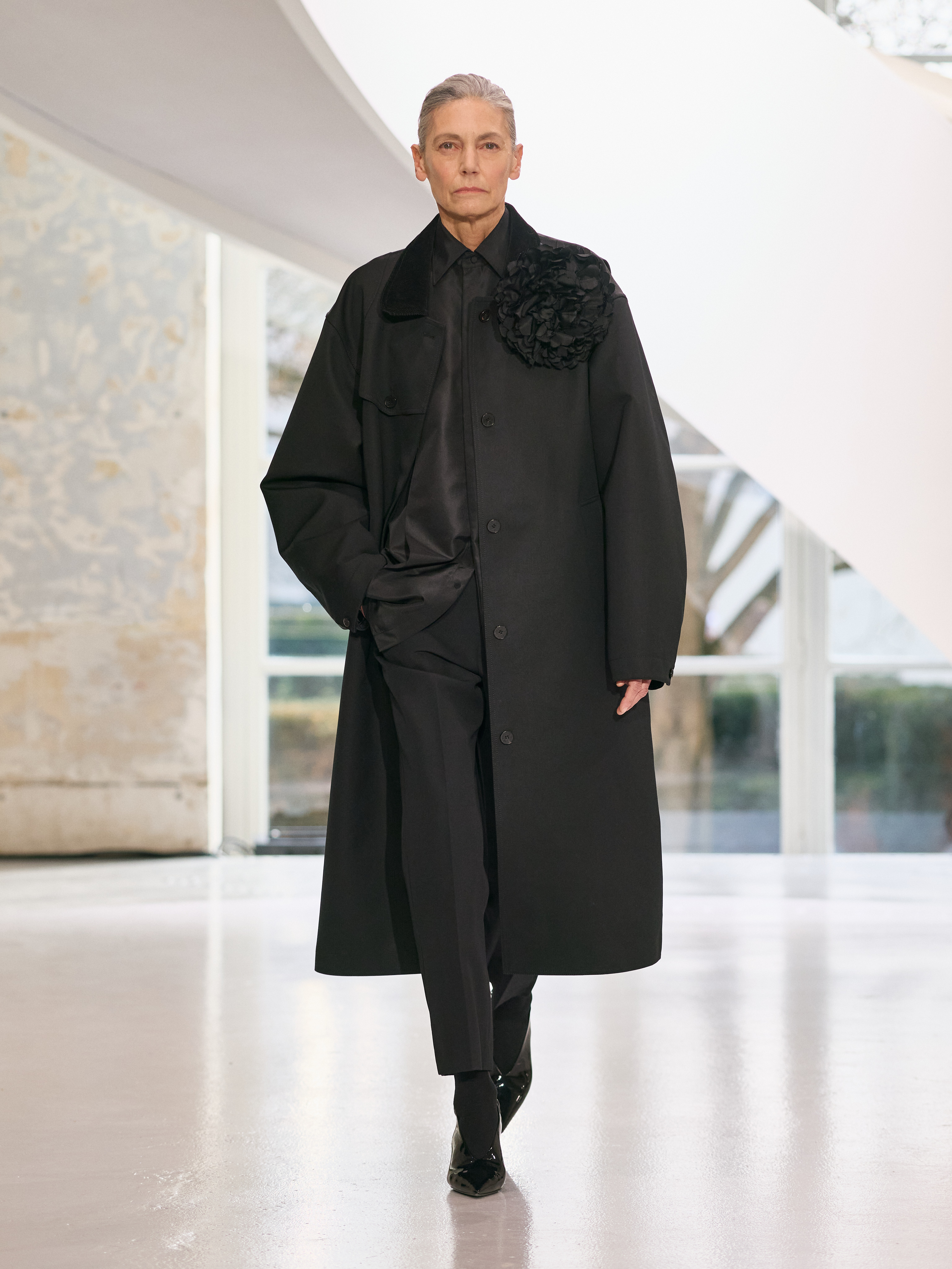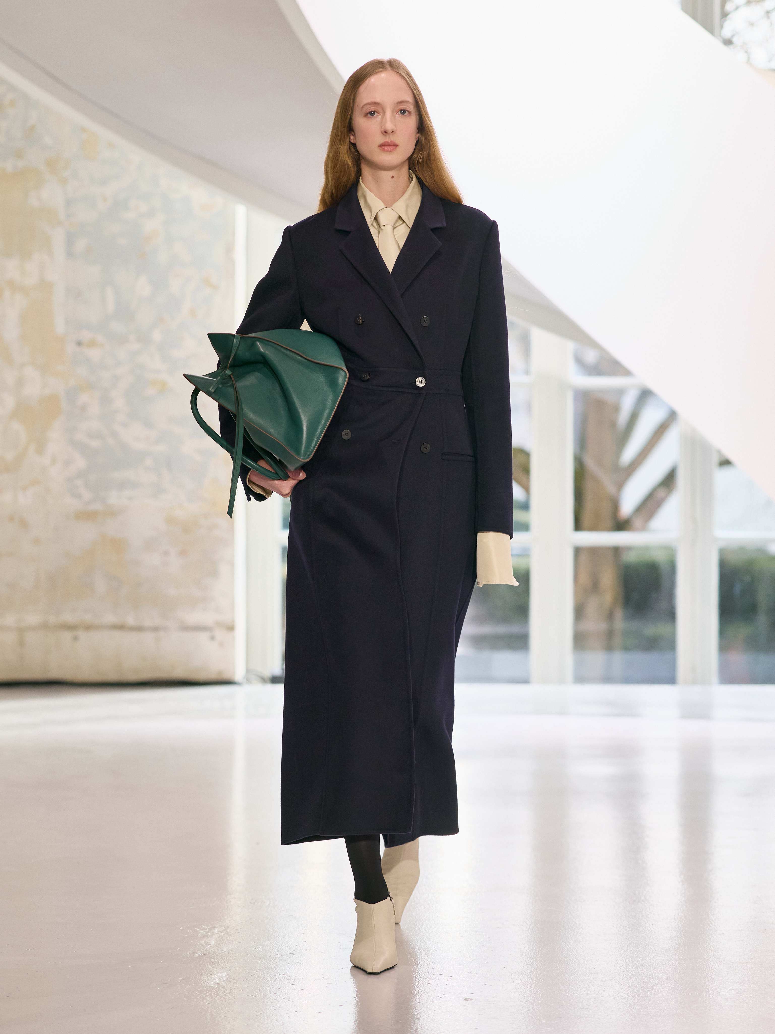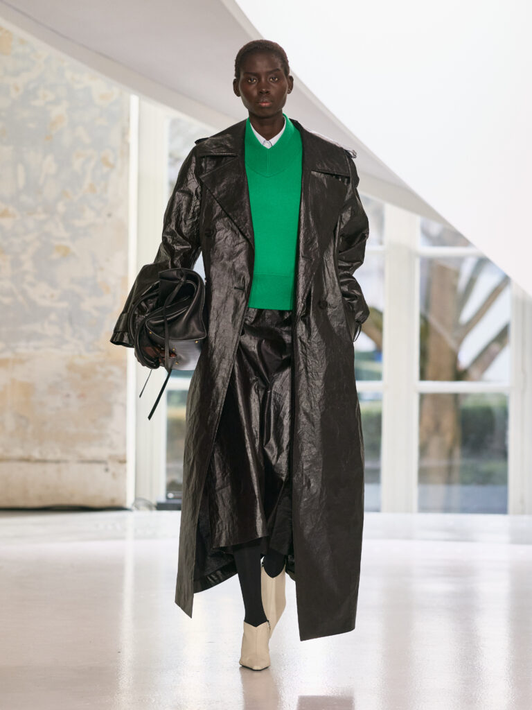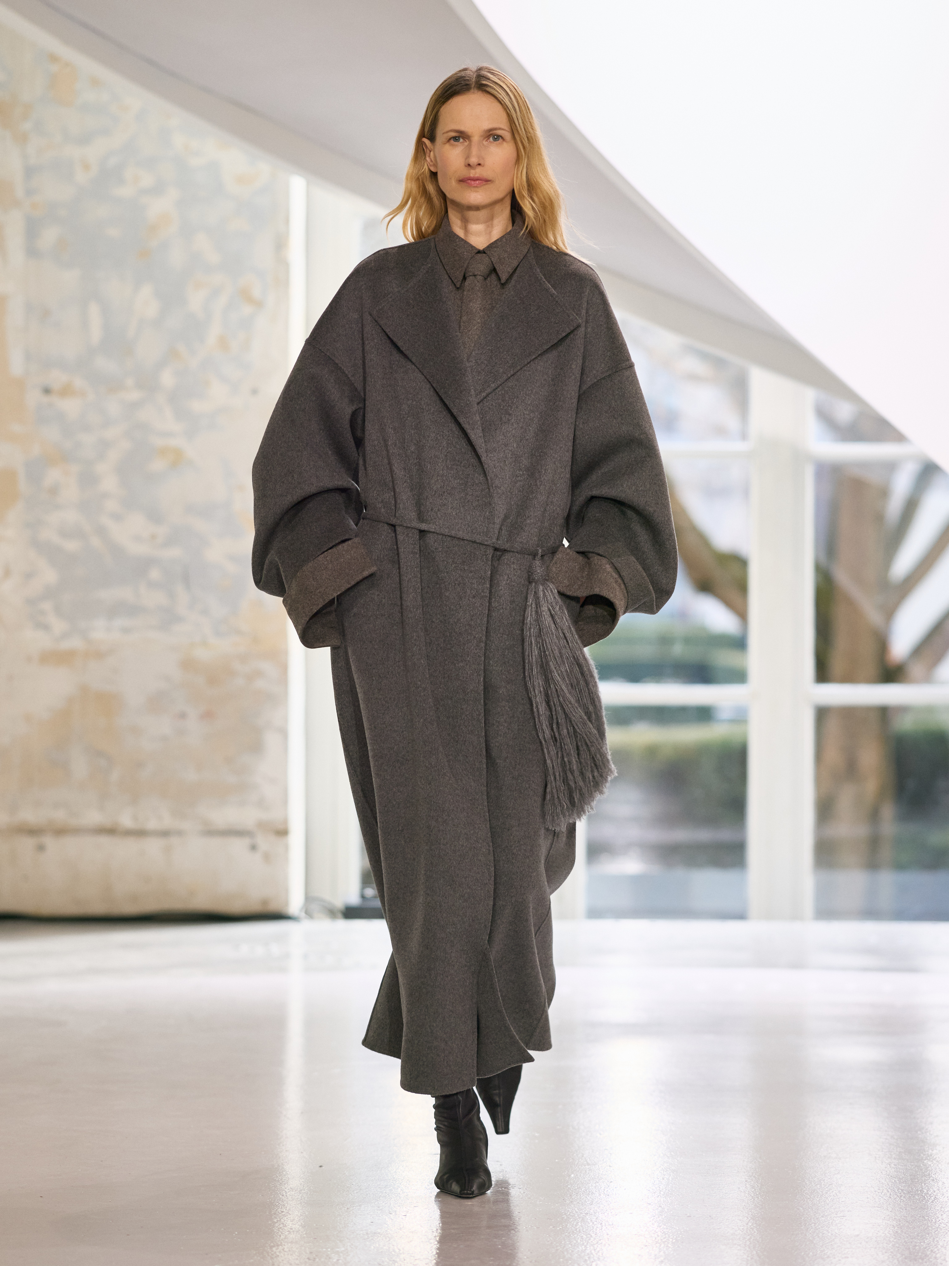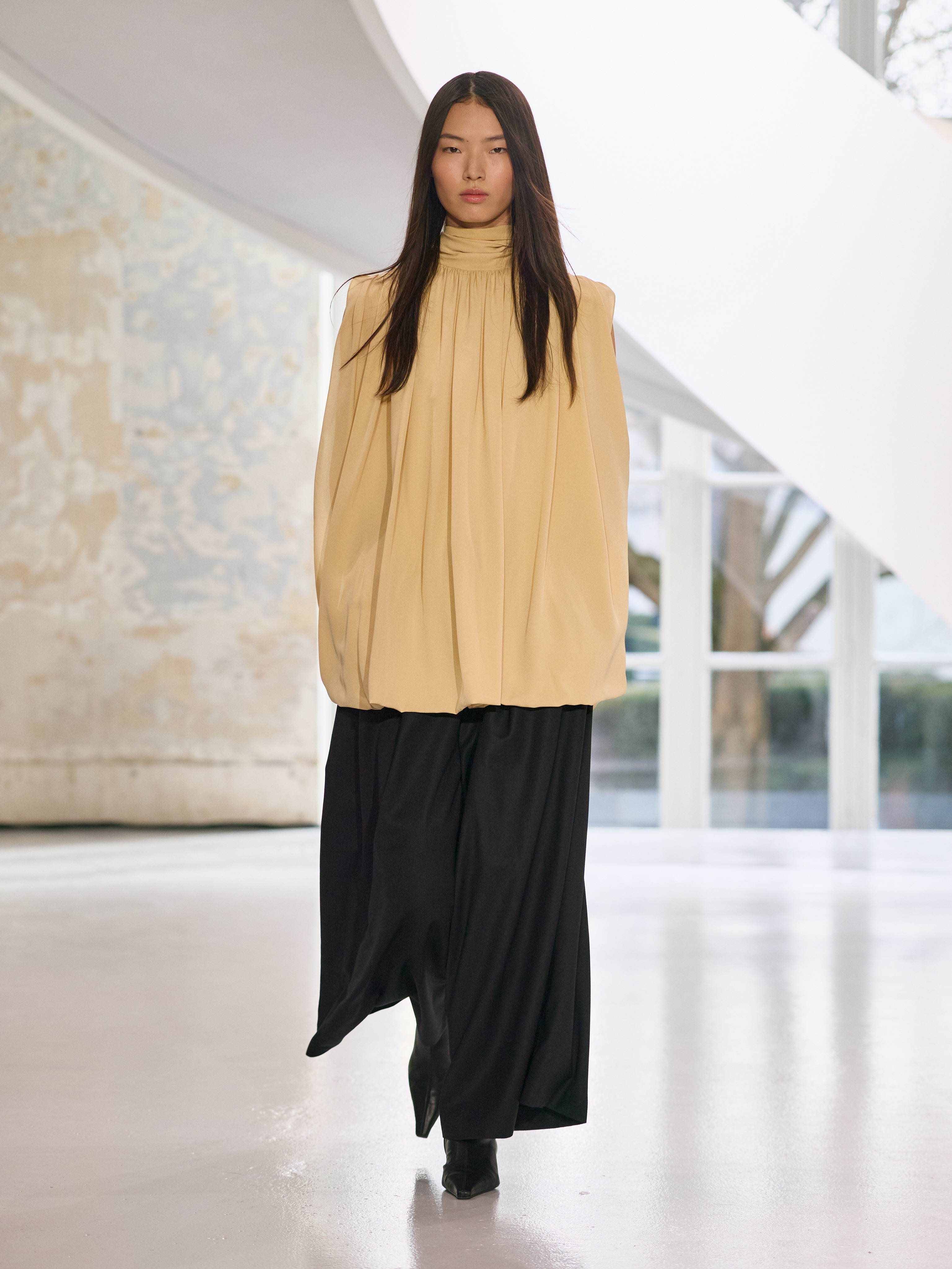 Satin introduces a subtle gleam. It slips between layers of wool, a reflection illuminating the depth of a heavy fold. Within these broad wool surfaces, it appears almost as light emerging from behind stone. The palette brings together timeless neutrals, raven black, ink blue, oyster shell and grey, with earthy browns and moss greens, punctuated by flashes of bright red and green. The folds unfurl through a system of loops placed at the waist or shoulder, releasing volume and allowing lines to shift and move. Balloon skirts play on the tension between delicacy and fullness, curving at the hem and flowing around the body.