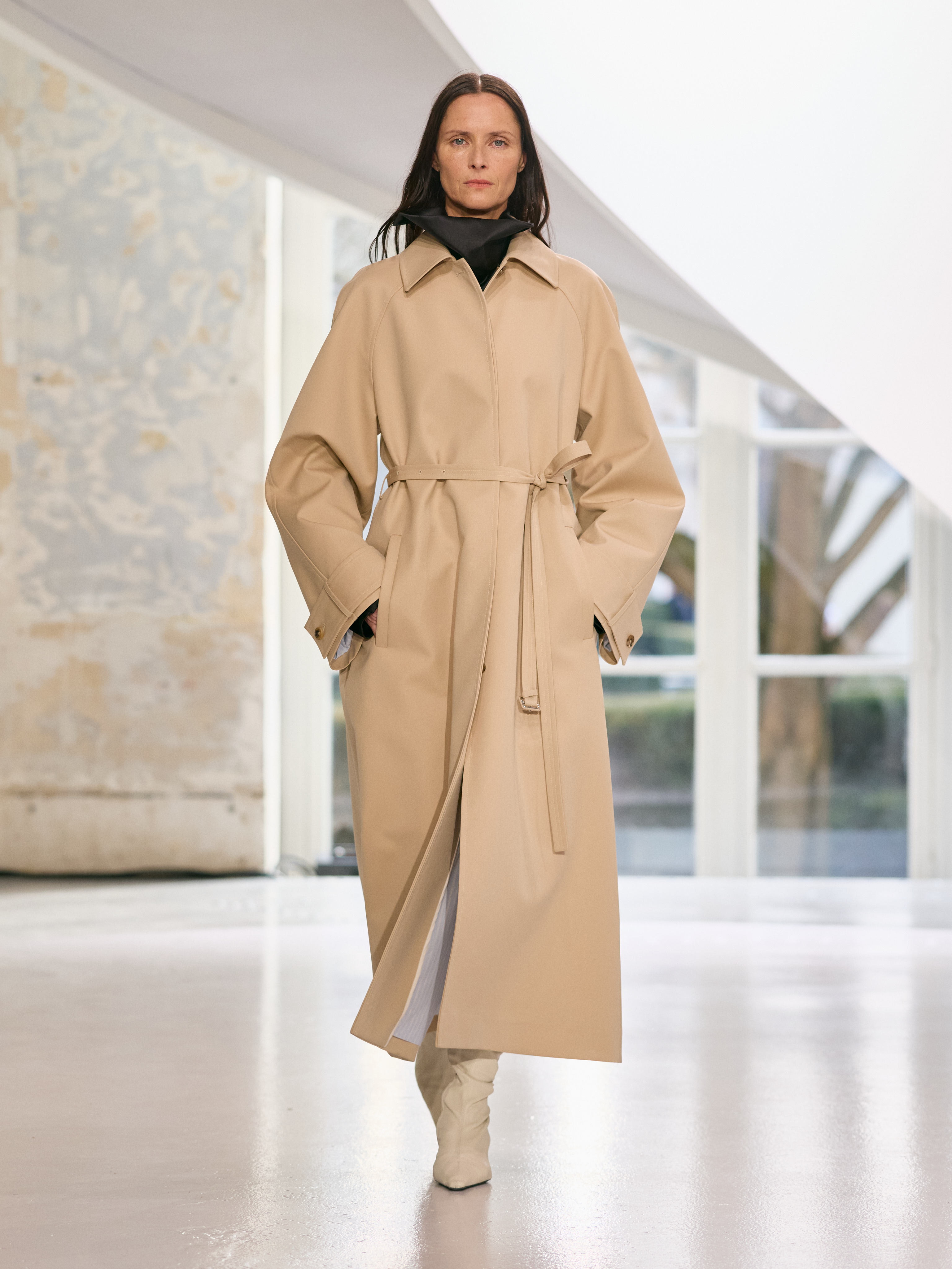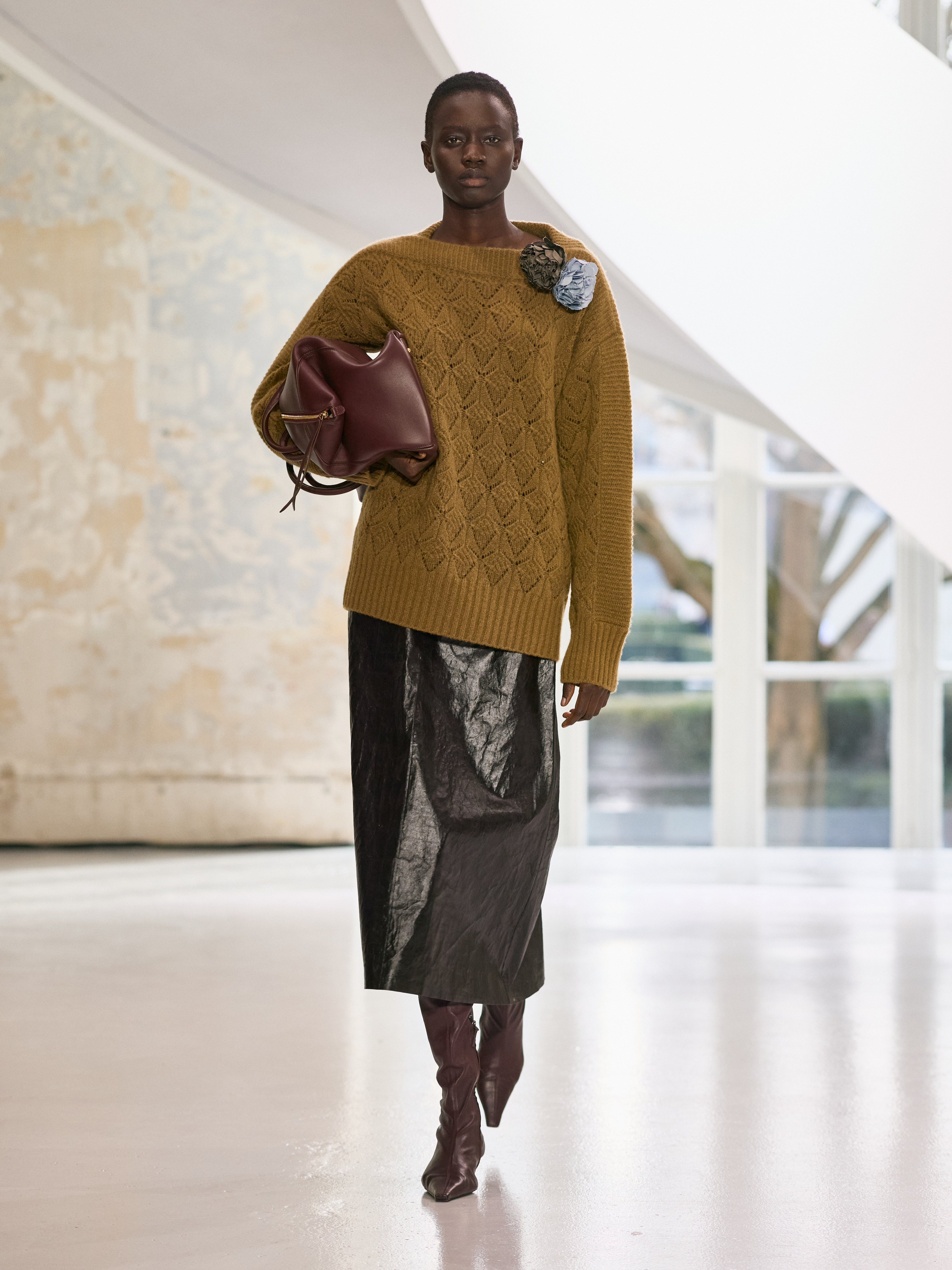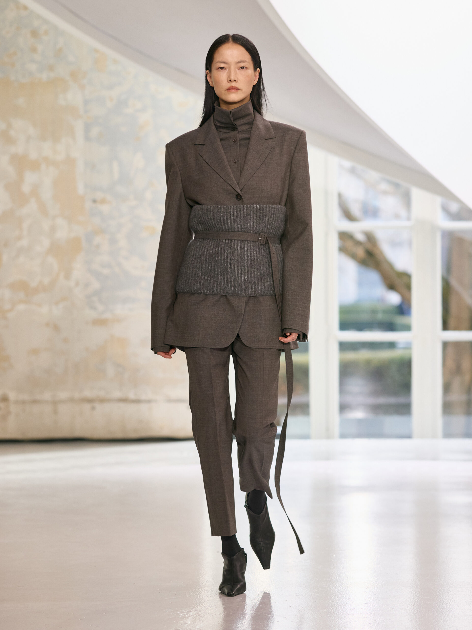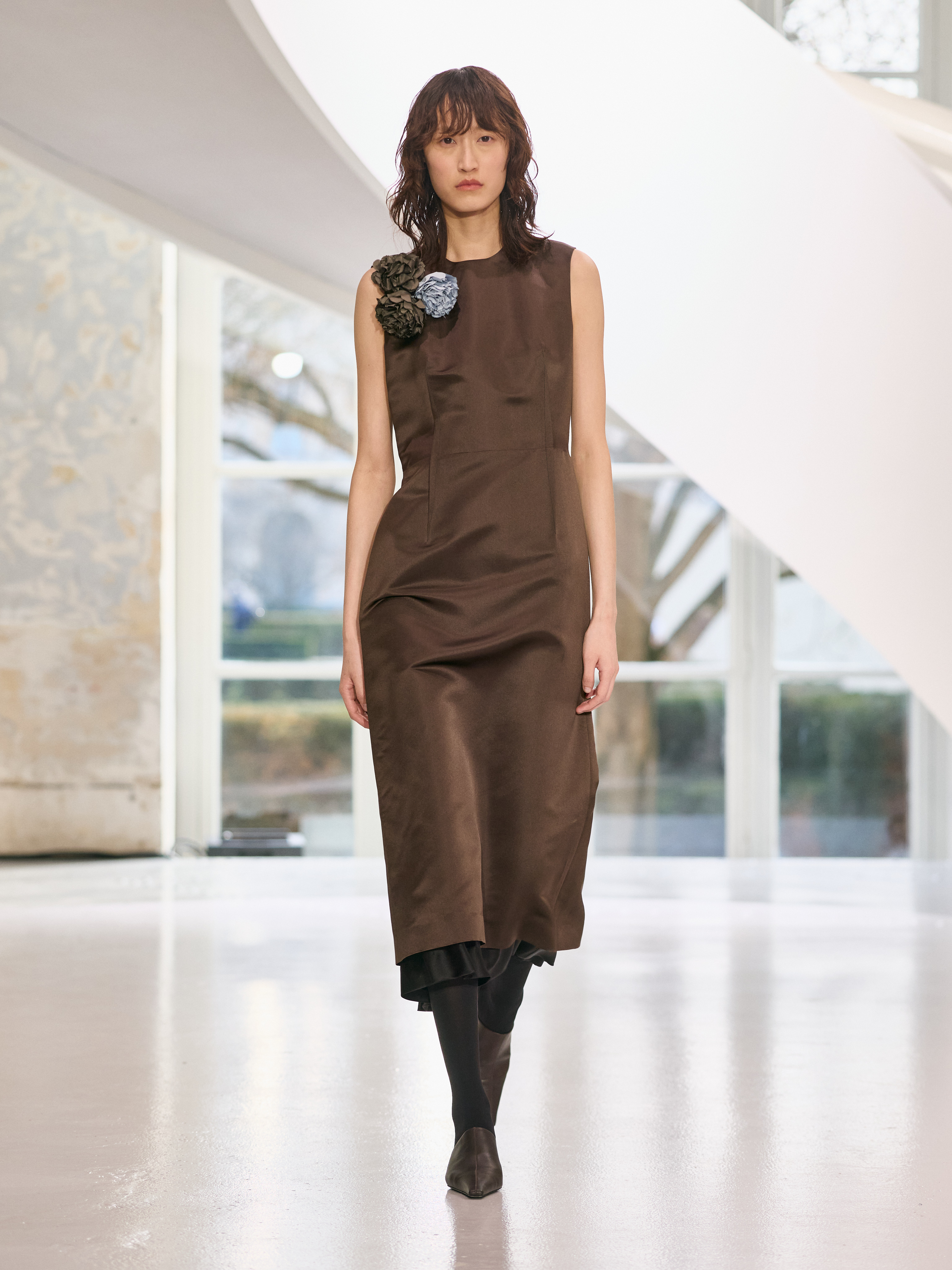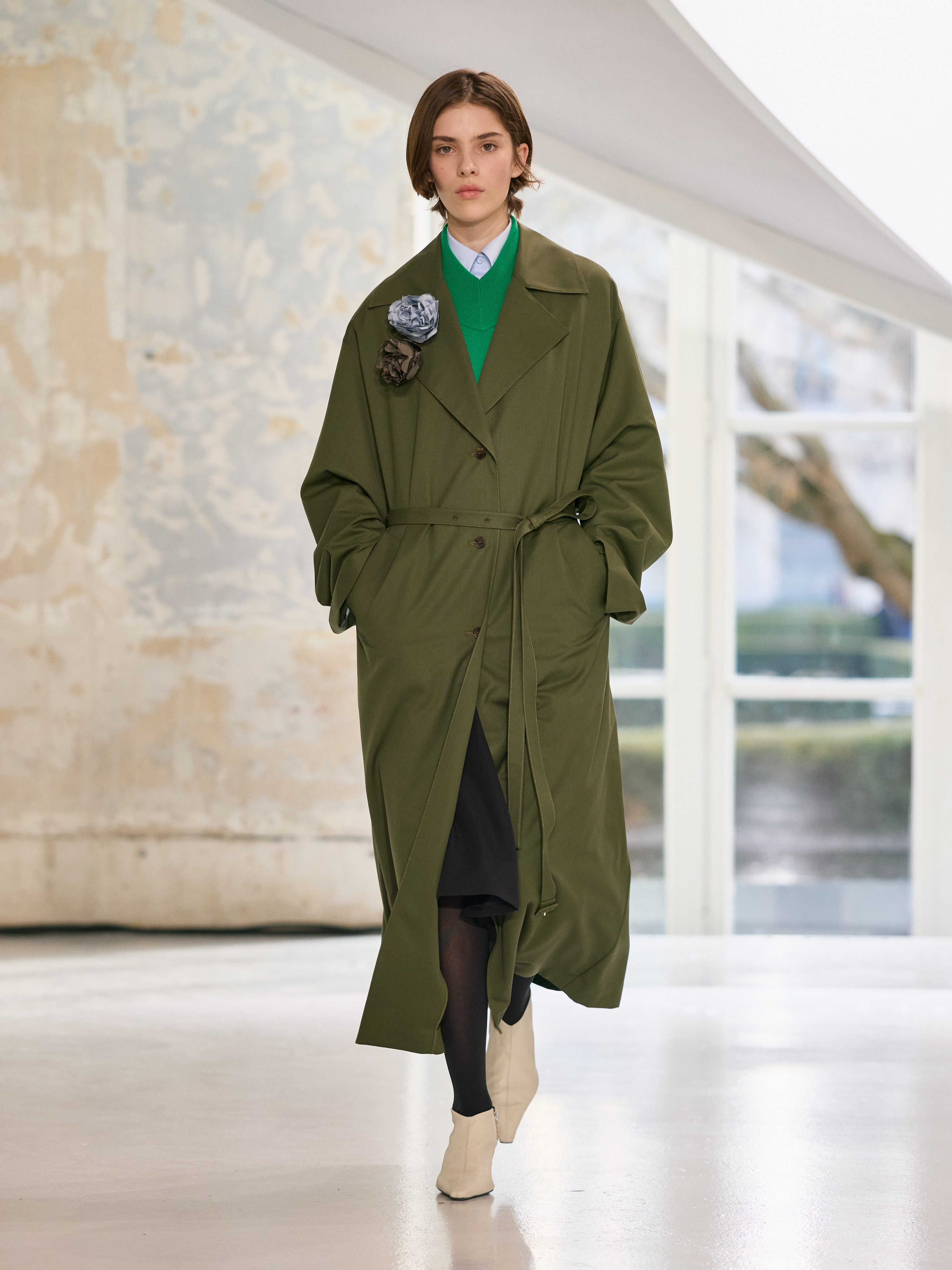 Satin introduces a subtle gleam. It slips between layers of wool, a reflection illuminating the depth of a heavy fold. Within these broad wool surfaces, it appears almost as light emerging from behind stone. The palette brings together timeless neutrals, raven black, ink blue, oyster shell and grey, with earthy browns and moss greens, punctuated by flashes of bright red and green. The folds unfurl through a system of loops placed at the waist or shoulder, releasing volume and allowing lines to shift and move. Balloon skirts play on the tension between delicacy and fullness, curving at the hem and flowing around the body.