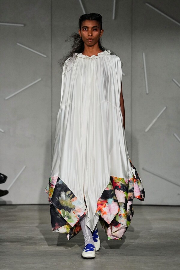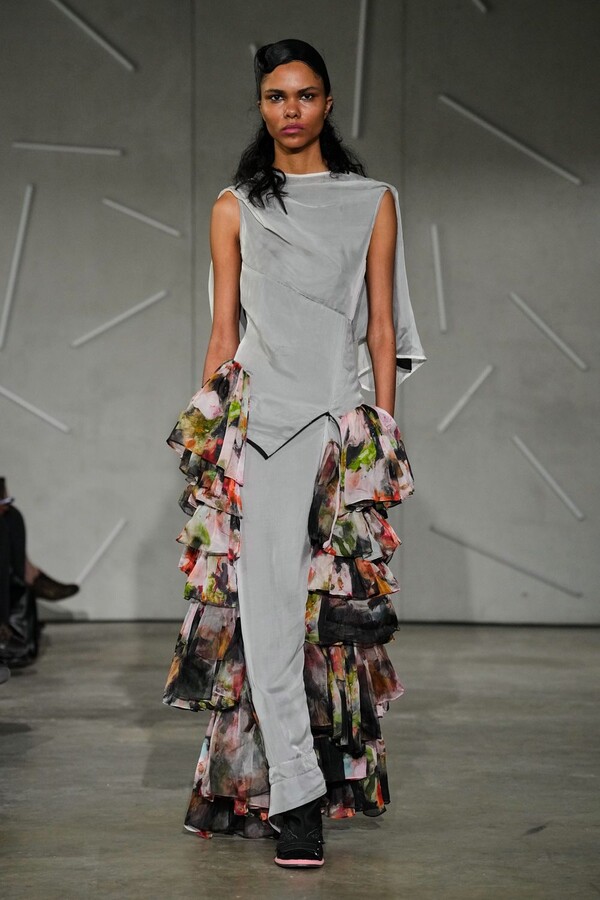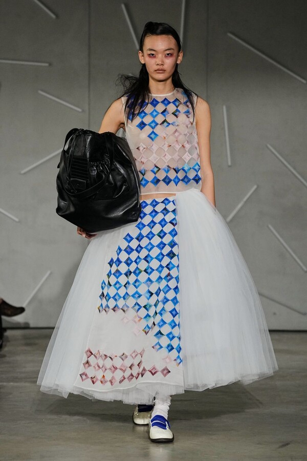 Personal history and fine art were woven directly into the materiality of the clothes, with delicate tulle printed with floral motifs derived from Caroline Hú’s own oil paintings. This painterly softness contributed to the collection’s broader fascination with collage and the blurring of motifs, a theme further emphasized by a visceral performance by choreographer Emma Portner. Portner’s movement highlighted the kinetic relationship between fabric and the human form, reinforcing the dialogue between fashion and dance that has become a hallmark of the Reverie by Caroline Hú identity.