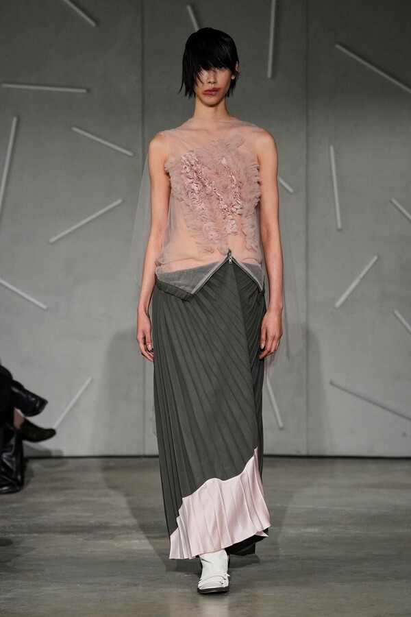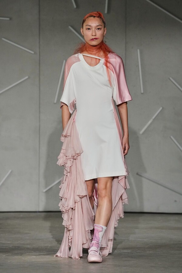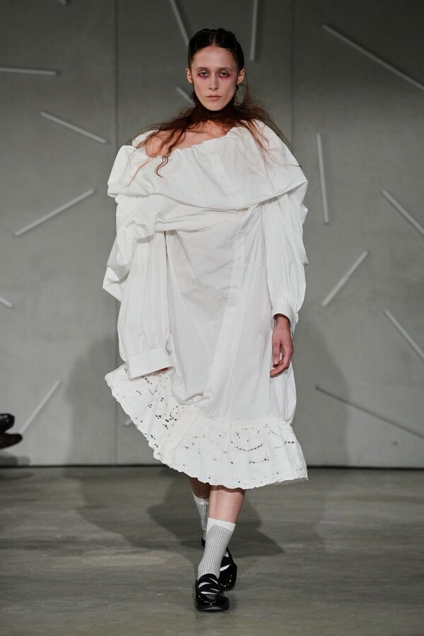 A standard T-shirt was elevated through the rigid, quilted structure of a Victorian corset, while shirtdresses were cleverly inverted with collars repositioned at the hem, and internal linings were brought to the surface to serve as bodices. Perhaps the most whimsical expression of this ethos was a playful minidress featuring integrated socks as pink paneling, a gesture that embraced the absurd with a confidence that kept the collection vibrating with unpredictability.