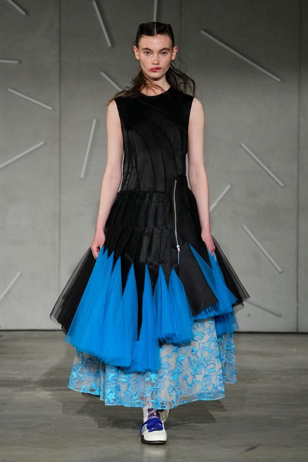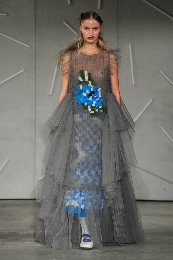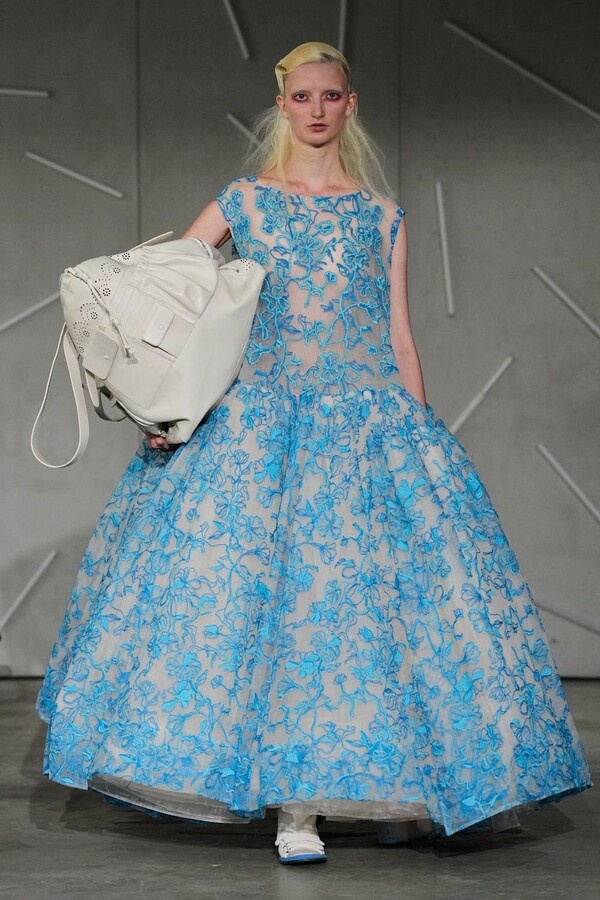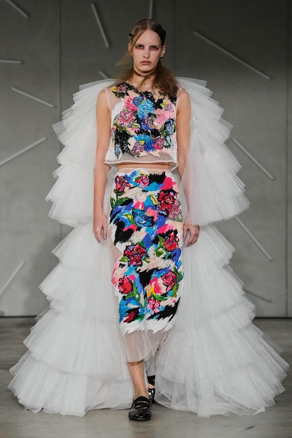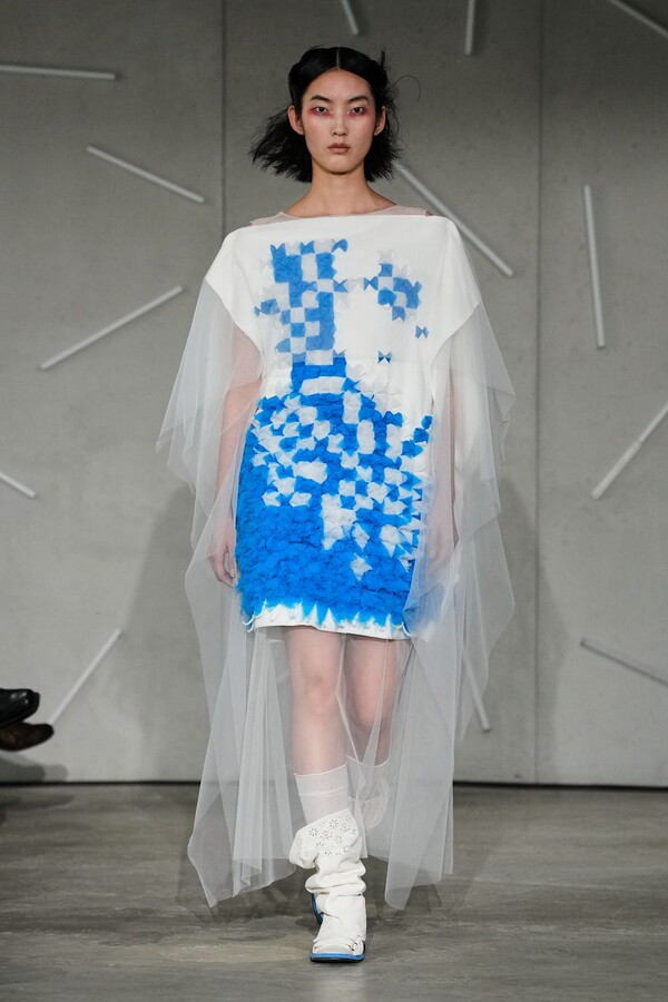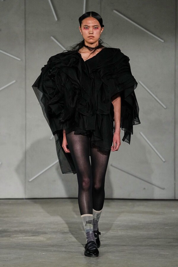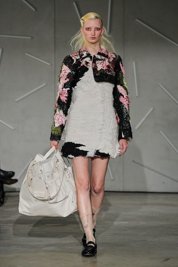 The true emotional weight of “Reverie” was found in Caroline Hú’s extraordinary surface treatments and embroidery. Jackets appeared to dissolve in real-time as stitches melted into the fabric, and organza dresses adorned with trompe l’oeil bows showcased her mastery over visual illusion. In a particularly striking moment, a sheer column dress appeared to pixelate, its tiny floral fragments shifting into digital-like geometry—a testament to Caroline Hú’s ability to bridge traditional handwork with a modern, almost algorithmic abstraction. This theme of revelation continued with a cropped black jacket worn inside out, exposing its intricate internal embroidery to the world and transforming the hidden process into the design itself.
