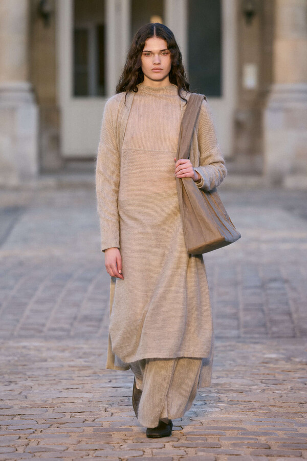 Material speaks as another form of language. Waxed cupro, a thin shadow on a summer afternoon, carries an ineffable sense of distance. Transparent cotton voile is air itself—vanishing at the touch, trembling like light across water. Coated linen holds the weight of time, yet shimmers under its film, as if memory itself had been burnished anew. Silk gleams with elusive light, like the last rays breaking through clouds at dusk. Cashmere, mohair and silk, crossed in floating stitches, lines that whisper, extending rhythm, drawing still cloth into motion.