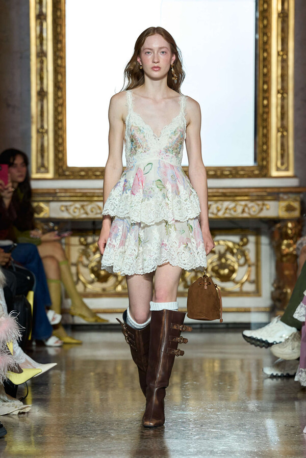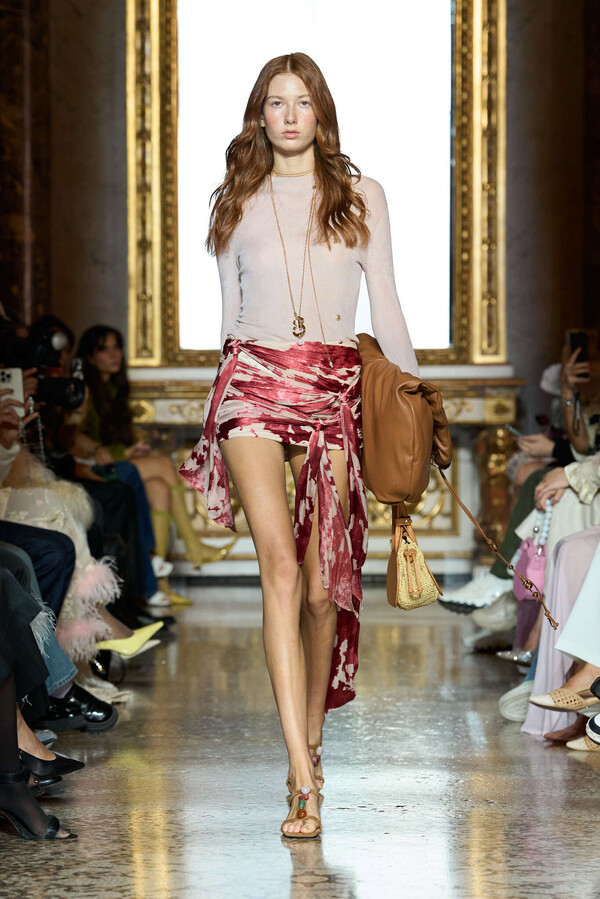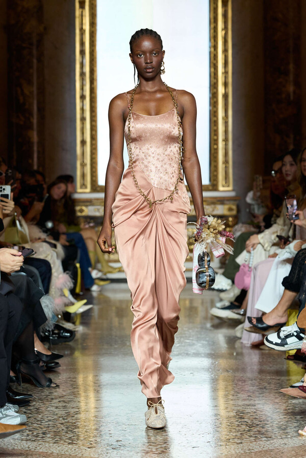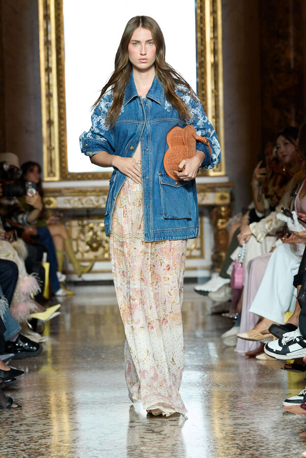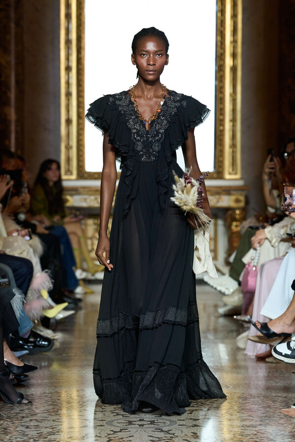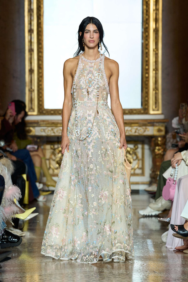 The color palette reflects the vibrancy of the season: luminous bases of white, ivory, and blush are enriched by floral tones such as chrysanthemum yellow, cardamom green, and soft orchid lilac and pink. Accents of blue and metallic highlights in silver and gold add depth, evoking water and summer light. Materials and craftsmanship lie at the heart of the collection, reaffirming the brand’s artisanal DNA. Silks and jacquards feature hand-painted floral motifs and laser-cut detailing. Haute couture embroidery takes center stage: shimmering glass beadwork, narrative-driven Indian embroidery, and sequins applied with the precision of fine jewelry. A notable innovation this season is the use of traditional Chinese cord weaving, recognized as intangible cultural heritage, which creates three- dimensional floral structures with a striking sculptural effect.