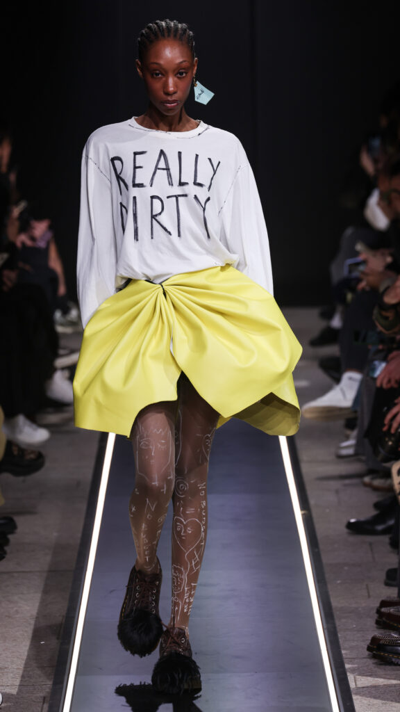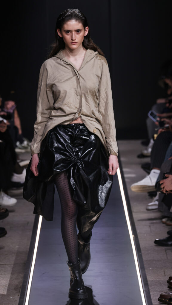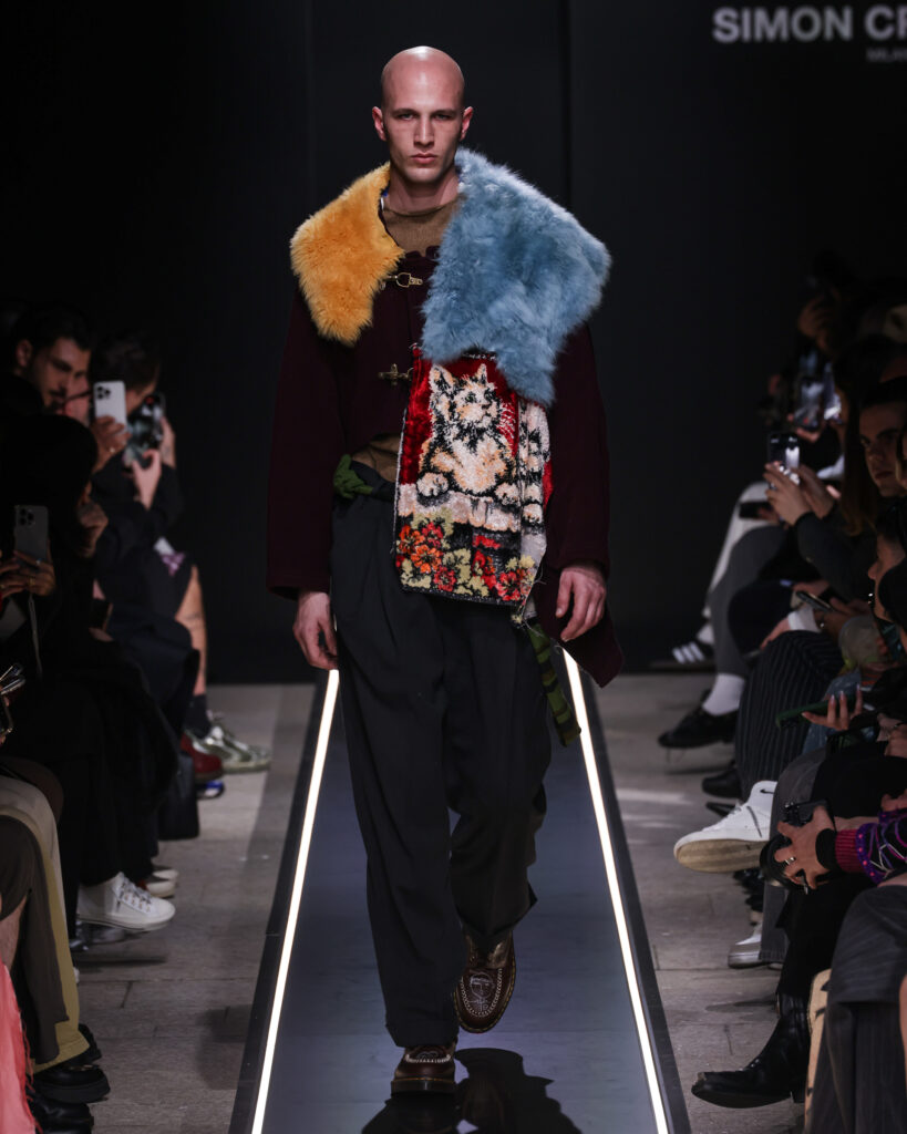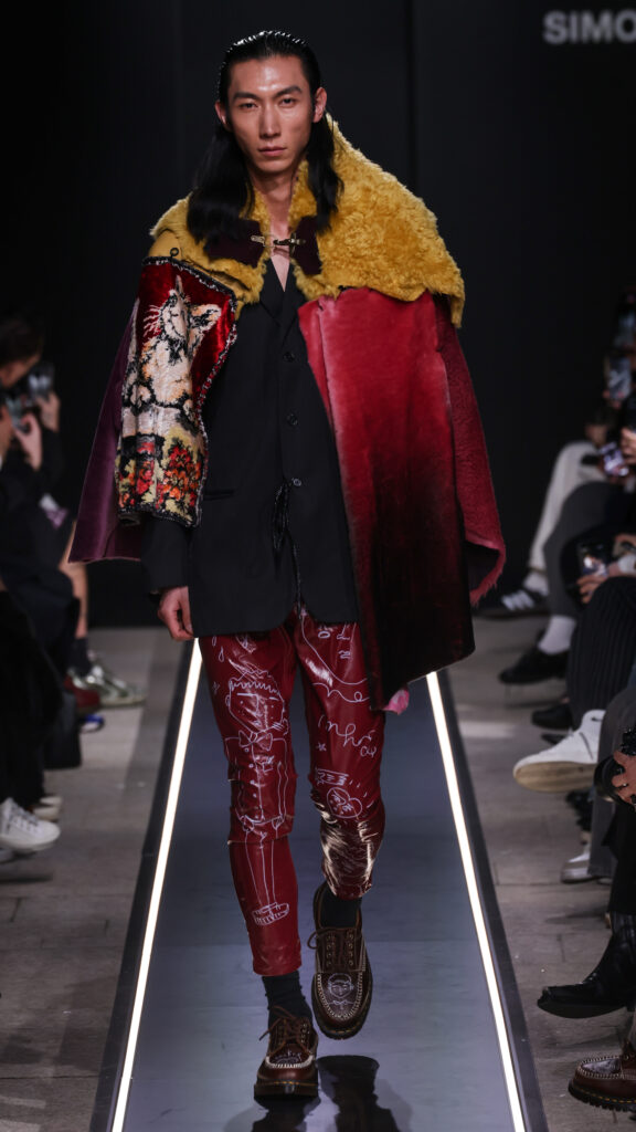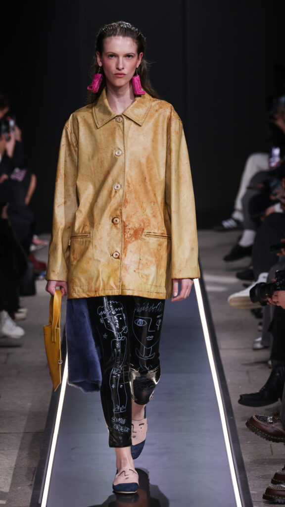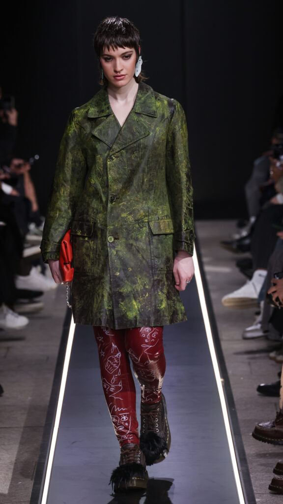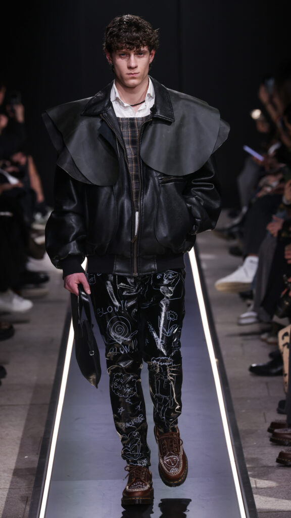 Nostalgia for Miuccia, Hand-graffitied, shiny PVC skinny jeans, Glove shoes, feathered shoes, lingerie boots and fur boots, and cracker boy shoes. Asthma inhaler earrings and hand-painted leather earrings, Tailored men’s suits with bow tie shorts, Eighteenth-century leather tutus, Hand-stained dressesFirstly, I would like to thank Linea Pelle and Unico for making this show possible and for their support over the past few months while I was researching materials and organising the collection. Special thanks go to Fulvia Bacchi, who believes in the new generation of creatives and supports us. Thank you once again to Carlo Capasa and the National Chamber of Italian Fashion for making all this possible by believing in independent entities such as Simon Cracker, which, despite facing challenges, feel compelled to share their story and offer an alternative approach to fashion. Thanks also to Camera Moda Fashion Trust, which assists, advises and fights for those who are still marginalised within the fashion system. Thanks also to the Simon Cracker Crew and the family that keeps the brand alive and authentic by reflecting the times we are living in in the best possible way.