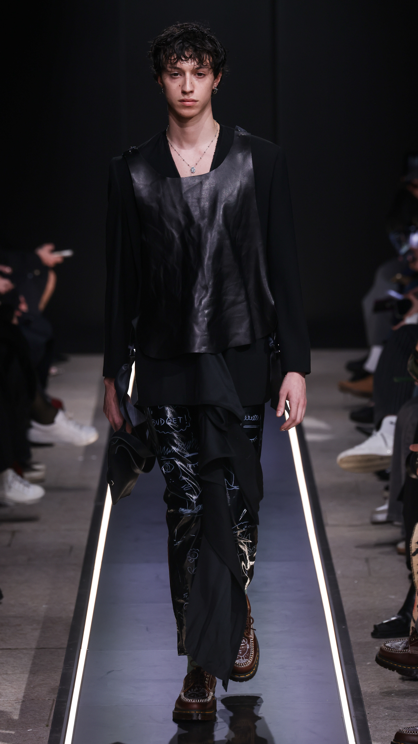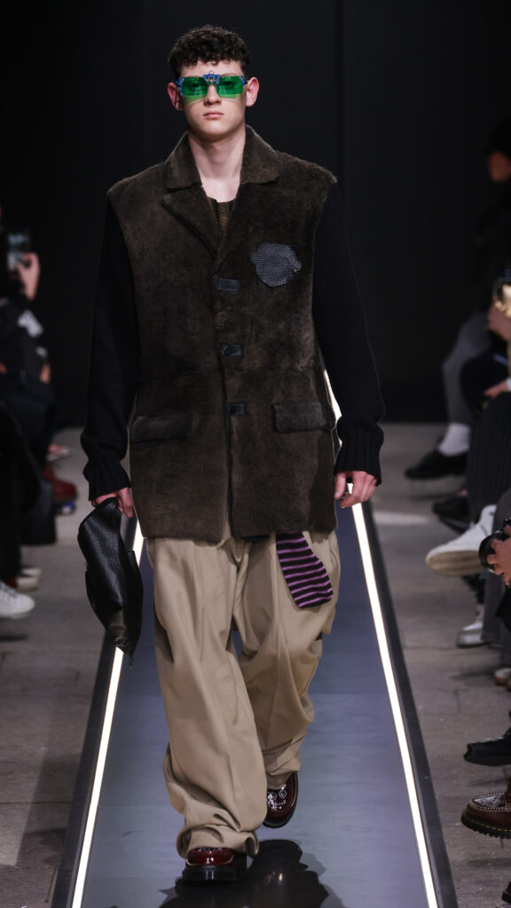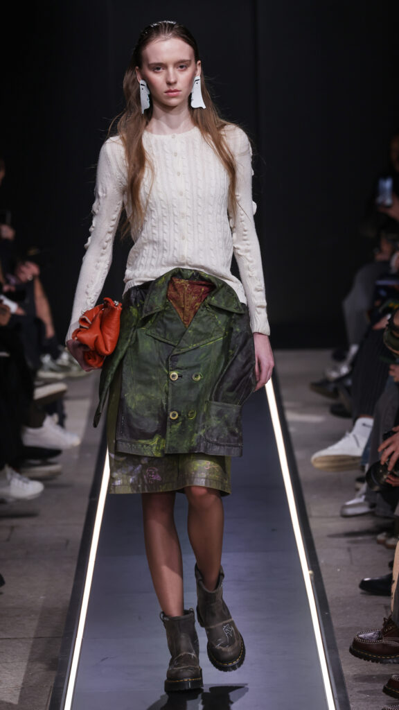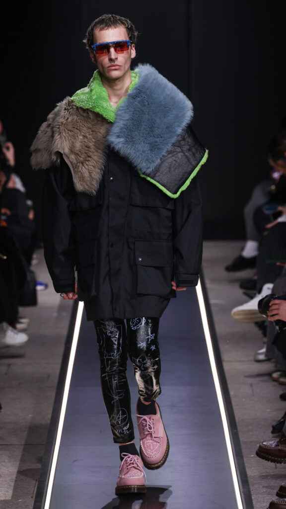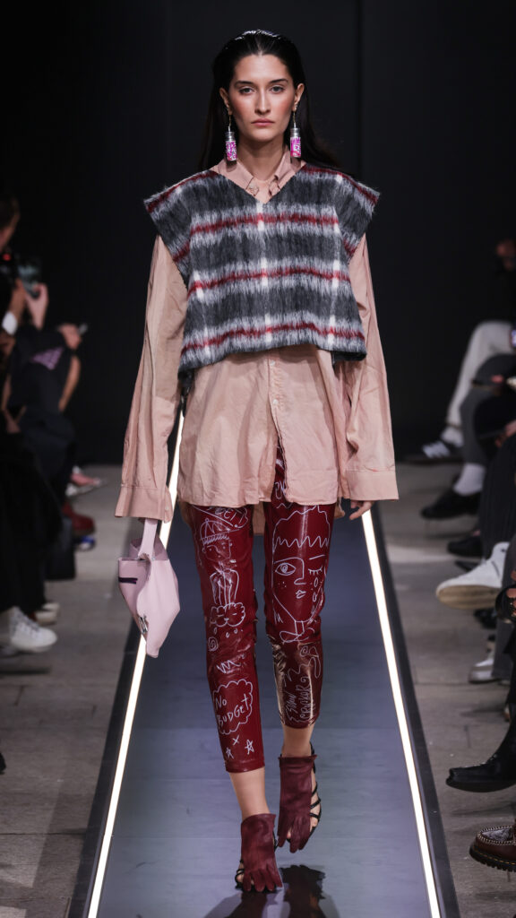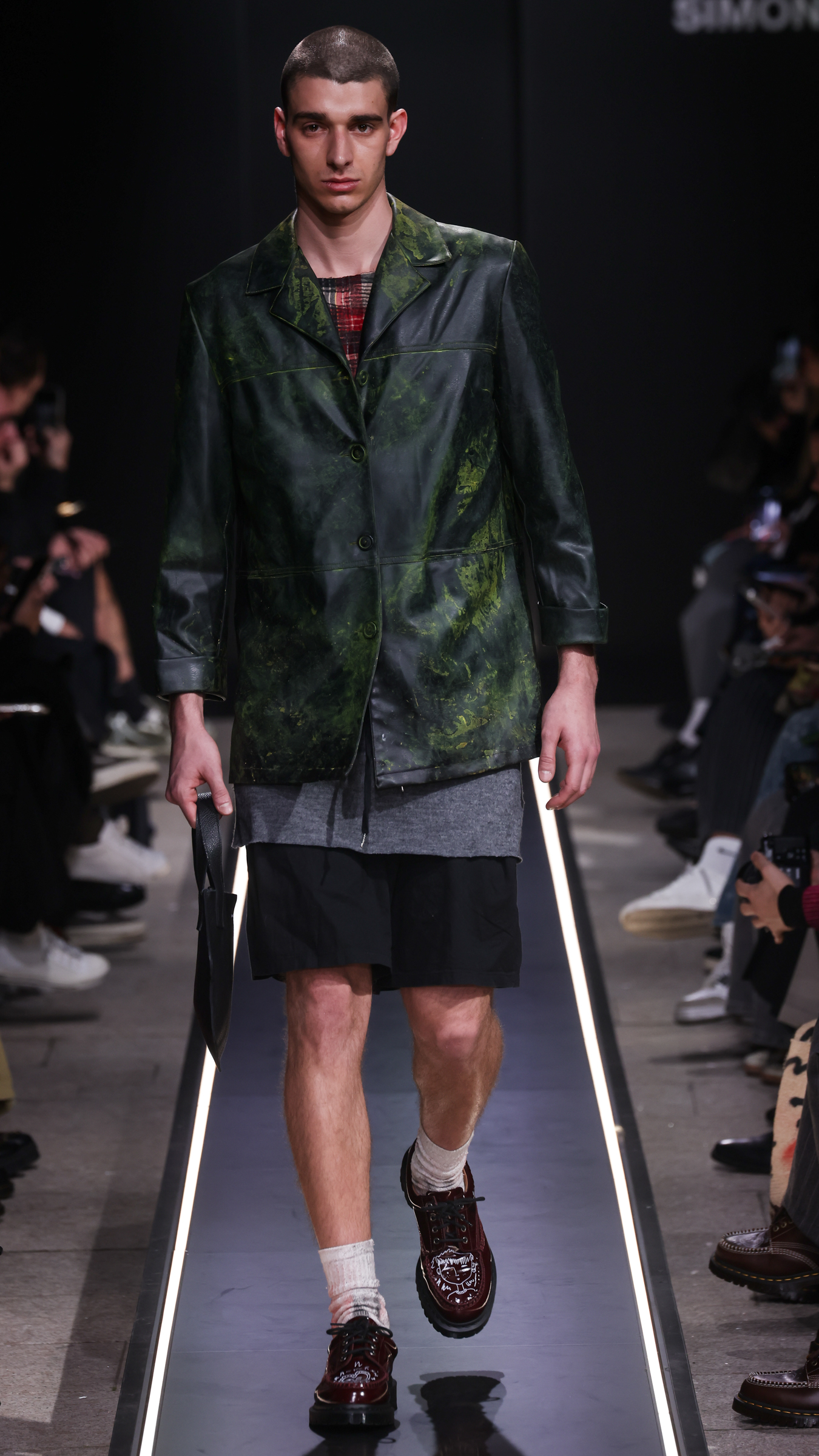 Nostalgia for Miuccia, Hand-graffitied, shiny PVC skinny jeans, Glove shoes, feathered shoes, lingerie boots and fur boots, and cracker boy shoes. Asthma inhaler earrings and hand-painted leather earrings, Tailored men’s suits with bow tie shorts, Eighteenth-century leather tutus, Hand-stained dressesFirstly, I would like to thank Linea Pelle and Unico for making this show possible and for their support over the past few months while I was researching materials and organising the collection. Special thanks go to Fulvia Bacchi, who believes in the new generation of creatives and supports us. Thank you once again to Carlo Capasa and the National Chamber of Italian Fashion for making all this possible by believing in independent entities such as Simon Cracker, which, despite facing challenges, feel compelled to share their story and offer an alternative approach to fashion. Thanks also to Camera Moda Fashion Trust, which assists, advises and fights for those who are still marginalised within the fashion system. Thanks also to the Simon Cracker Crew and the family that keeps the brand alive and authentic by reflecting the times we are living in in the best possible way.