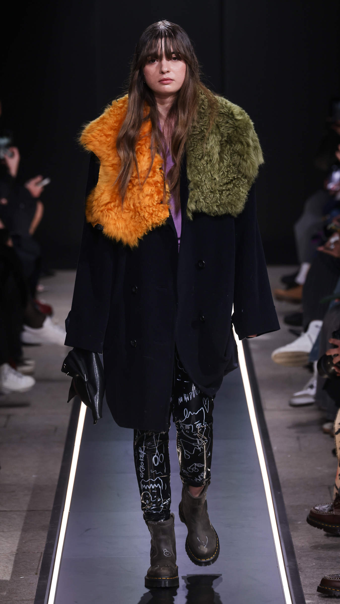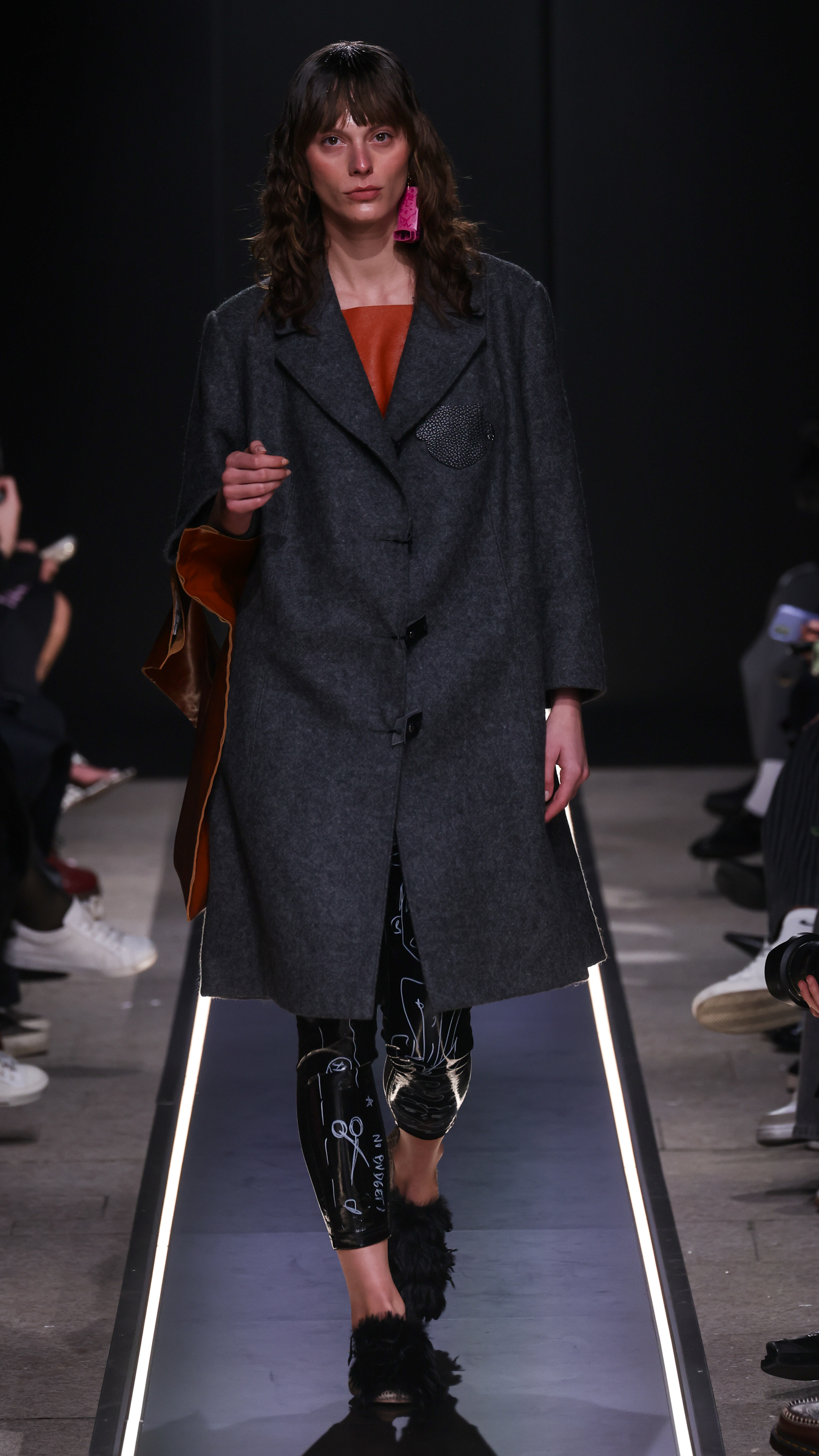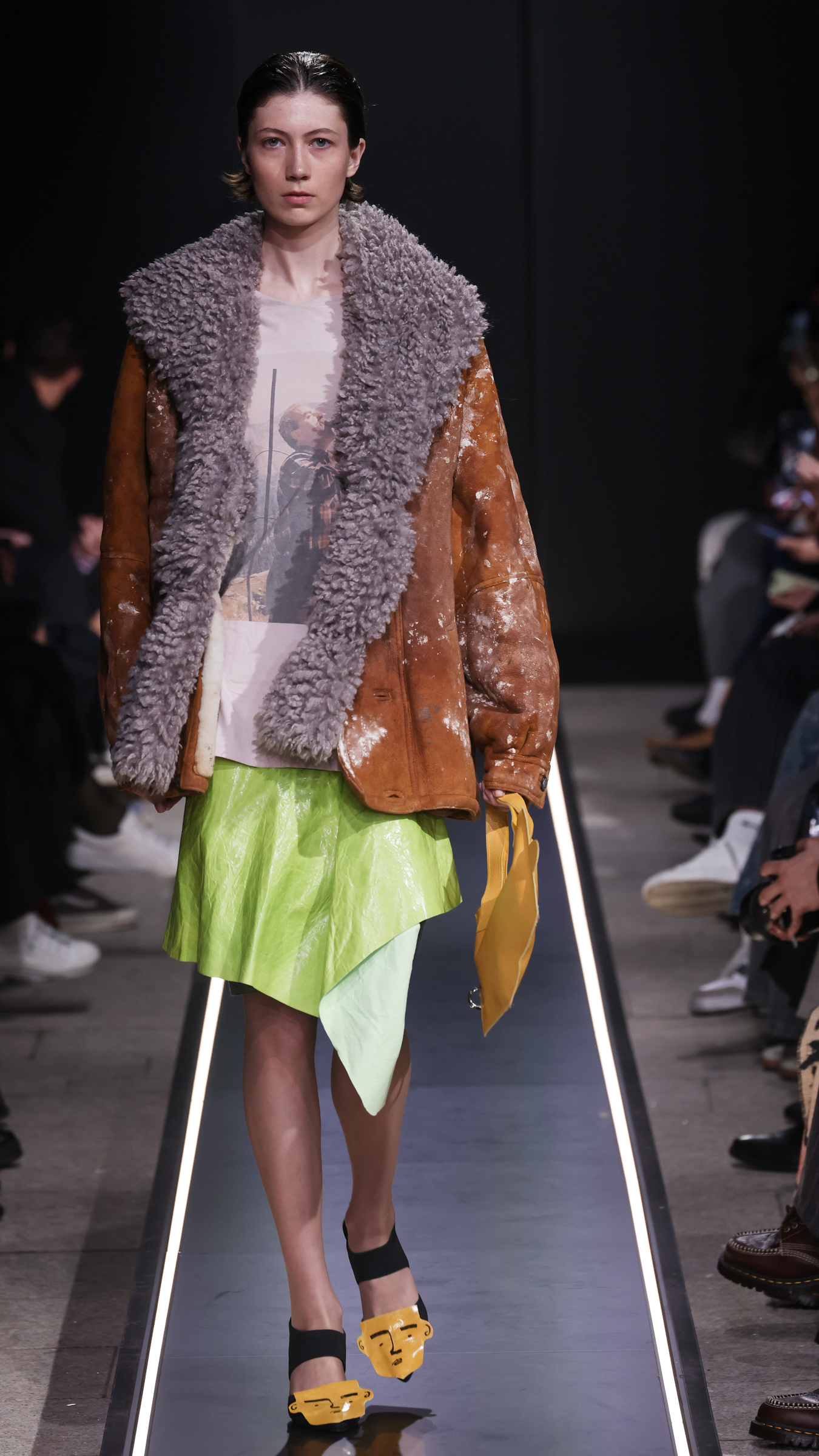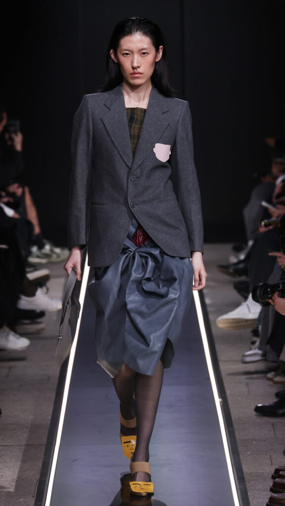 Nostalgia for Miuccia, Hand-graffitied, shiny PVC skinny jeans, Glove shoes, feathered shoes, lingerie boots and fur boots, and cracker boy shoes. Asthma inhaler earrings and hand-painted leather earrings, Tailored men’s suits with bow tie shorts, Eighteenth-century leather tutus, Hand-stained dressesFirstly, I would like to thank Linea Pelle and Unico for making this show possible and for their support over the past few months while I was researching materials and organising the collection. Special thanks go to Fulvia Bacchi, who believes in the new generation of creatives and supports us. Thank you once again to Carlo Capasa and the National Chamber of Italian Fashion for making all this possible by believing in independent entities such as Simon Cracker, which, despite facing challenges, feel compelled to share their story and offer an alternative approach to fashion. Thanks also to Camera Moda Fashion Trust, which assists, advises and fights for those who are still marginalised within the fashion system. Thanks also to the Simon Cracker Crew and the family that keeps the brand alive and authentic by reflecting the times we are living in in the best possible way.