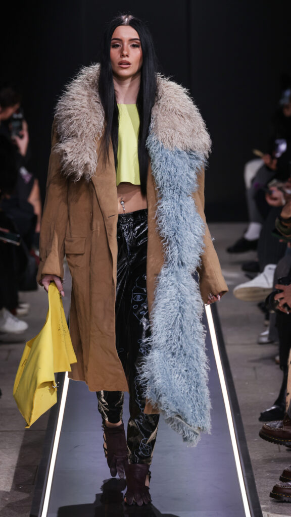 The Collection: Clothes joined together by piercings, Garments assembled without electricity, constructed like puzzles with knots and joints instead of seams, Blazers and coats made from real and recycled multicoloured faux fur, Eighteenth-century silhouettes constructed from leather, Bow/candy skirts, Leather garments with maxi collars that can be worn as capes, Real and faux fur combined with cat tapestries to create a king’s cloak, Multicoloured recycled fur collars, also available in a vegan version for workwear Leather bags with earrings.