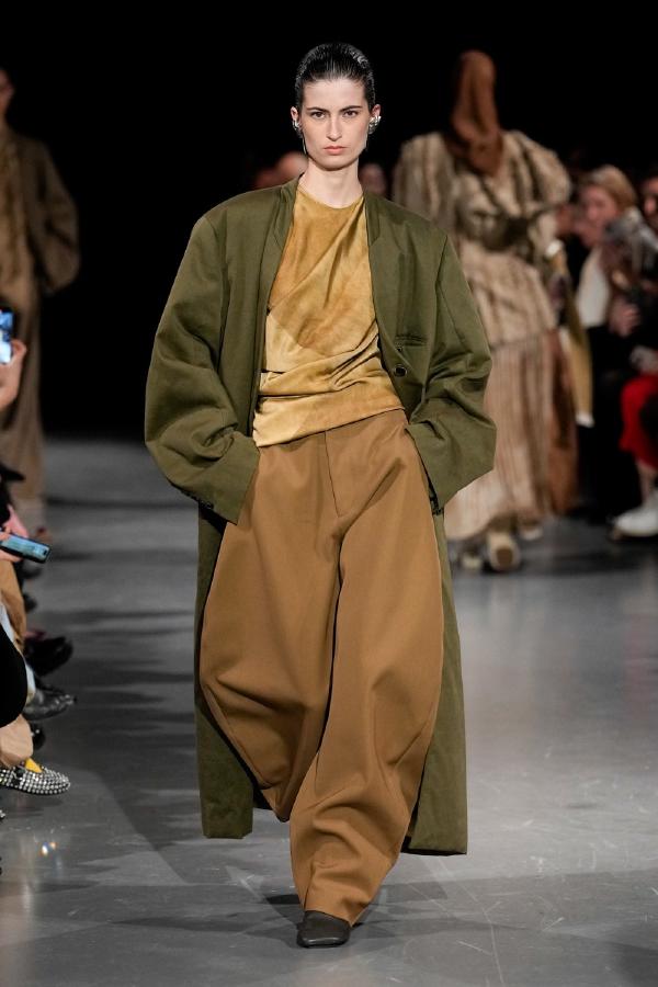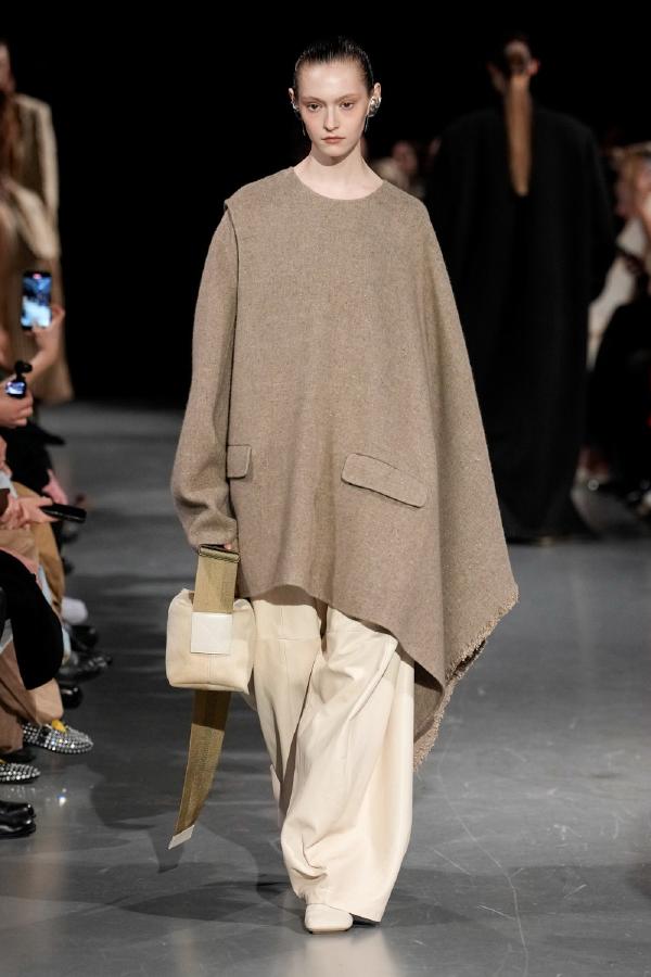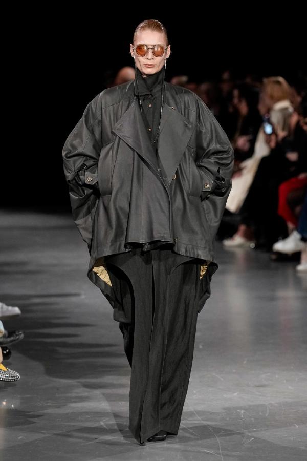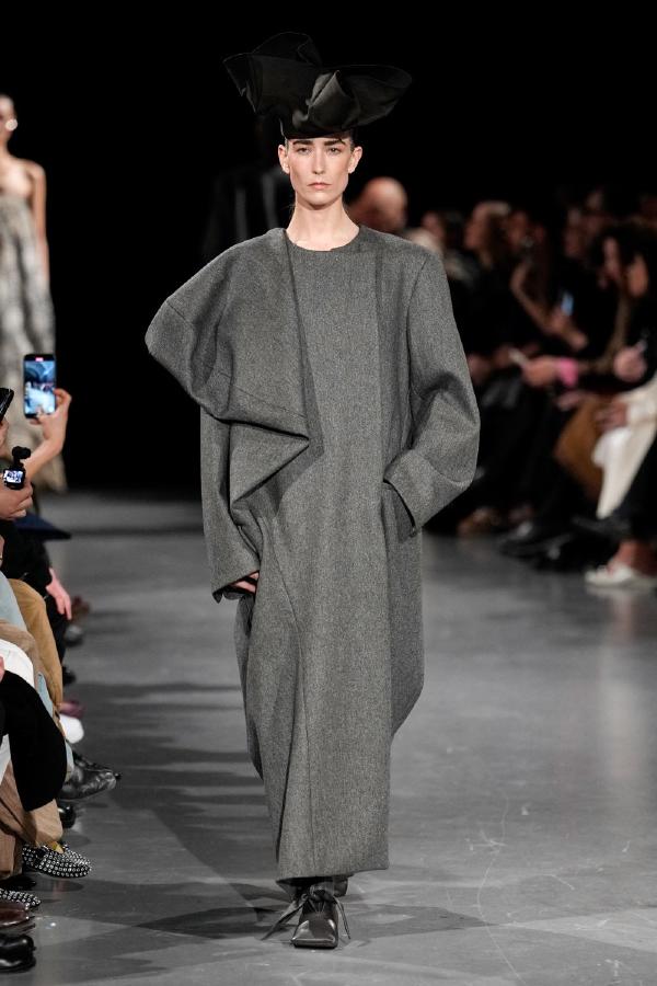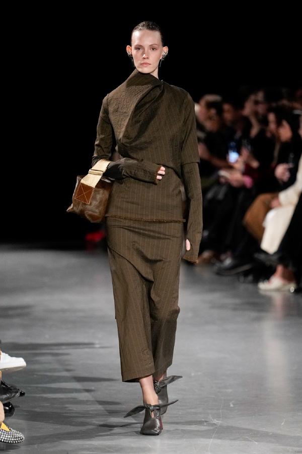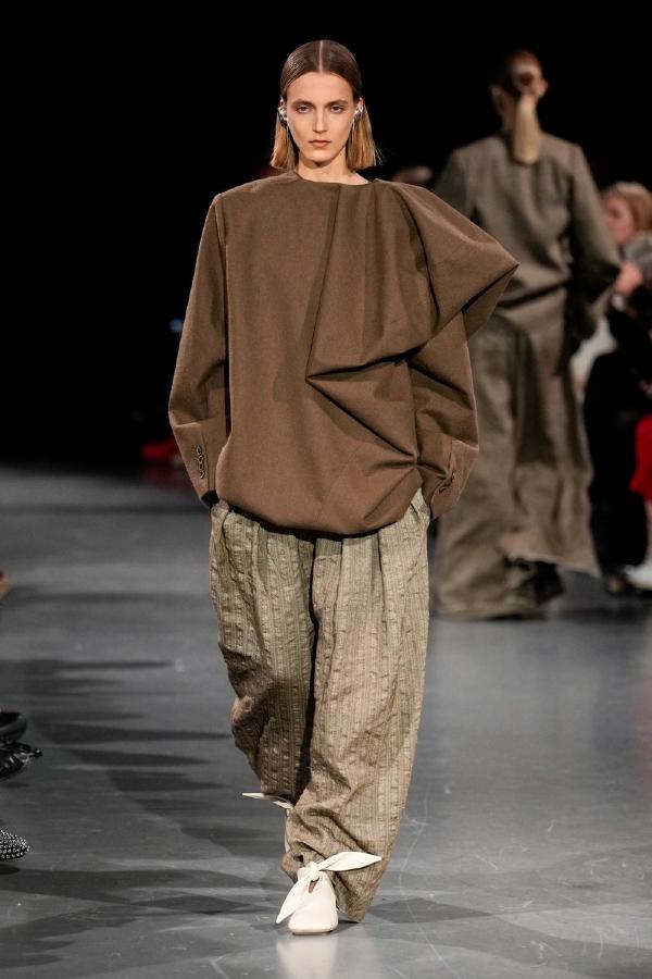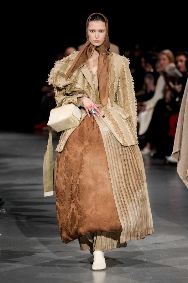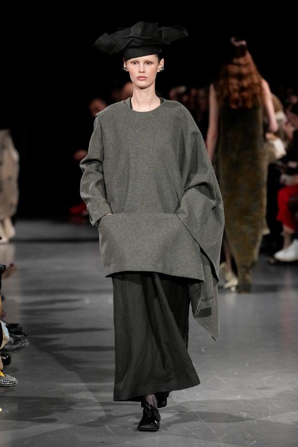 Details of Uma Wang Fall/Winter 2025, Nipping the waist, inflating the hips or the back, elongating the whole body, enlarging or reducing the shoulders, tying a bow happen now, happened in the past, and will happen in the future. These actions are at the core of this collection. The thought process originated in Piero della Francesca’s Madonna del parto, in the well-wishing symbolism of the proudly protruding pregnant belly, and evolved in a cross-historical study on femininity through sculptural volume, gracious fluidity, abstraction and poise, relying on fabrics that have both weight and lightness, and exploring an expansion of earthy neutrals ending up in black. A silhouette ensues that’s essentially a gracious way to carry oneself.