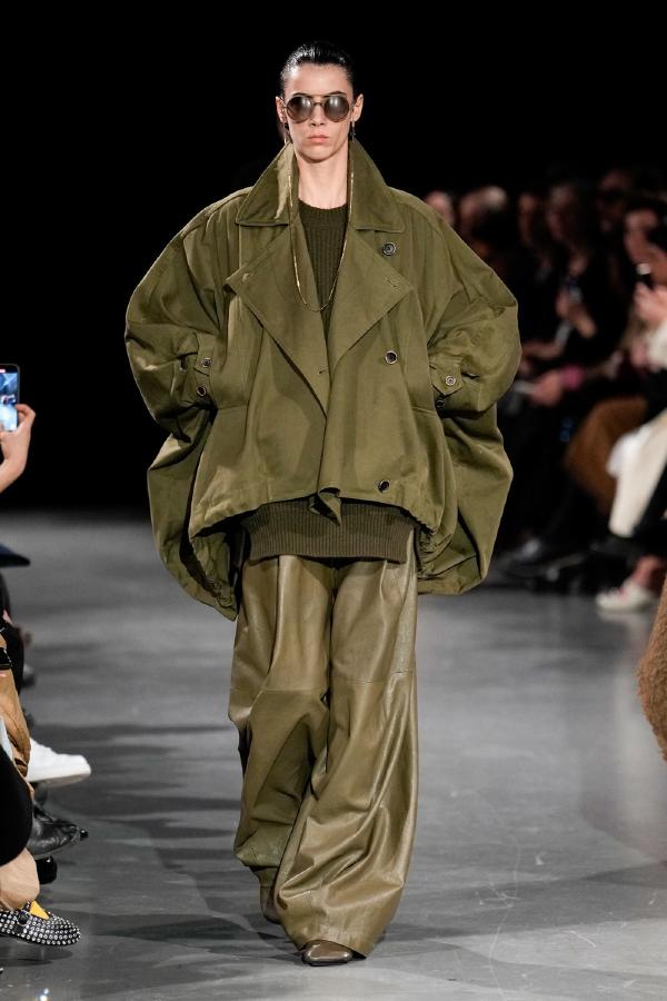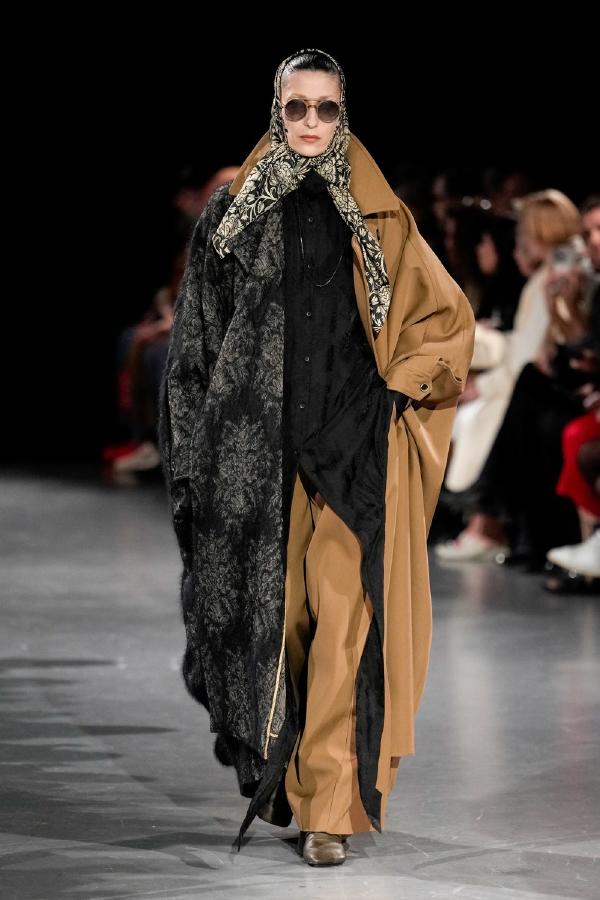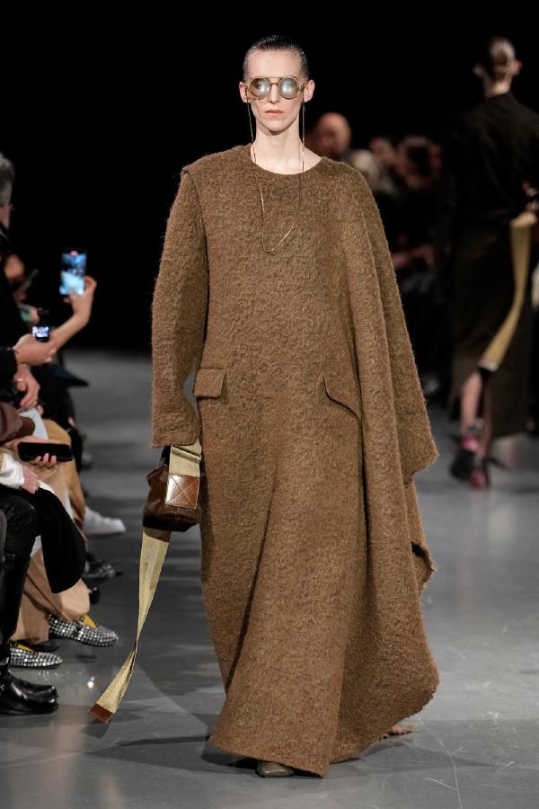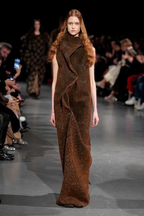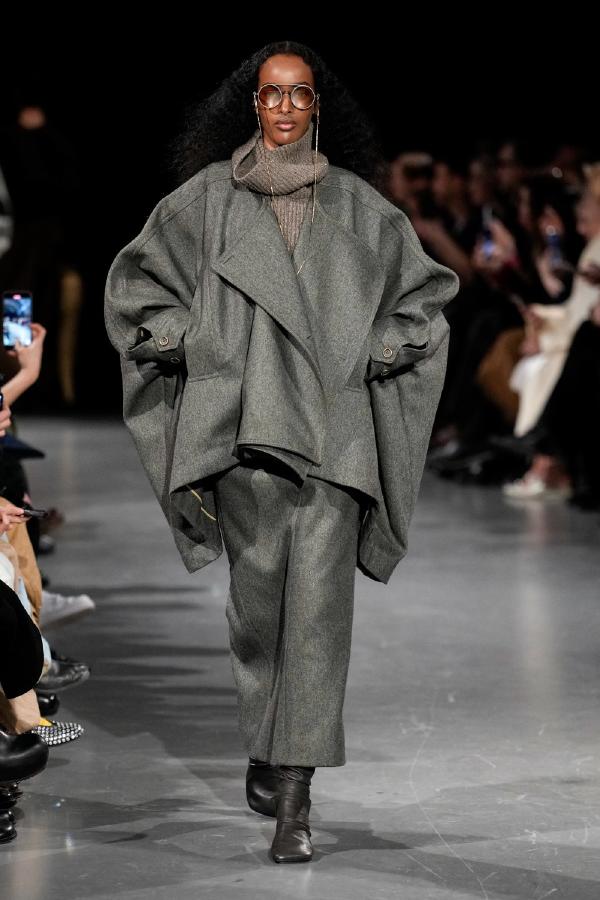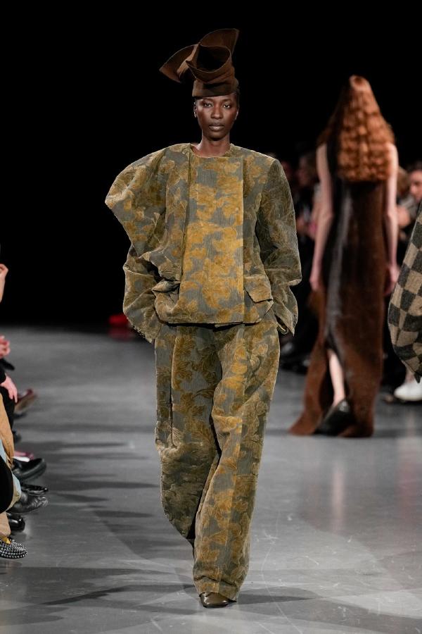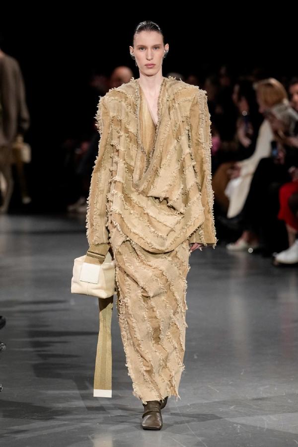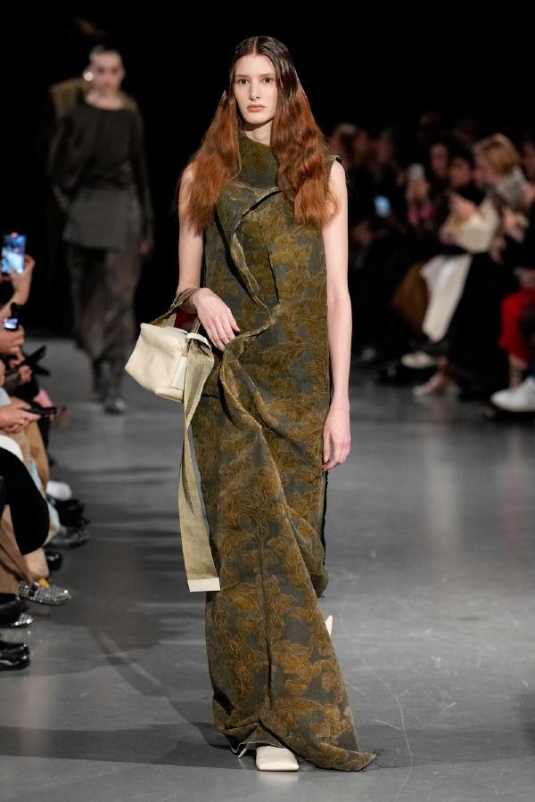 Details of Uma Wang Fall/Winter 2025, Nipping the waist, inflating the hips or the back, elongating the whole body, enlarging or reducing the shoulders, tying a bow happen now, happened in the past, and will happen in the future. These actions are at the core of this collection. The thought process originated in Piero della Francesca’s Madonna del parto, in the well-wishing symbolism of the proudly protruding pregnant belly, and evolved in a cross-historical study on femininity through sculptural volume, gracious fluidity, abstraction and poise, relying on fabrics that have both weight and lightness, and exploring an expansion of earthy neutrals ending up in black. A silhouette ensues that’s essentially a gracious way to carry oneself.