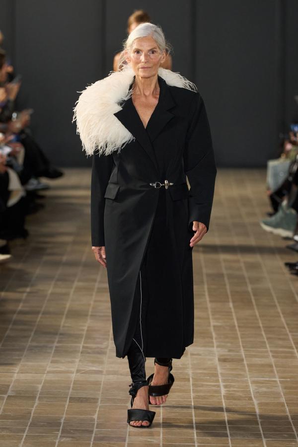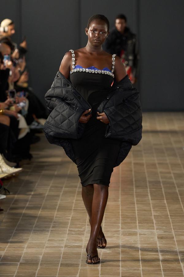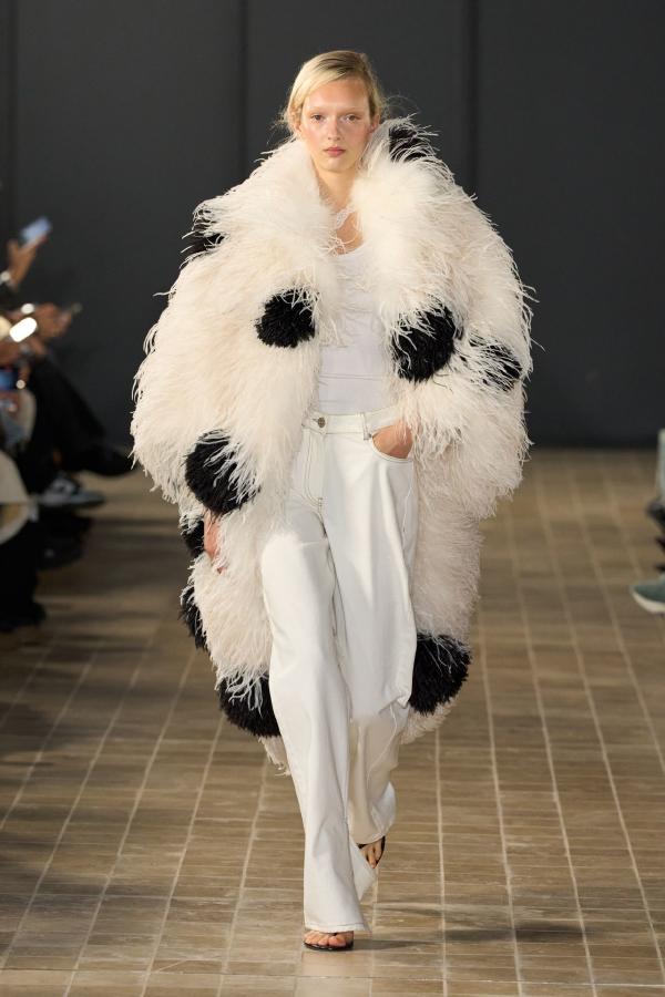 Generosity in volume is further a striking and remarkable feat throughout VAILLANT SS25, while we continuously experience echoes and fragments of a past future – as if imbued with memories, we cannot give up our perpetual quest for new concepts of beauty. We sense an air of romance, emanating from this collection, our paradoxical nostalgia to an almost forgotten futurism: the contemporary exploration of convergence between activewear and sophistication appears entangled, embedded and adorned with feather pompoms, crystal dot prints, maxi Parisian titi bandana, feather stole, rain hat, or cocoon coat.