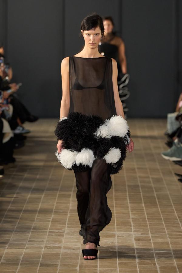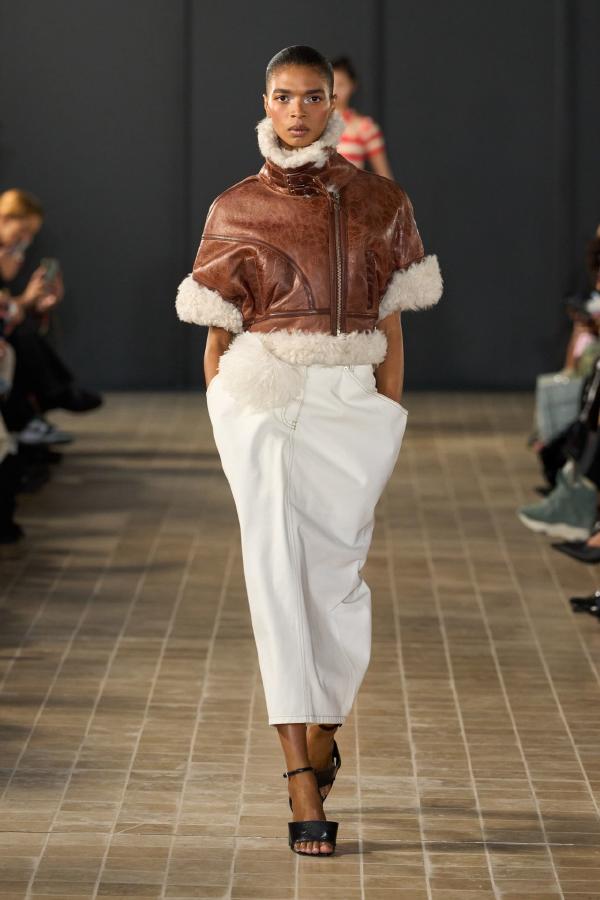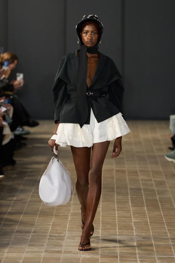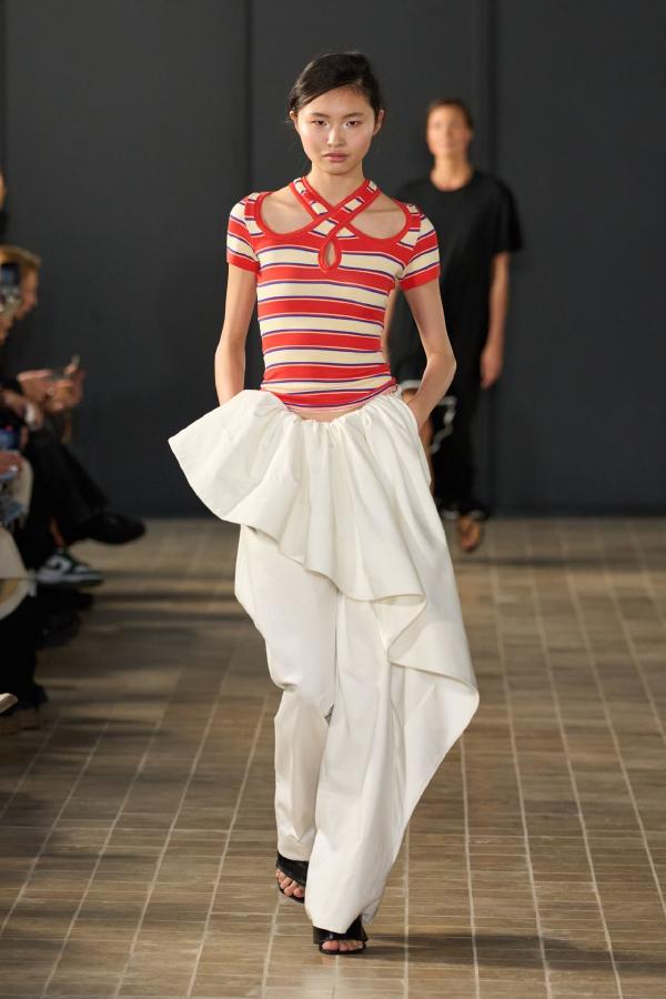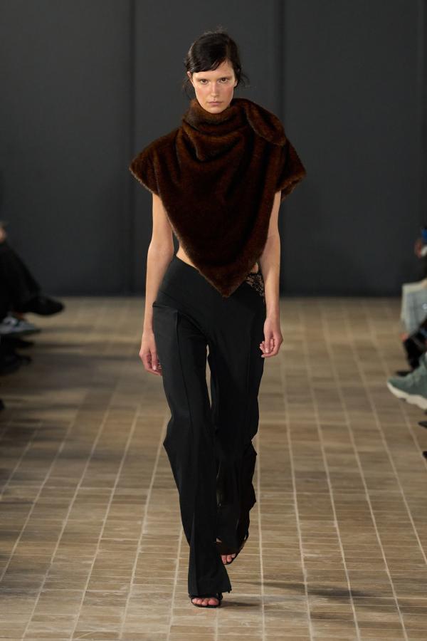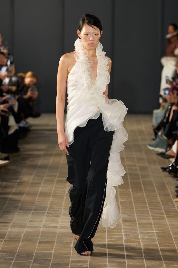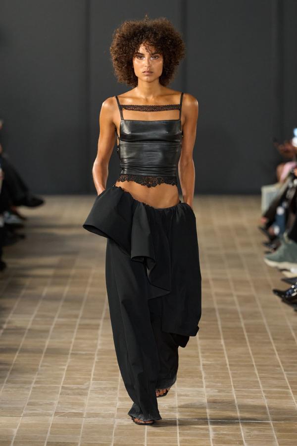 Vaillant Spring/Summer 2024 opening look is exquisite play with textures and volumes, featuring a backless leather top with lace details, strongly contrasting between brawnily firm and ticklishly delicate materials. The look is completed by technical nylon trousers, embellished with an asymmetrical oversized front ruffle, engendering an unparalleled idiosyncratic type of movement.