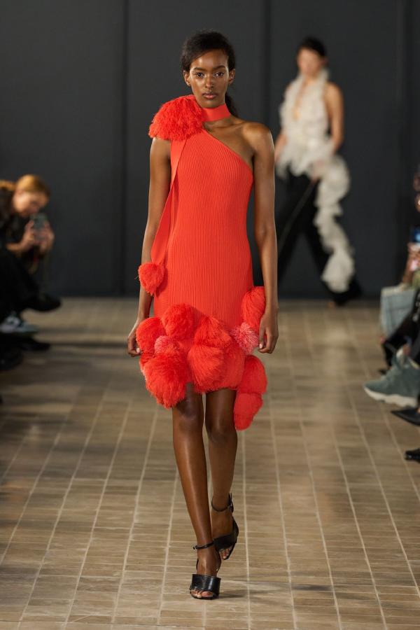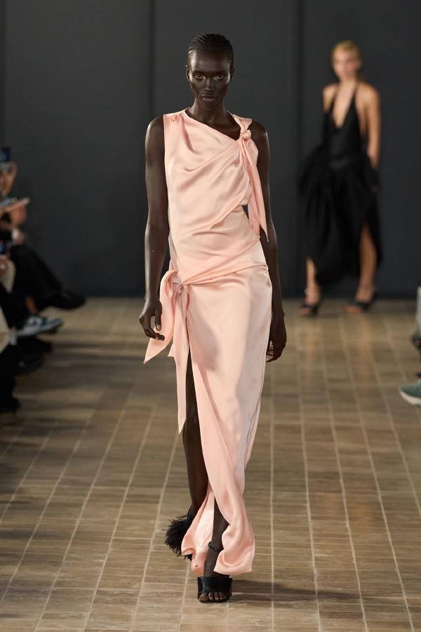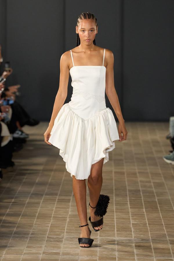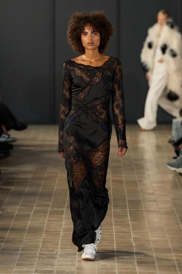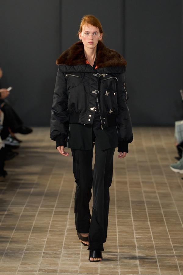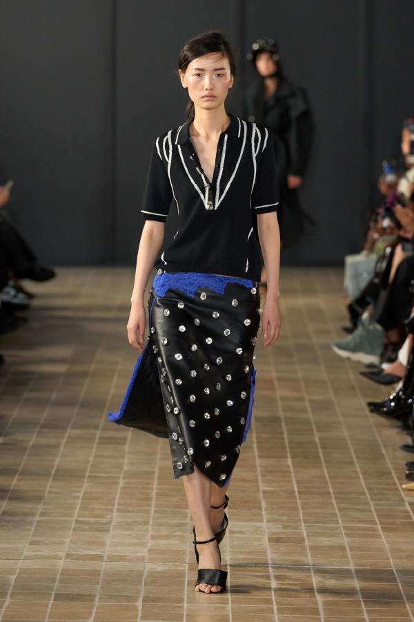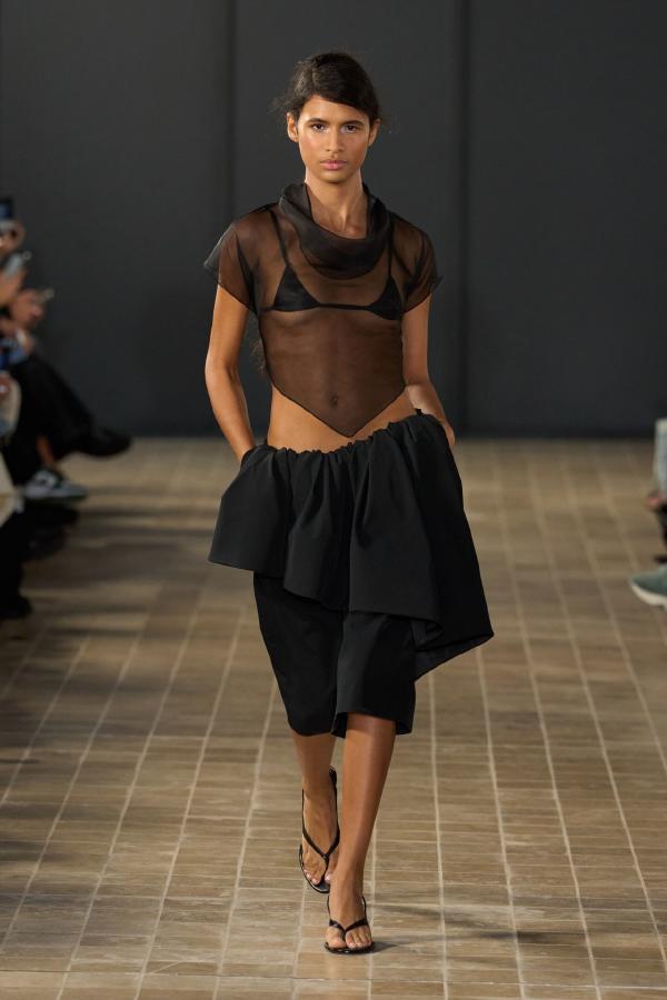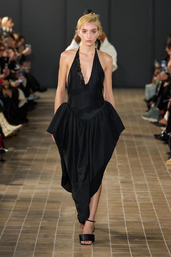 Vaillant Spring/Summer 2024 opening look is exquisite play with textures and volumes, featuring a backless leather top with lace details, strongly contrasting between brawnily firm and ticklishly delicate materials. The look is completed by technical nylon trousers, embellished with an asymmetrical oversized front ruffle, engendering an unparalleled idiosyncratic type of movement.