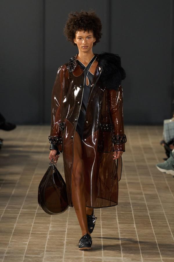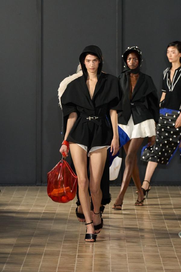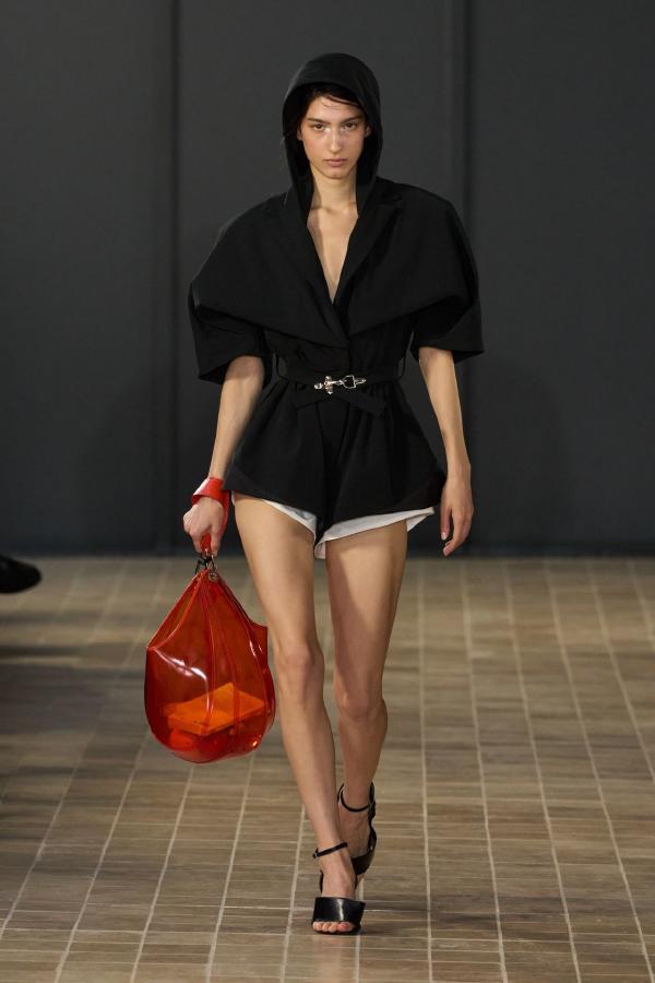 The refined restraint of the tailored jacket makes this an essential piece of the Vaillantes collection. The structured jacket cinches at the waist and flares out significantly at the bottom, playing with considerable volume. It is accessorized with a hood adorned with large rhinestones and a white PVC balloon bag. Pieces inspired by everyday objects like rain hats and supermarket bags, reworked in a play of materials, provide a singular contemporary dimension.