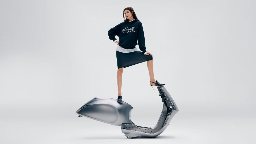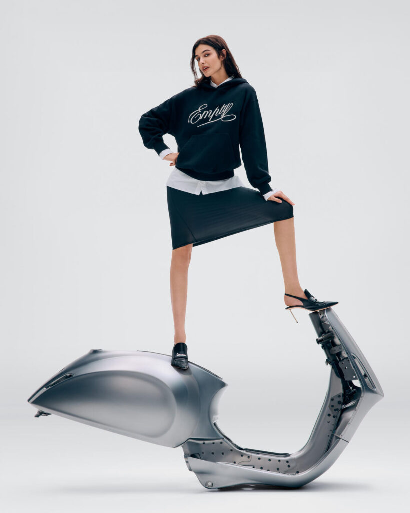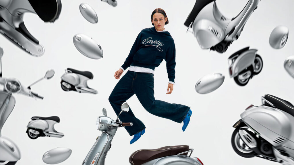 VESPA THE EMPTY SPACE is an extension of the Vespa imaginary, moving from the two-wheel industry into a broader universe that speaks of lifestyle, fashion, experiences, and objects. An invitation to imagine Vespa in all its forms. Vespa has never been just a synonym for mobility. As early as the 1960s, Vespa was already being portrayed in campaigns like the one featuring the slogan “If only we had a Vespa.” In that image, a couple appears to be riding on nothing — the vehicle is not visible, yet it’s unmistakably there, recognized through their posture and gestures. It is from that image that this reflection begins — an idea that distills the past in order to imagine Vespa’s ever-evolving universe.