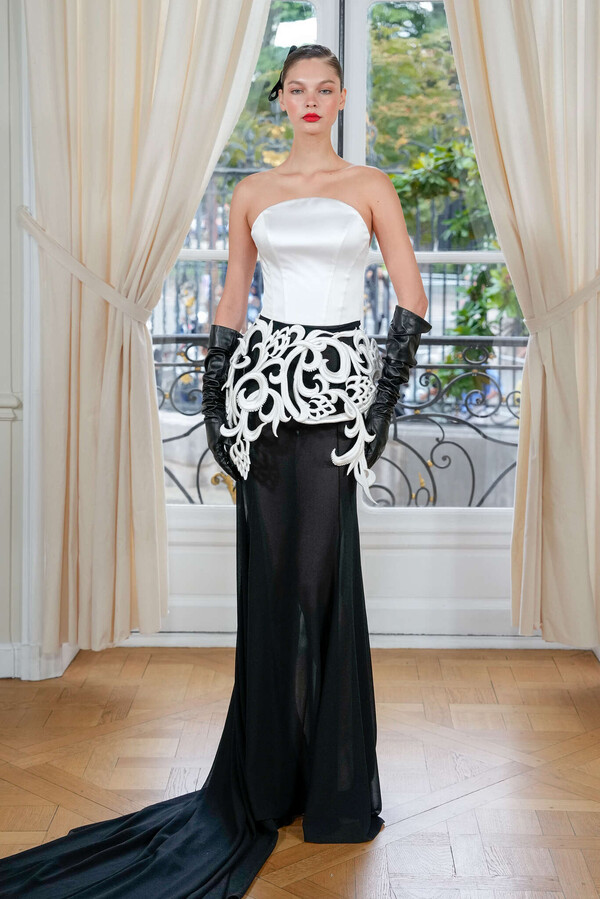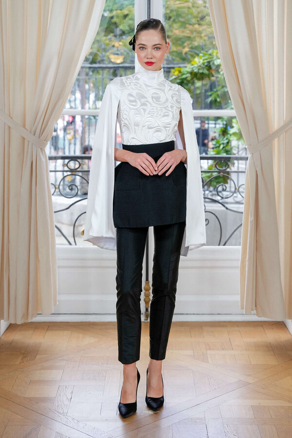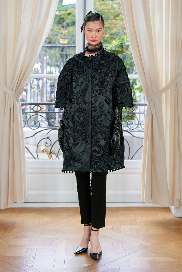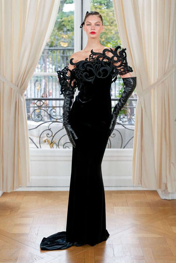 The color palette stays classic and powerful: mostly black and white, sometimes with rich velvet or soft silk. You’ll spot wool suits, airy mesh dresses with delicate flowers, and sculptural shapes that look bold but soft at the same time. There’s a calm confidence in this collection. These are clothes for women who don’t need to shout to be seen. They feel powerful just as they are—graceful, grounded, and full of light.